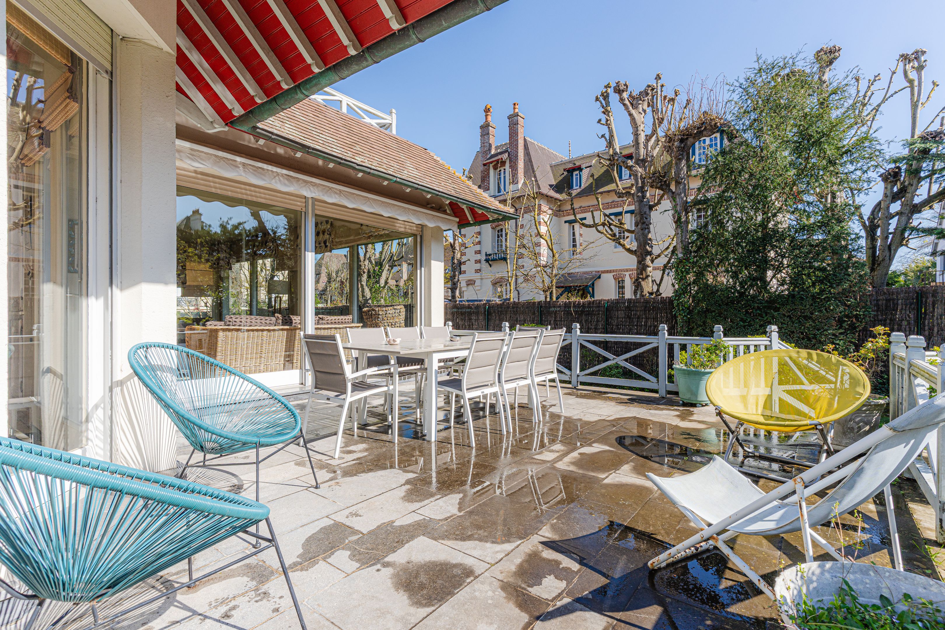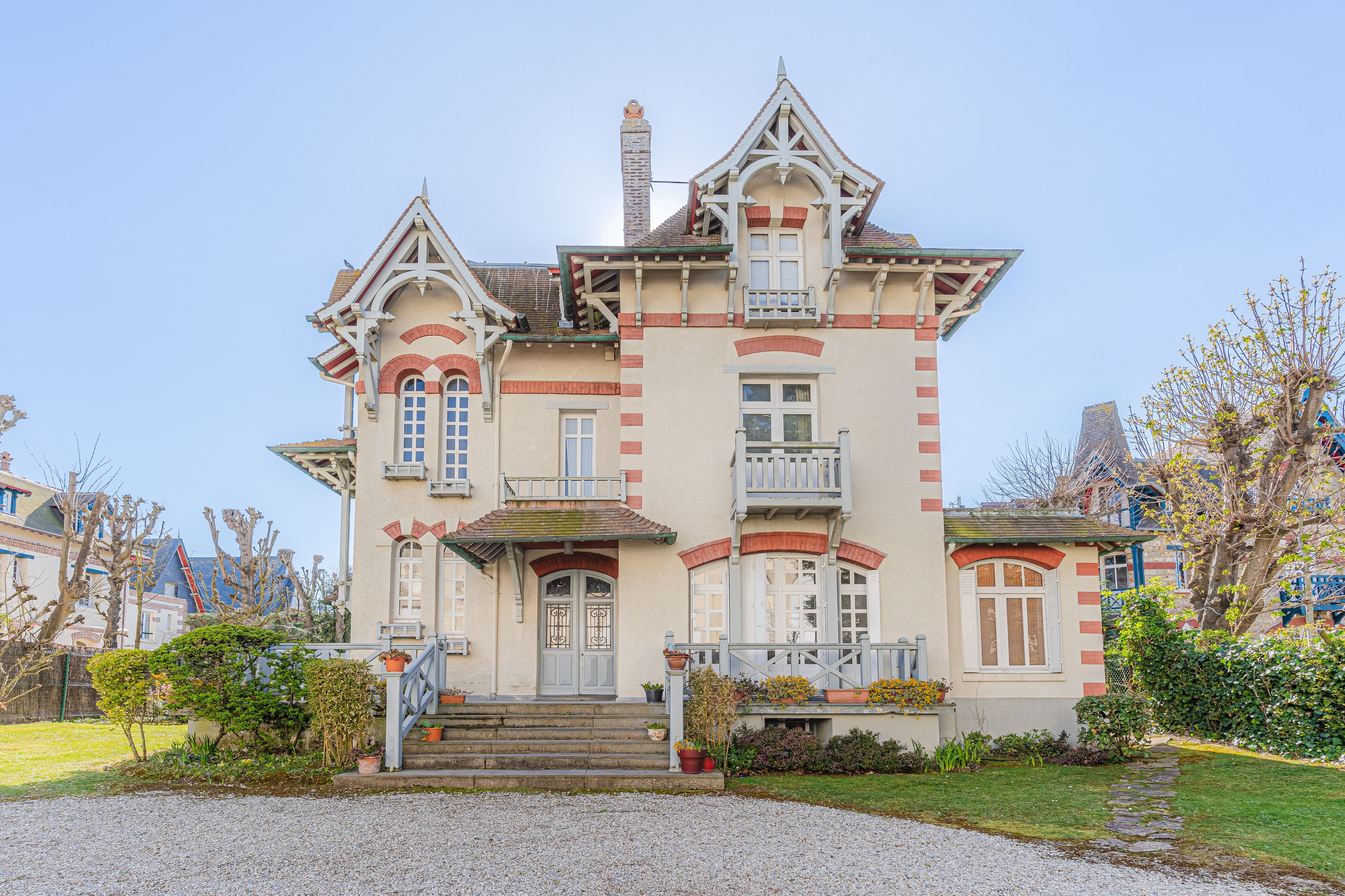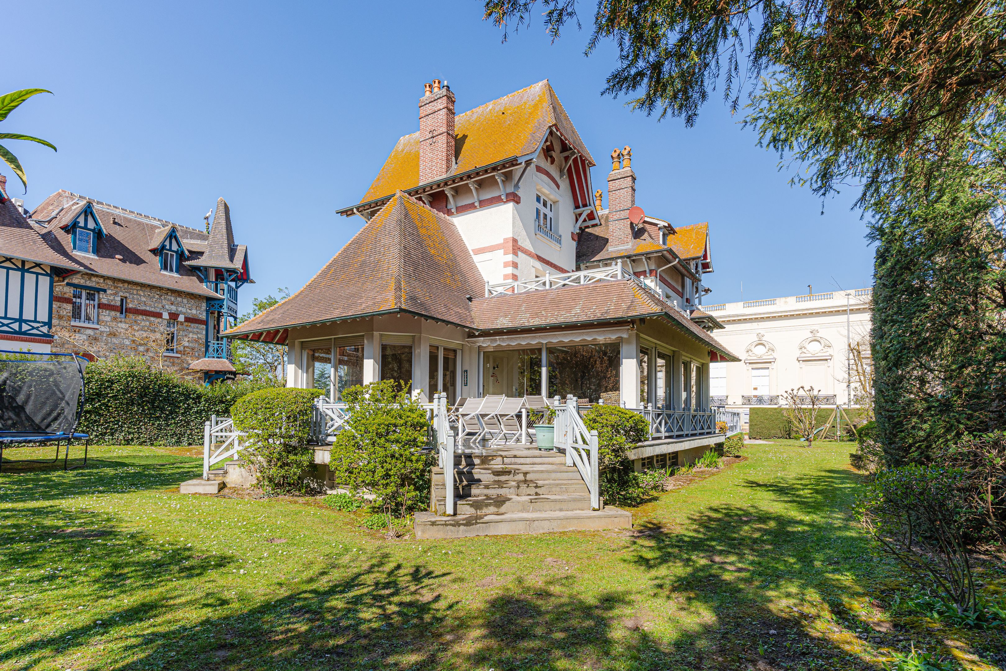 Belle villa à Deauville, au cœur du triangle d’or et dans un secteur particulièrement prisé, proche de la mer et des boutiques, exceptionnelle villa balnéaire de style anglo-normand de 390 m2. Rez-de-chaussée : vaste salon, cuisine spacieuse, salle à manger, petit salon et bureau. Au 1er étage : suite parentale avec salle de bains et terrasse privative, deux chambres avec salle de bains. Au 2è étage : 5 chambres et 2 salles de bains. Au sous sol : buanderie, 2 grandes salles de jeux et de nombreux rangements.