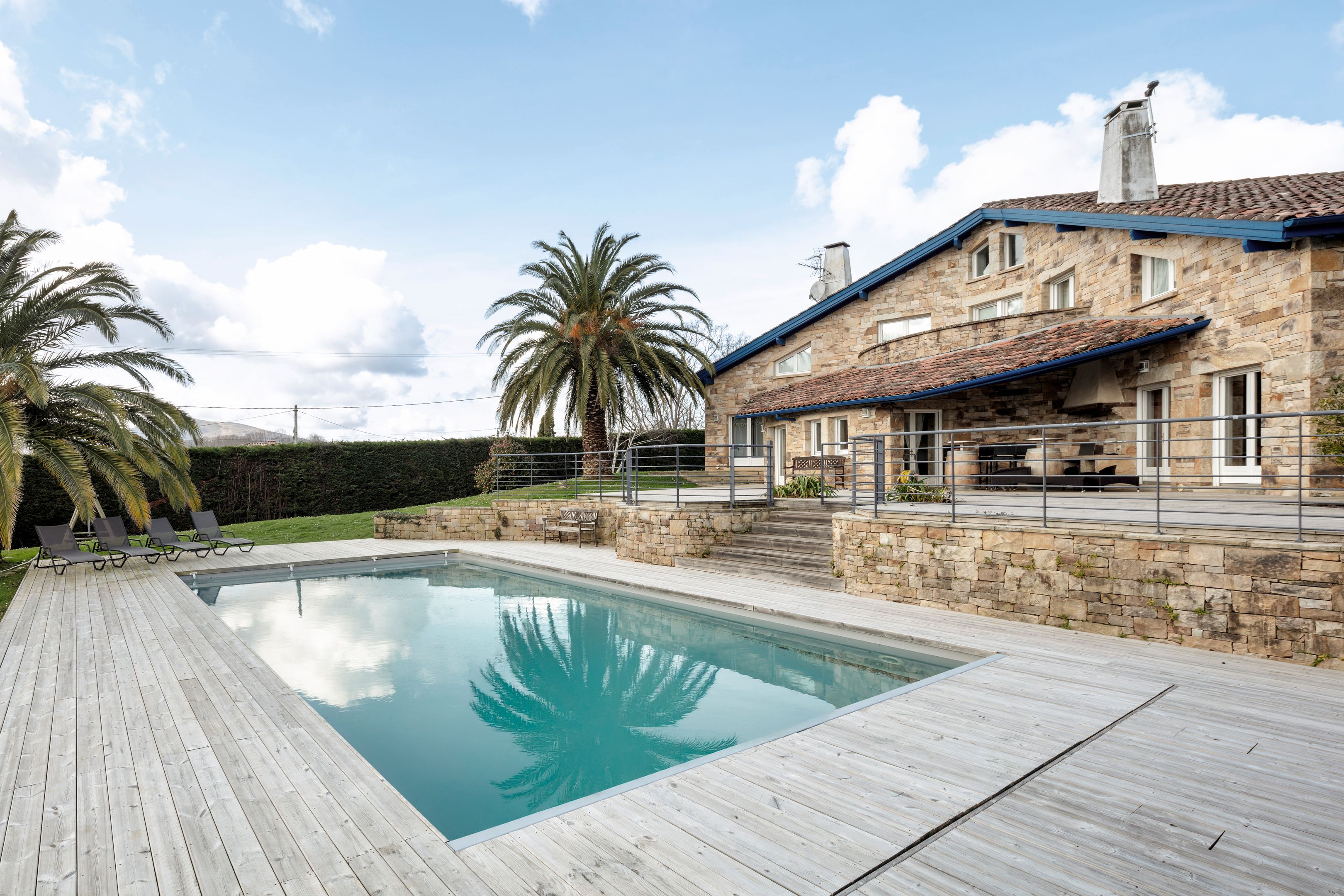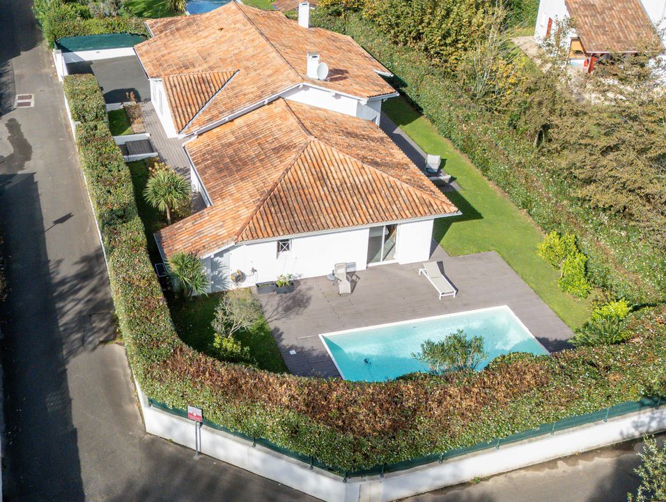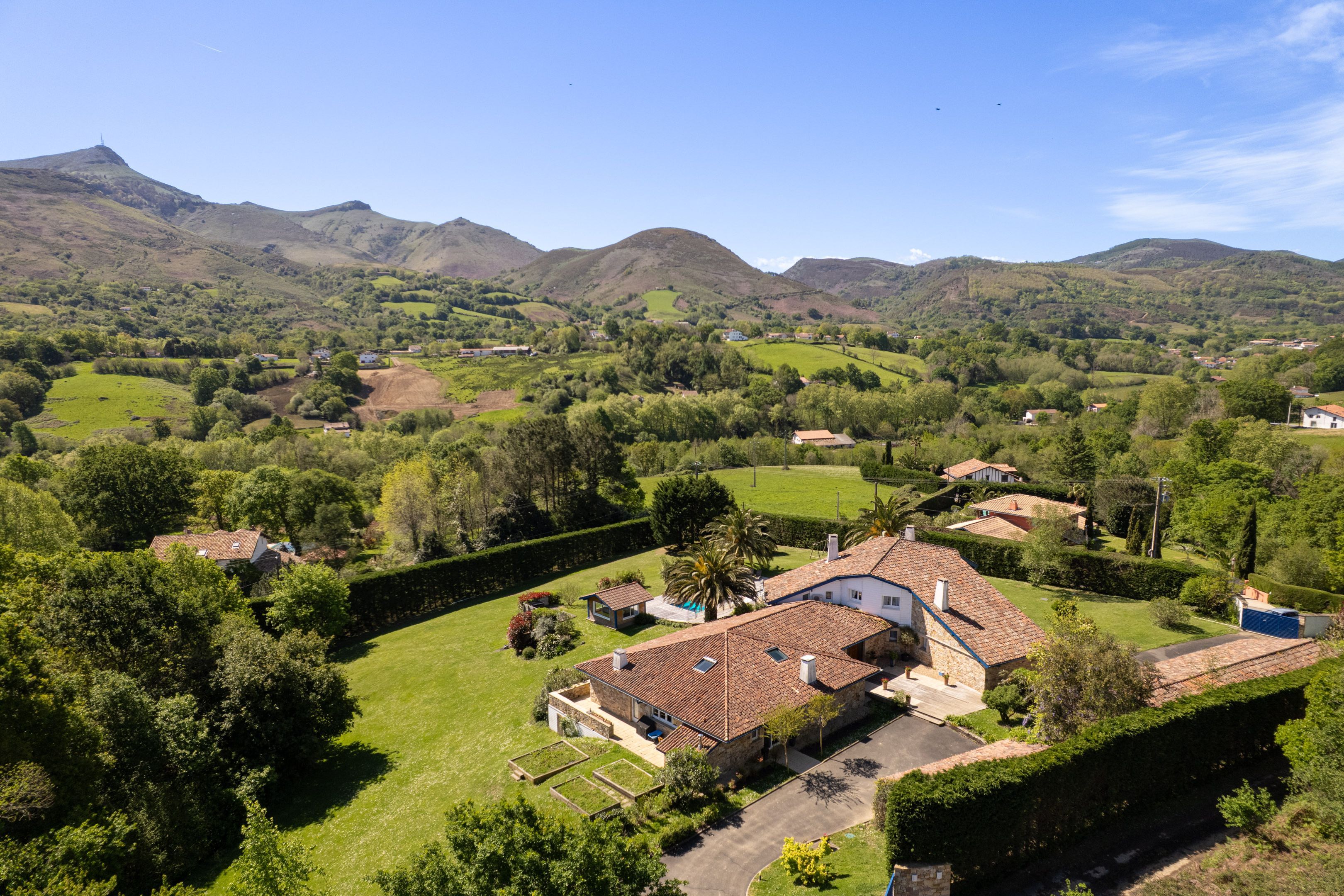 Face à la Rhune, au cœur d'un environnement naturel et calme, propriété aux volumes généreux bordée de vastes terrasses surplombant une piscine chauffée de 11x6 m, profitant d'un parc de 8 000 m². Maison principale comprenant au rez-de-chaussée : une vaste entrée avec rangements, un séjour avec cheminée exposé sud ouvert sur une terrasse, salle à manger avec poêle à bois, spacieuse cuisine avec arrière-cuisine, un deuxième salon avec espace billard, suite parentale avec salle de bains, dressing avec buanderie, bureau, salle de sport et toilettes. À l'étage : trois suites dont deux ouvrant sur une terrasse avec vue panoramique sur les montagnes. Une maison d'amis de 120 m² indépendante : séjour-cuisine ouvert sur l'extérieur, trois chambres, salle d'eau, salle de bains, buanderie et toilettes. Deux garages respectivement de 60 m² et de 40 m², parking extérieur.