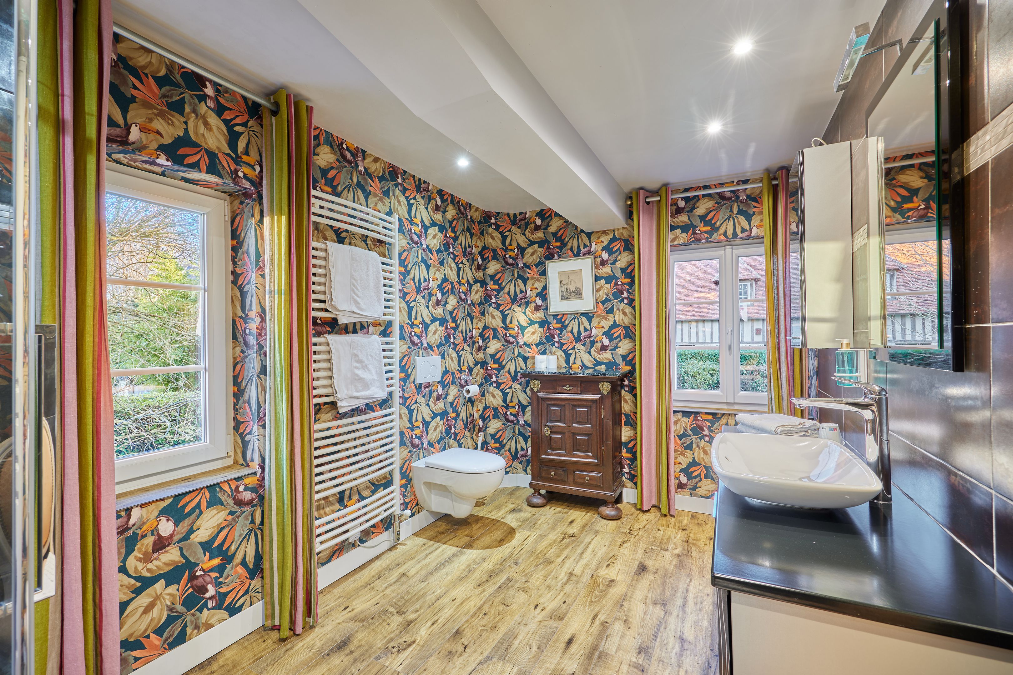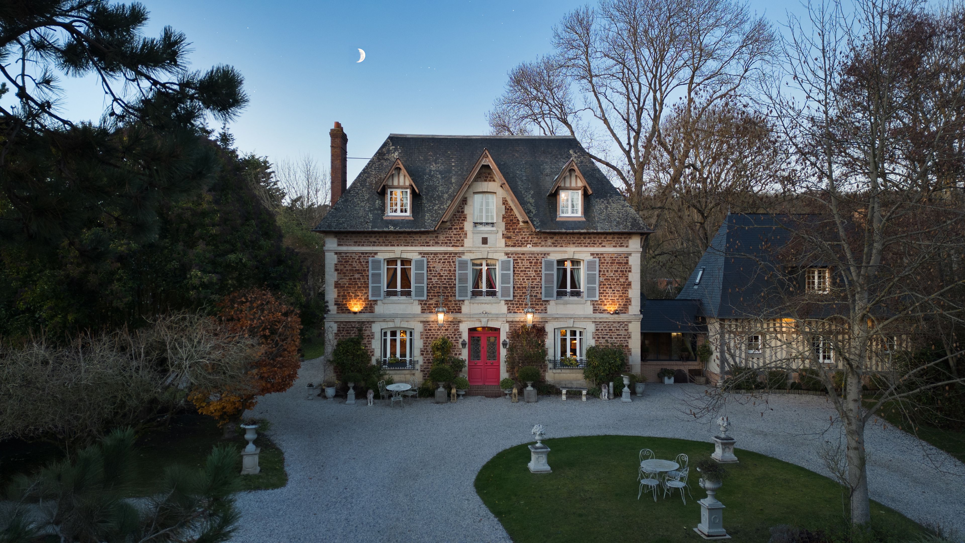 Manoir des années 1900 entièrement rénové avec extension récente, de 324 m² édifié sur 2800 m² de terrain, à moins de 10 min de Deauville. En rez-de-chaussée, entrée desservant salle à manger communiquant à une cuisine aménagée et équipée, spacieux salon. Au 1er étage : trois suites parentales avec salle d'eau, chambre individuelle, buanderie. Au 2ème étage : chambre avec salle d'eau, deux grandes chambres avec salle de bains, espace de rangement. Extension au charme normand pouvant devenir un logement indépendant avec bel espace de vie, chambre, salle de douche et toilettes. Propriété familiale offrant de multiples projets.