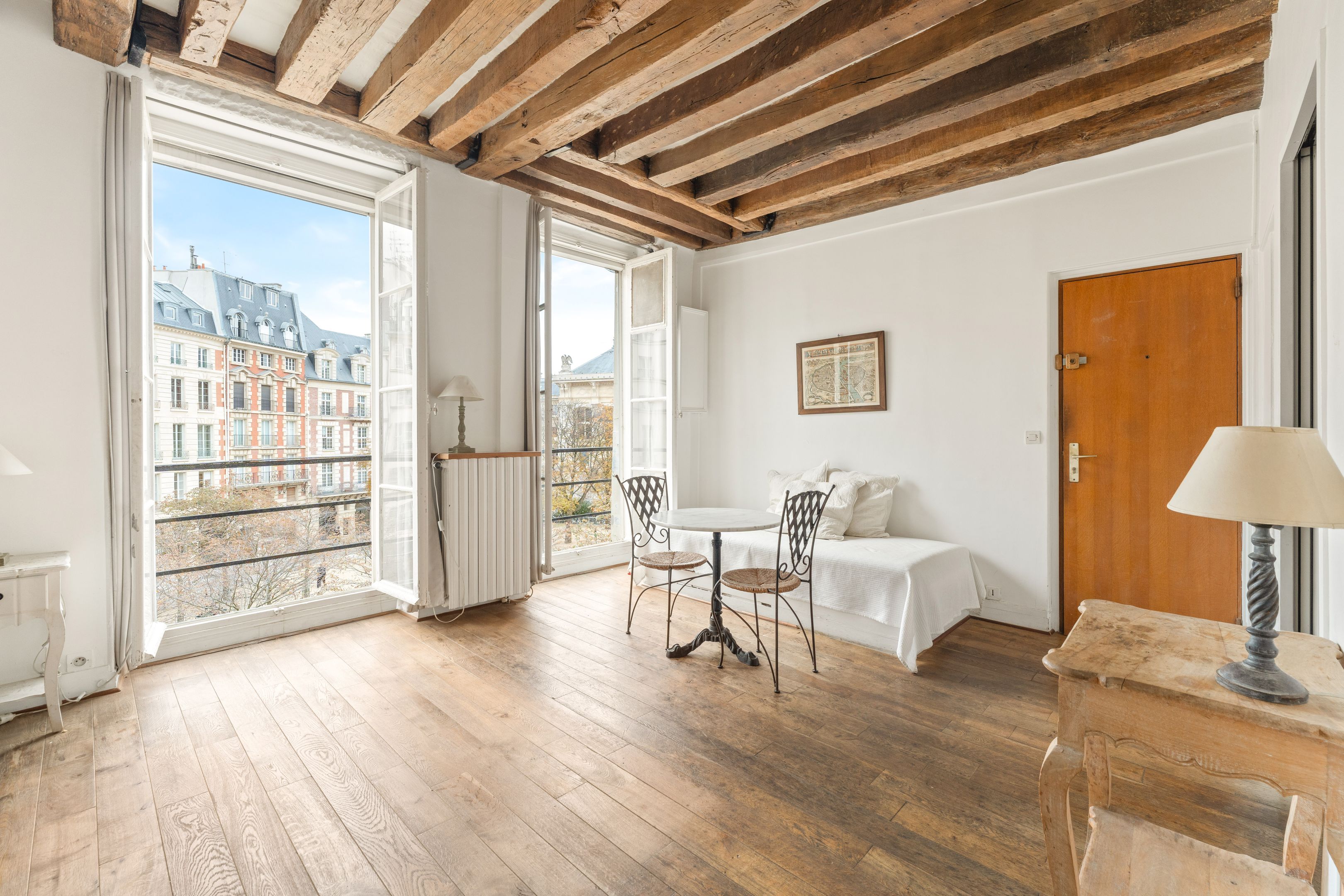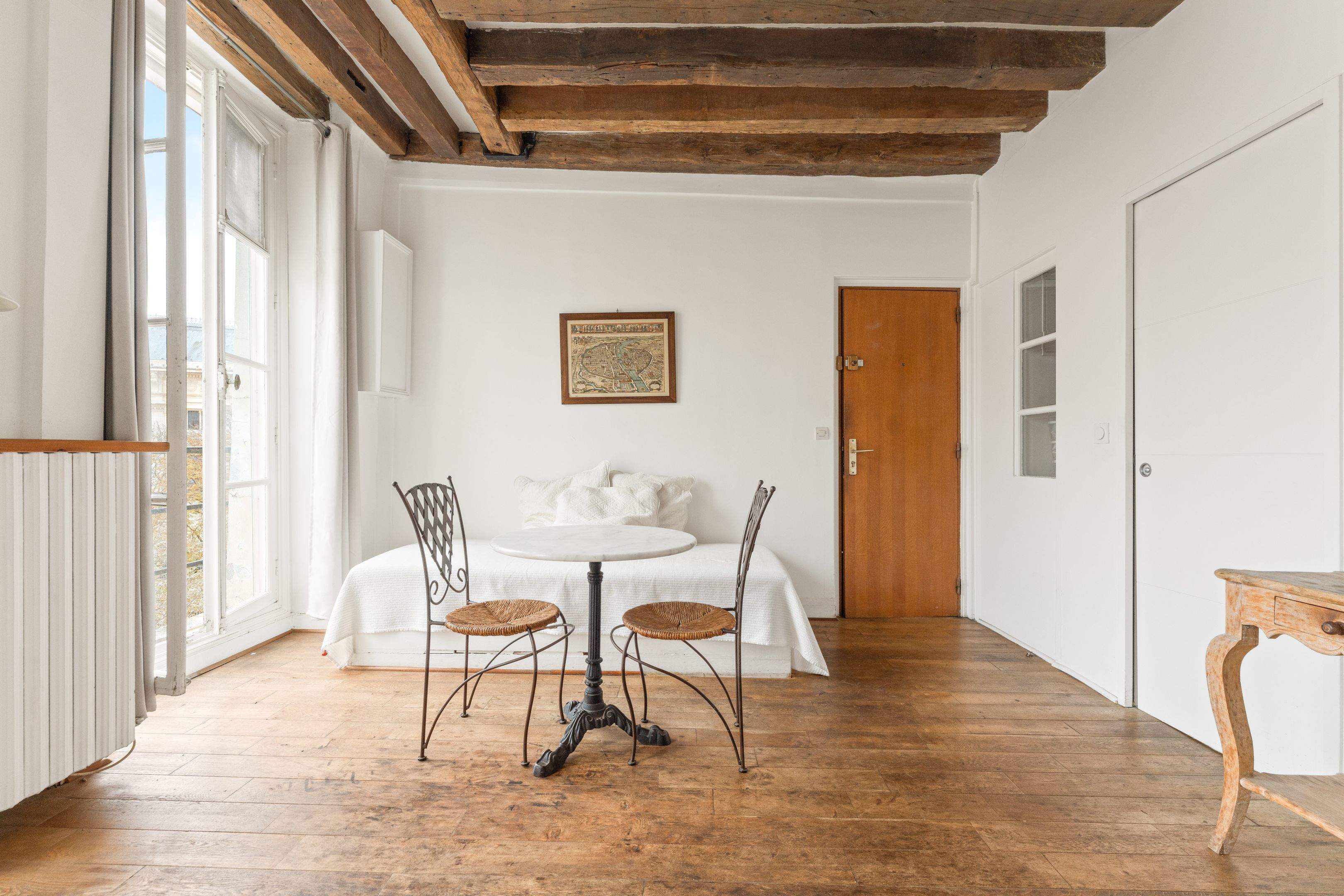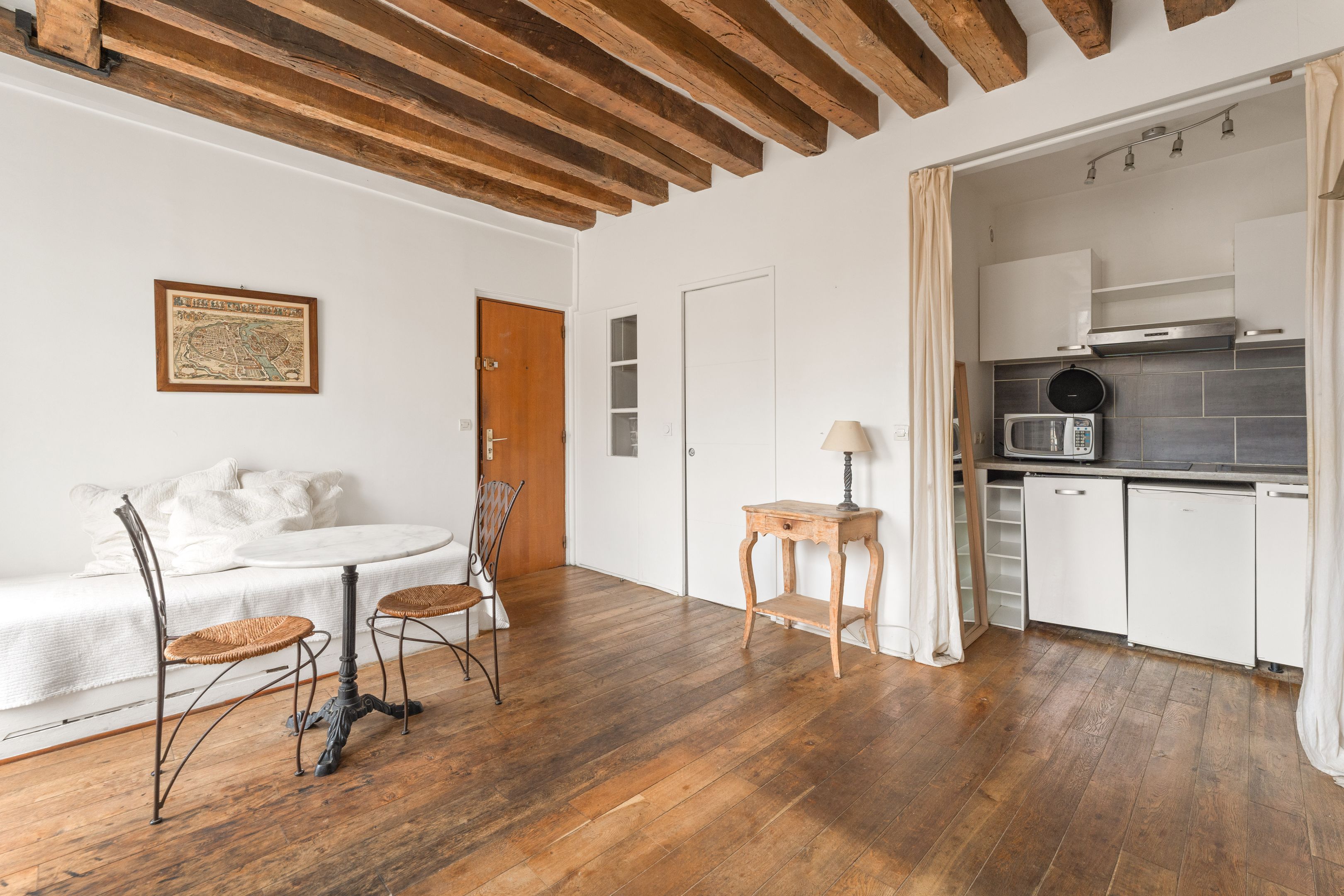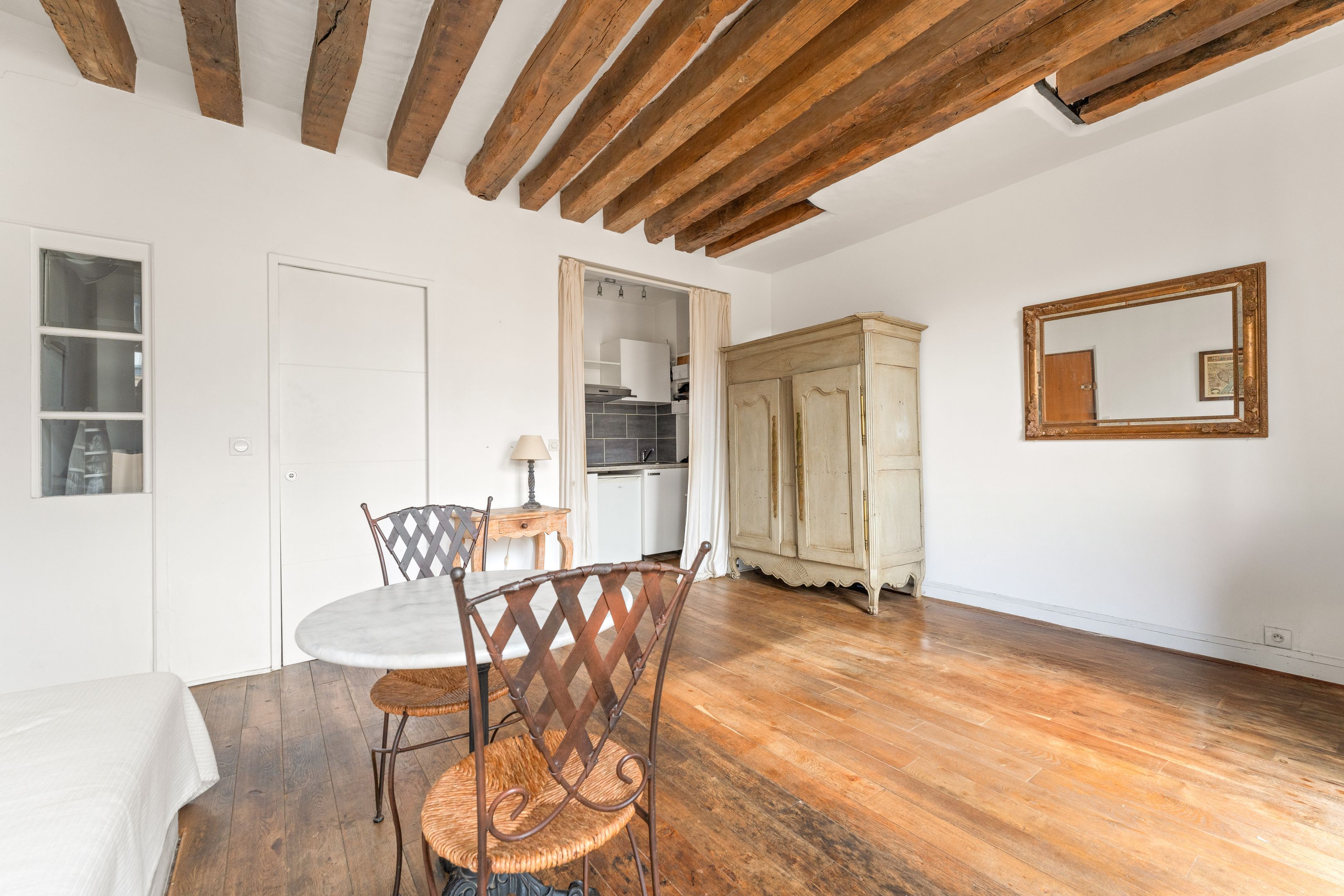 Place Dauphine - Dans un bel immeuble du 15ème siècle bien entretenu, studio en bon état de 23,78m² loi Carrez, bénéficiant d'une superbe vue sur la Place Dauphine, de poutres apparentes et situé au 3ème étage desservi par escalier. Entrée, pièce principale, coin avec cuisine, salle d'eau avec toilettes.