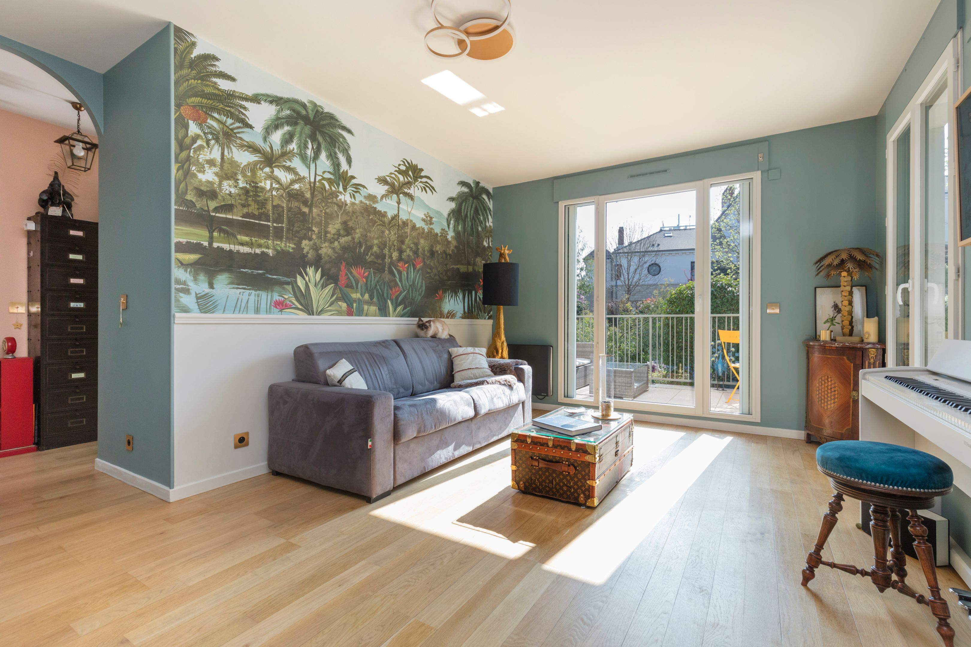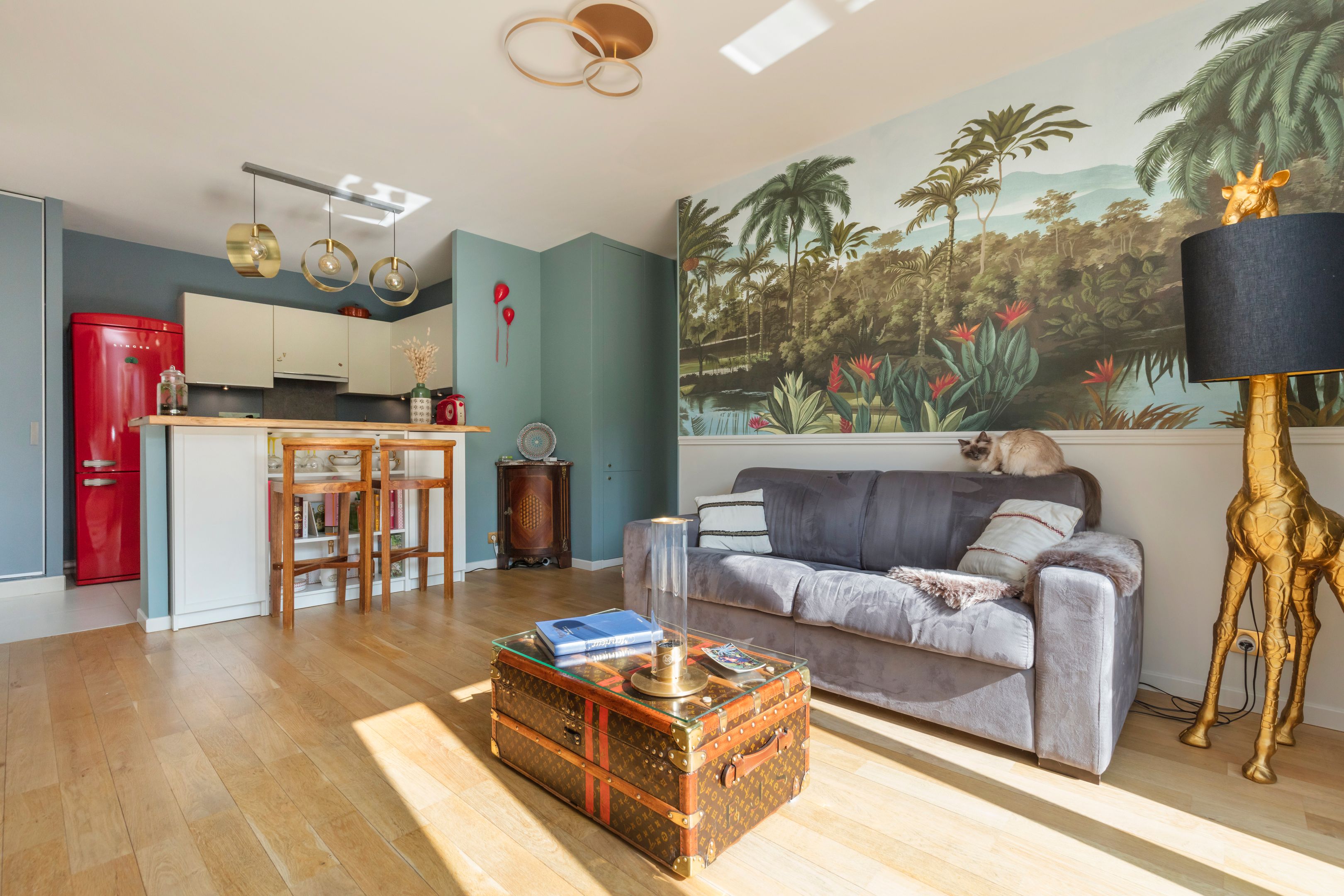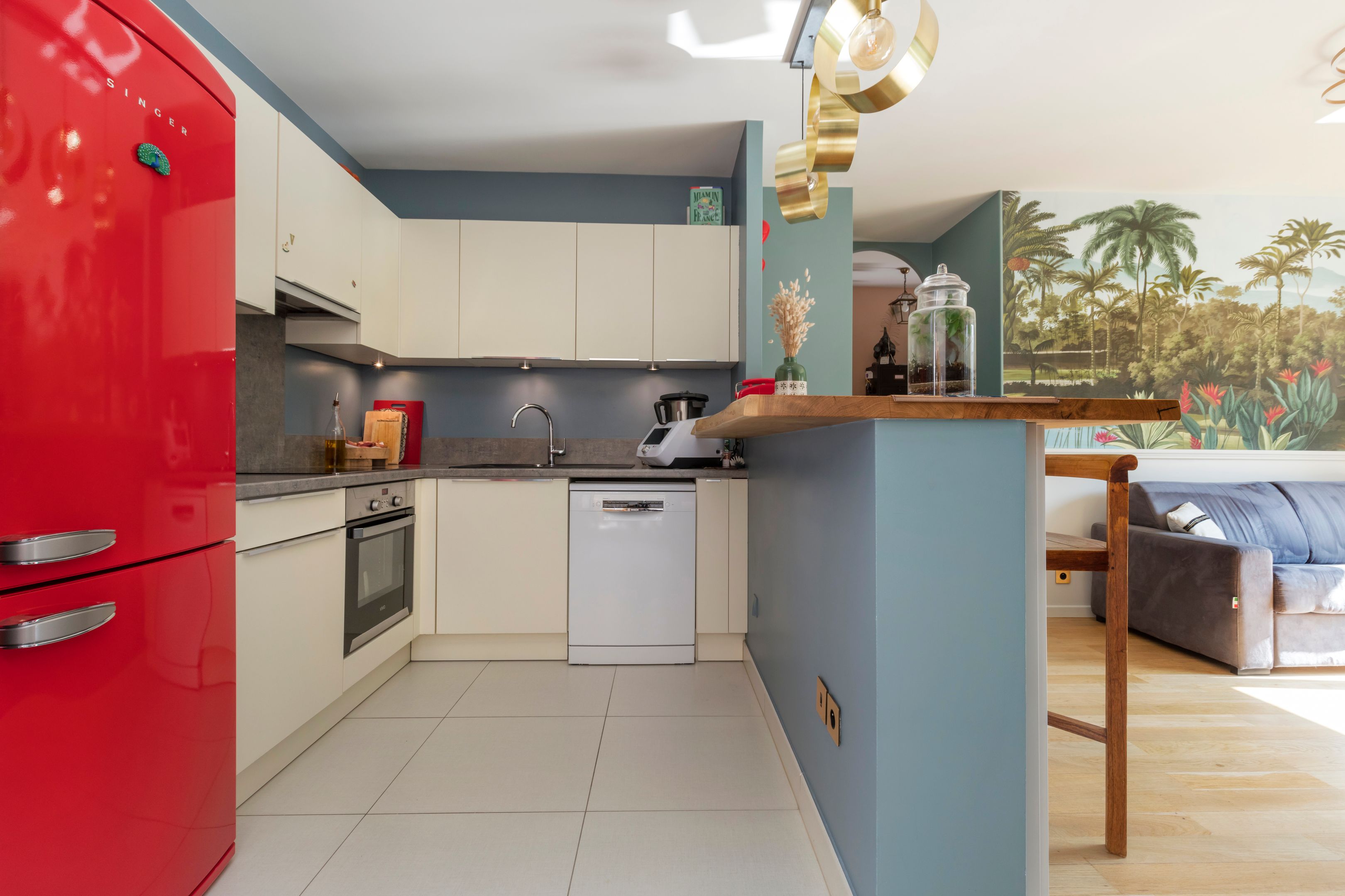 Intérieur raffiné : salon lumineux avec cuisine ouverte moderne, chambre avec papier peint panoramique, salle de bains design, toilettes indépendantes (buanderie et rangements).