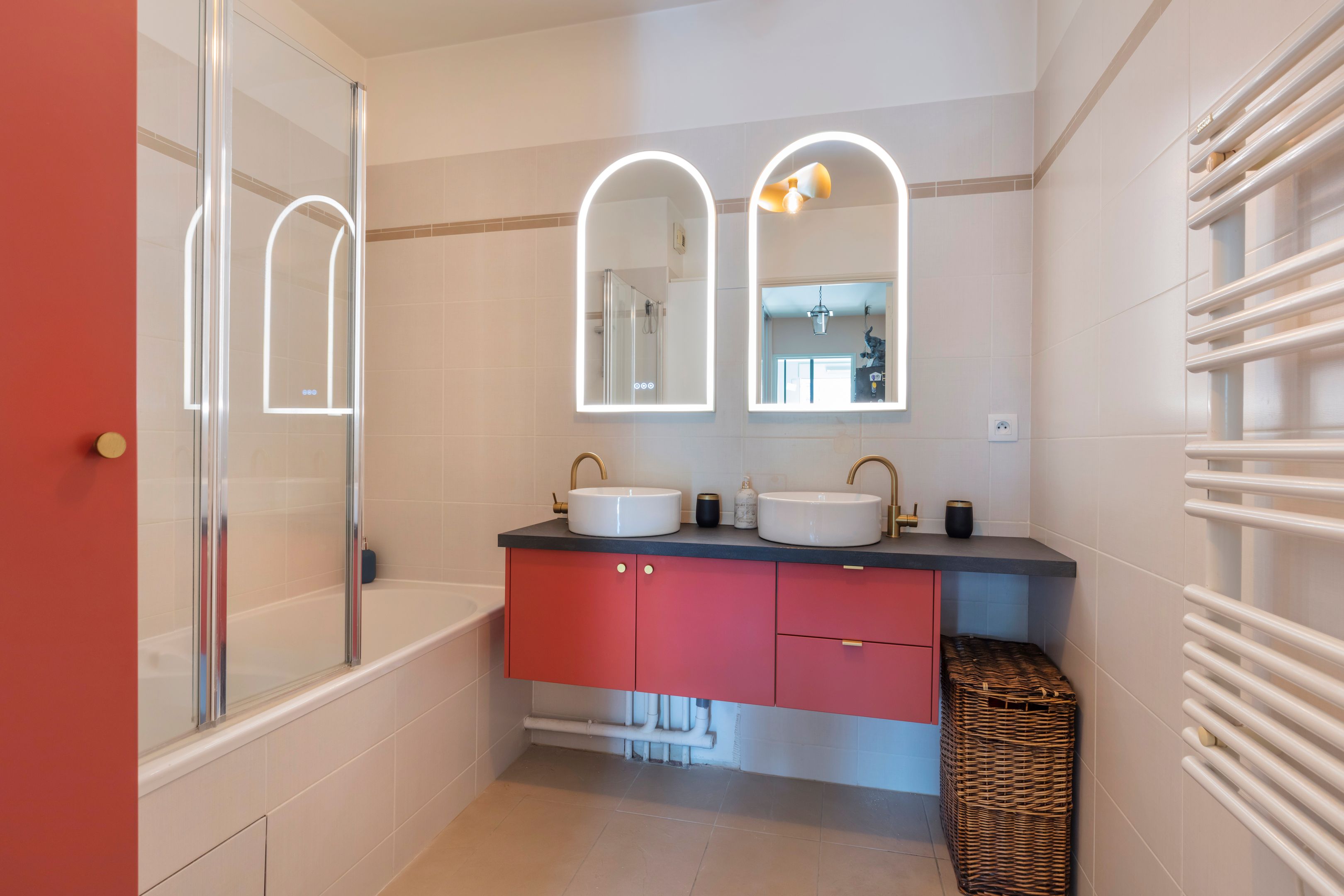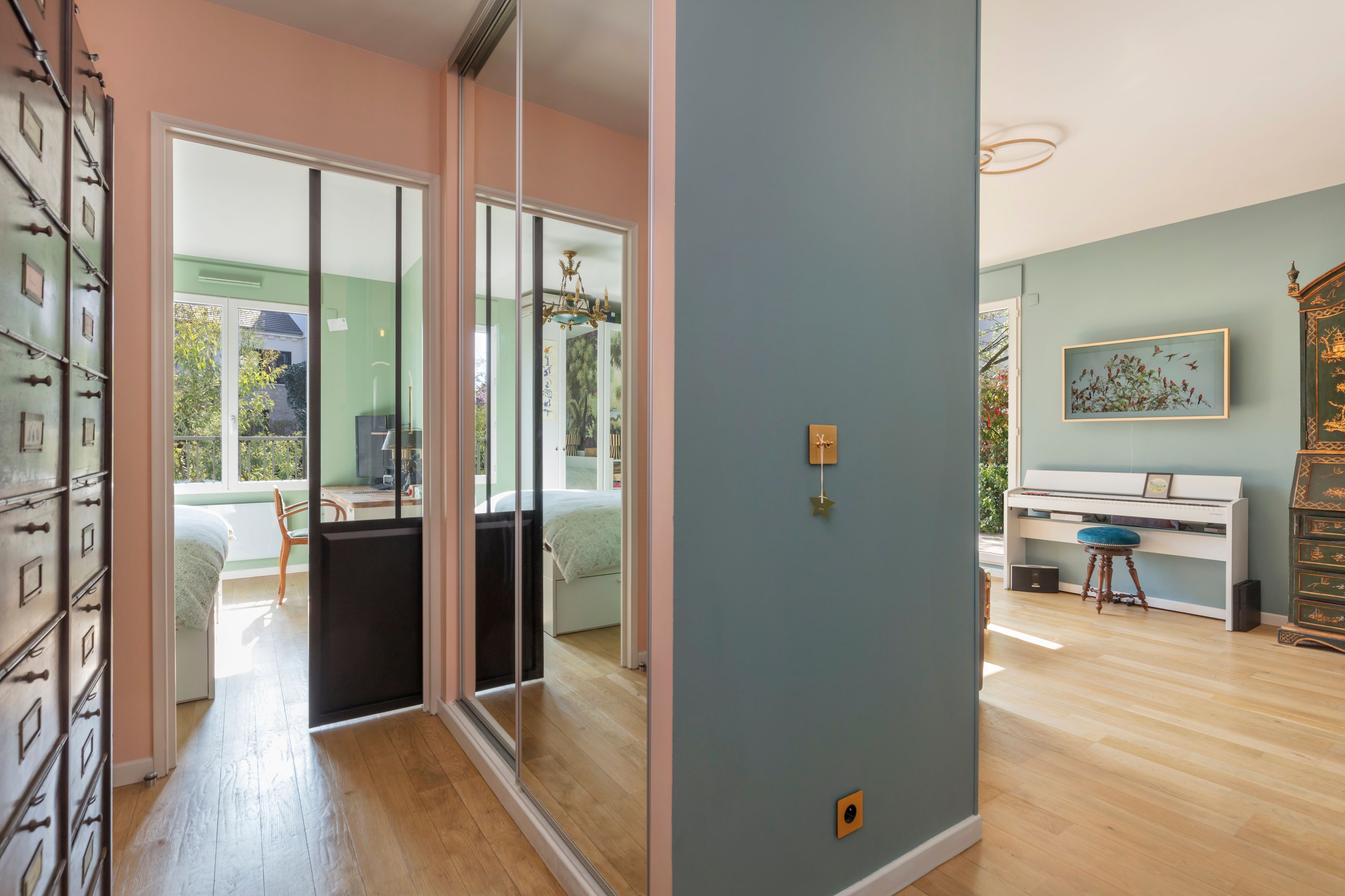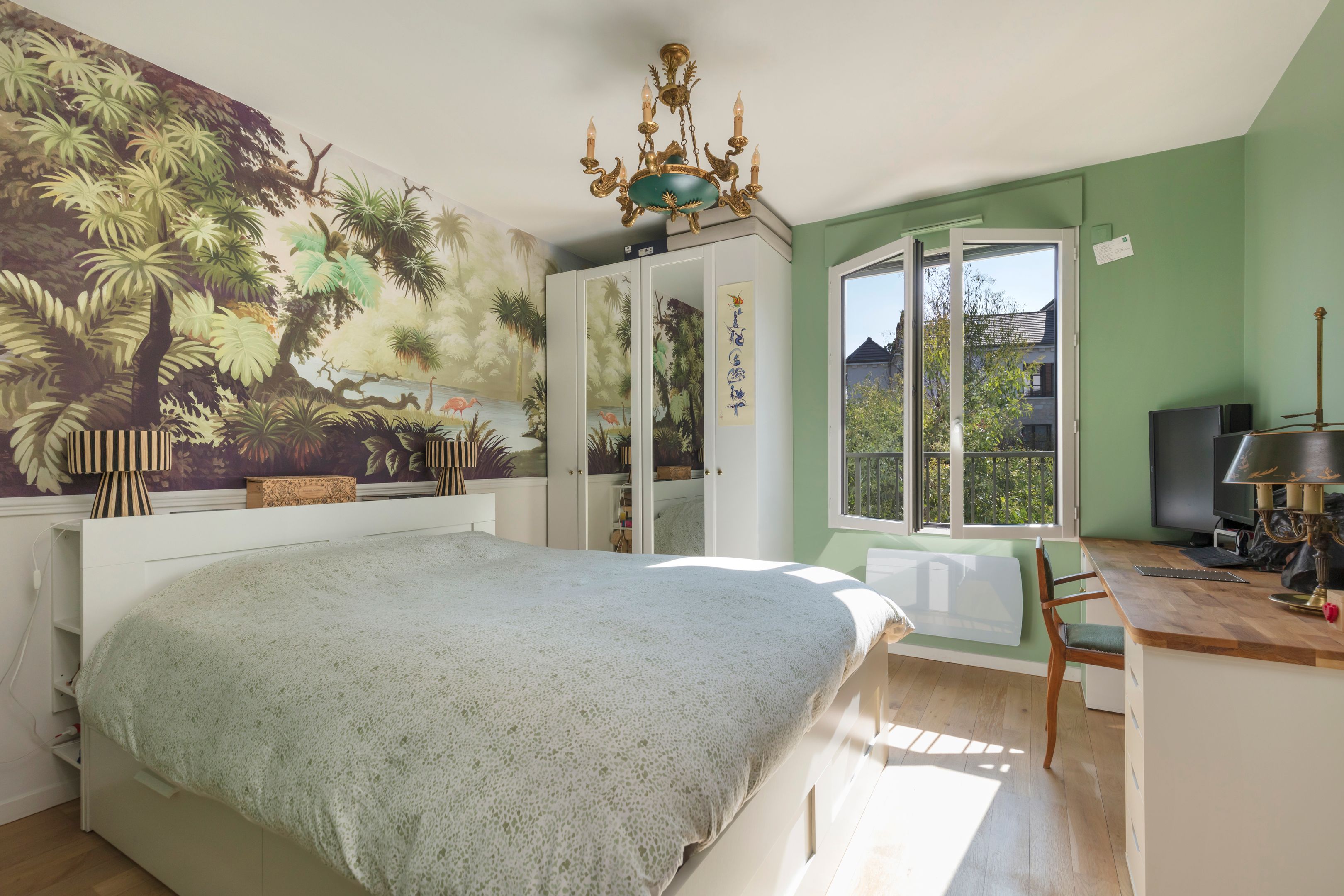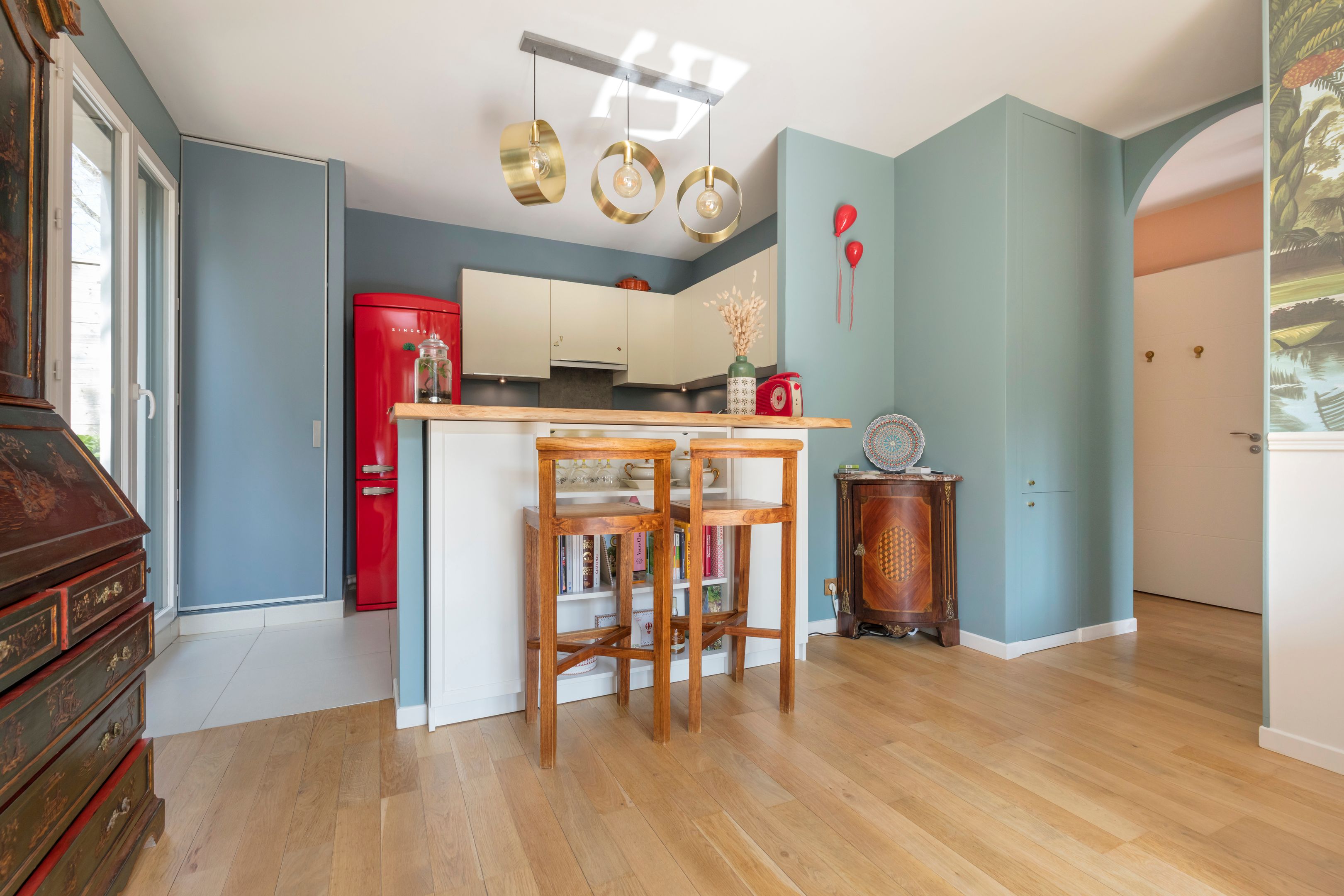 Intérieur raffiné : salon lumineux avec cuisine ouverte moderne, chambre avec papier peint panoramique, salle de bains design, toilettes indépendantes (buanderie et rangements).