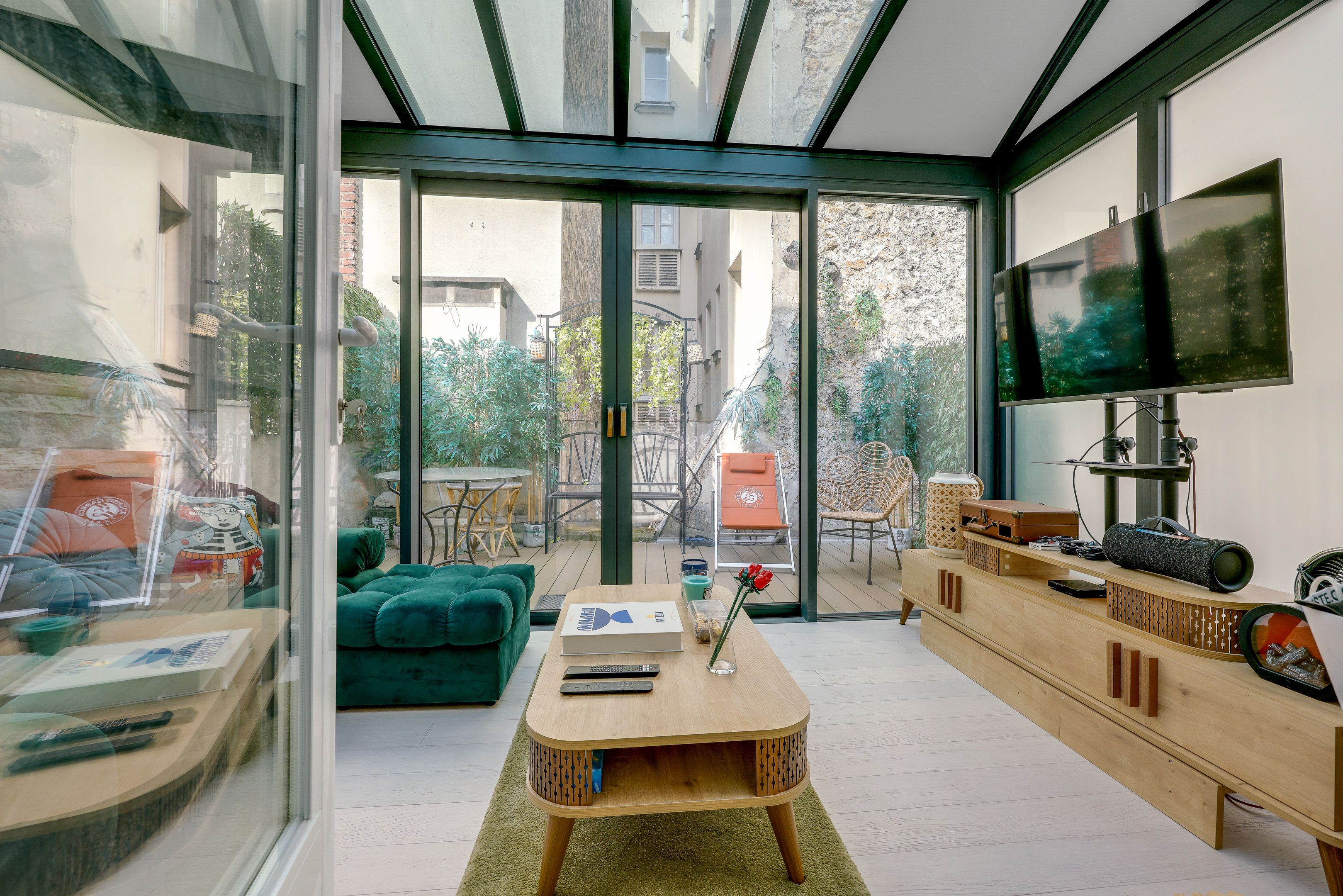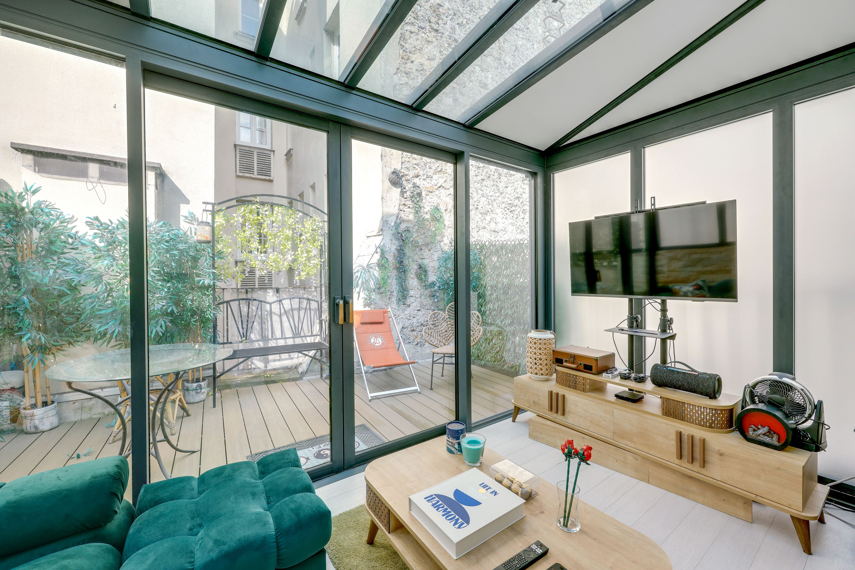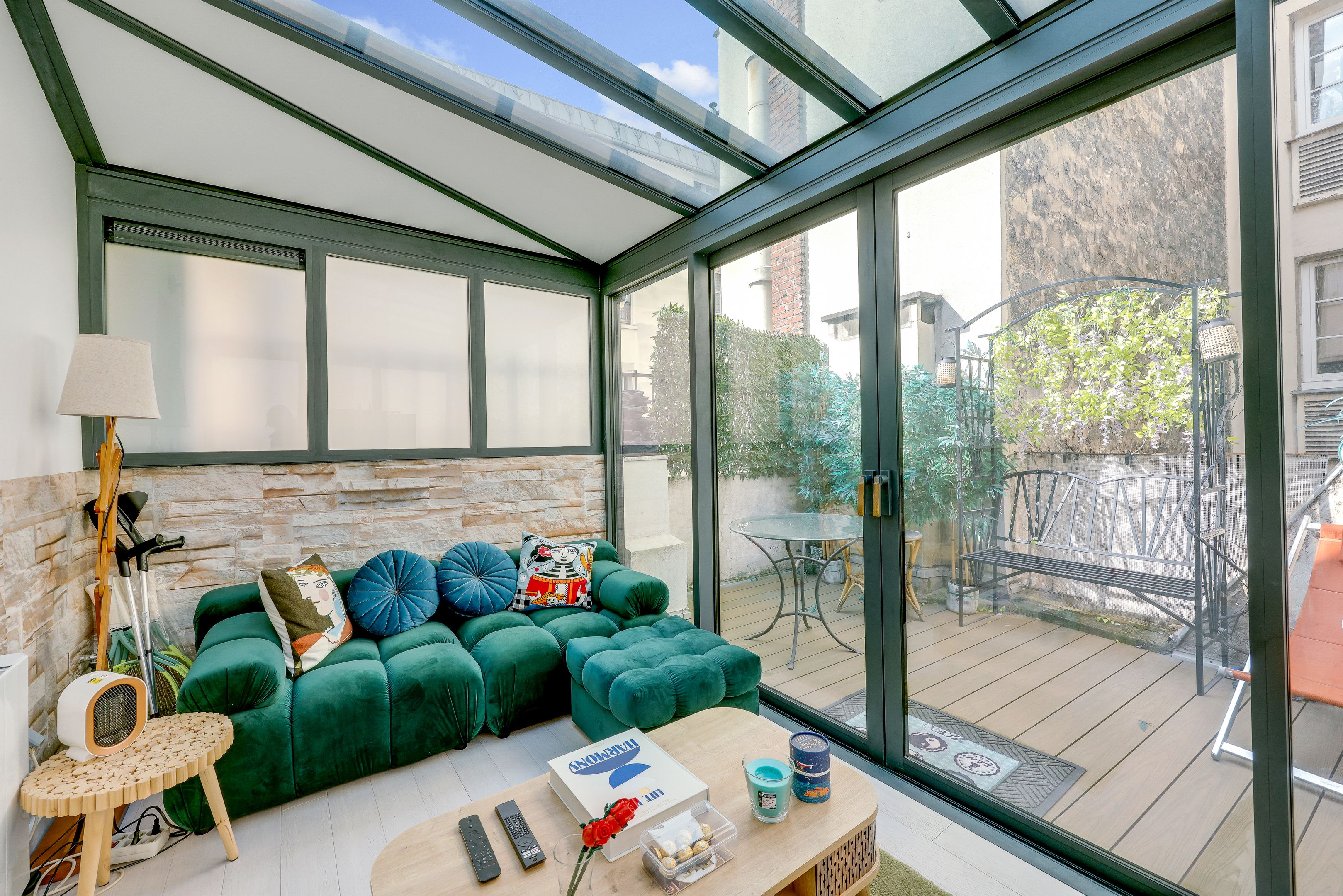 Entrée, chambre avec rangement et salle d'eau, toilettes séparées, espace cuisine dinatoire et salon sous véranda donnant sur l'espace terrasse.
