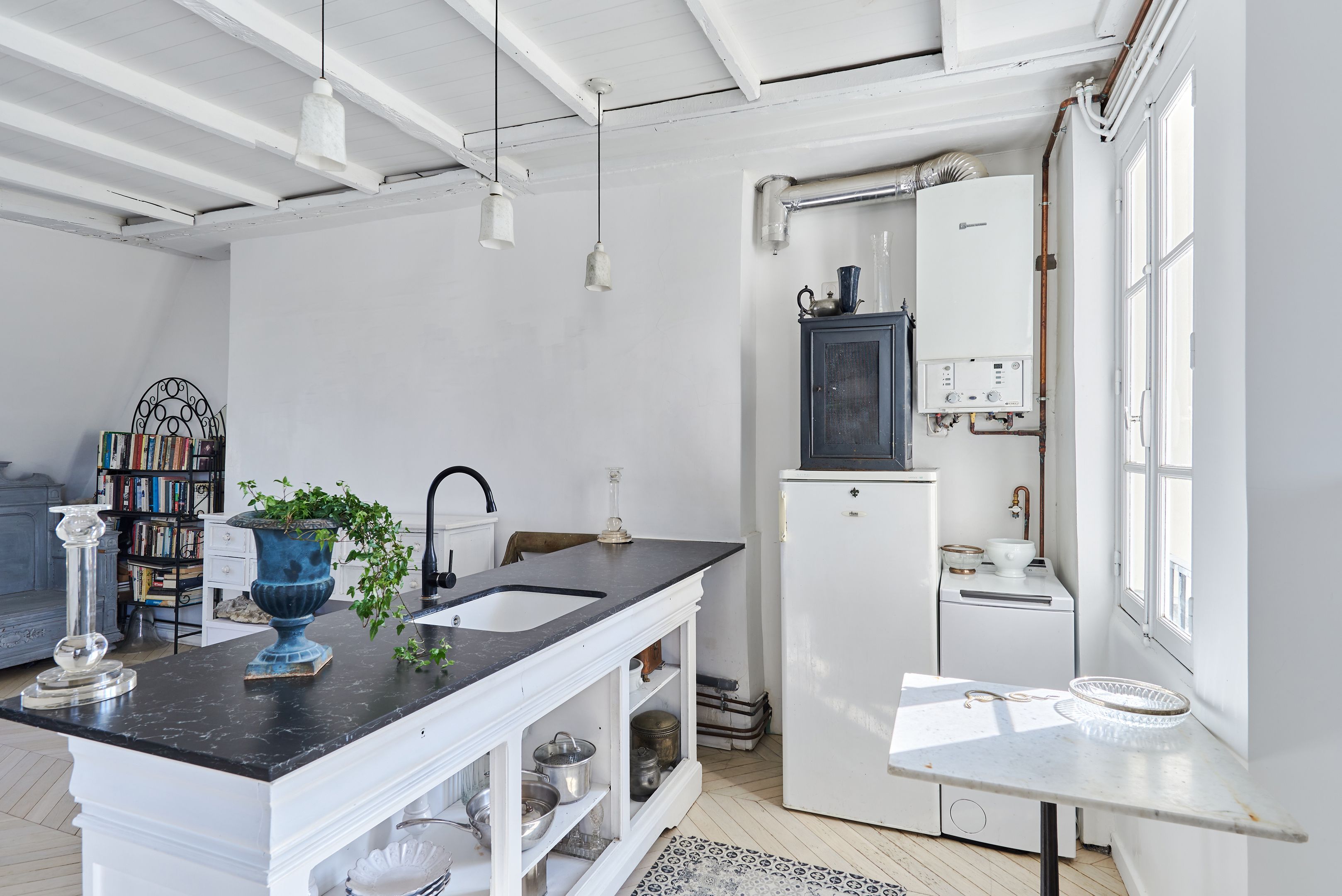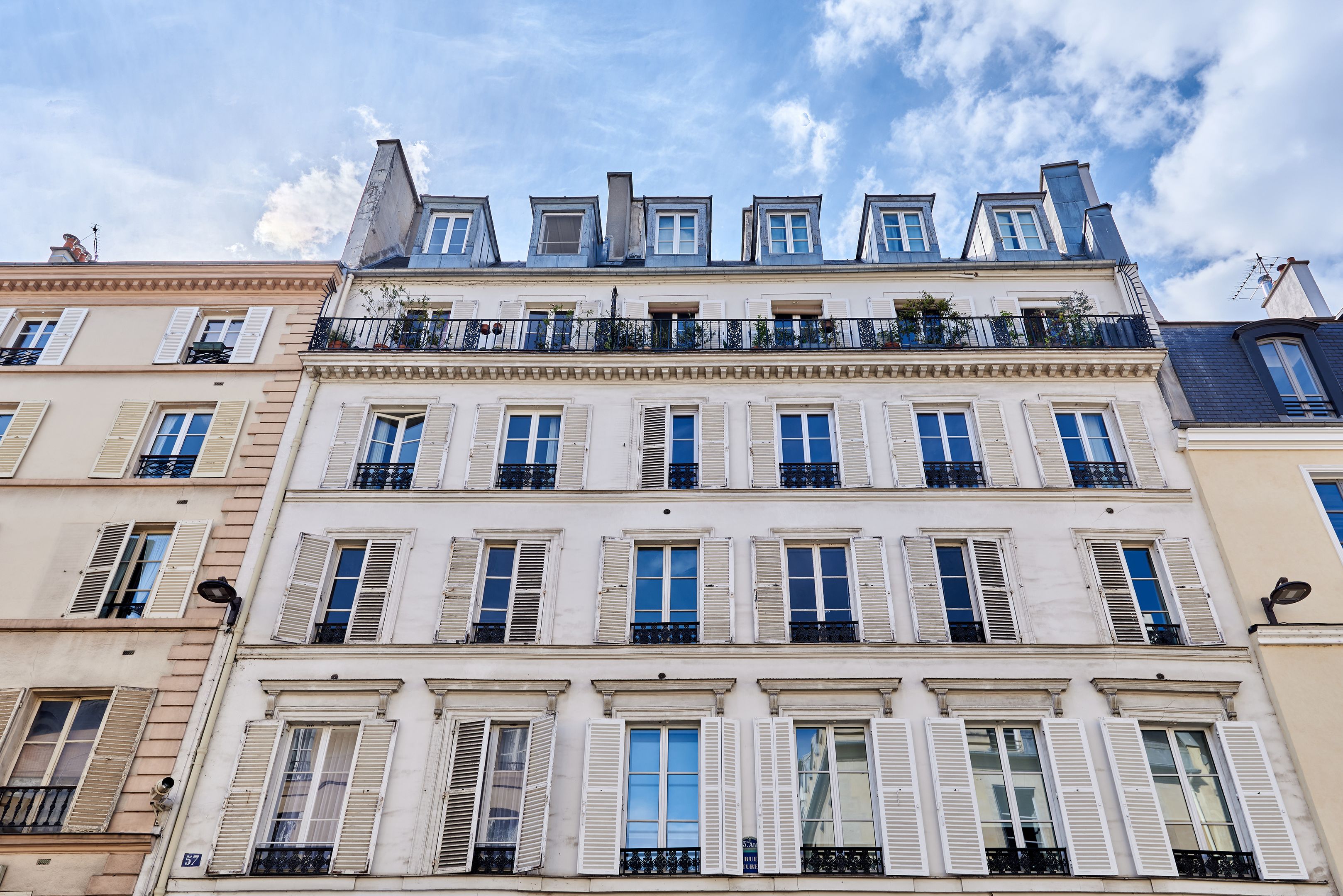 Dans un immeuble du XIXème siècle, au 5ème et dernier étage par escalier, appartement traversant EST/OUEST offrant une vue imprenable sur les monuments de Paris depuis chacune de ses 7 fenêtres. Restauré avec goût et matériaux nobles, le bien a su préserver le charme du Marais: parquet en point de Hongrie, poutres apparentes. Il se compose d'une entrée, d'un séjour spacieux avec cuisine américaine, d'une chambre et d'une salle d'eau avec toilettes. Cave