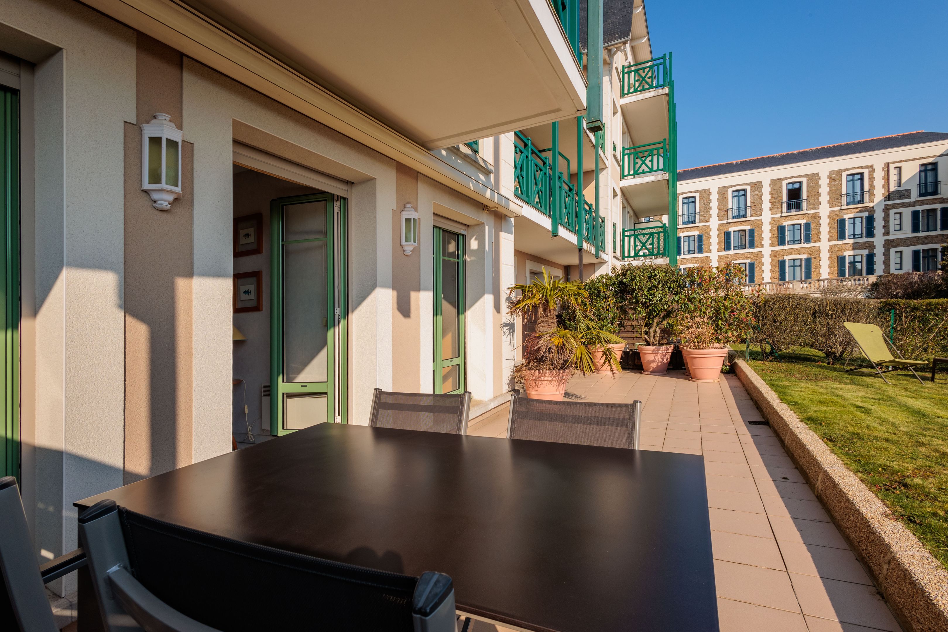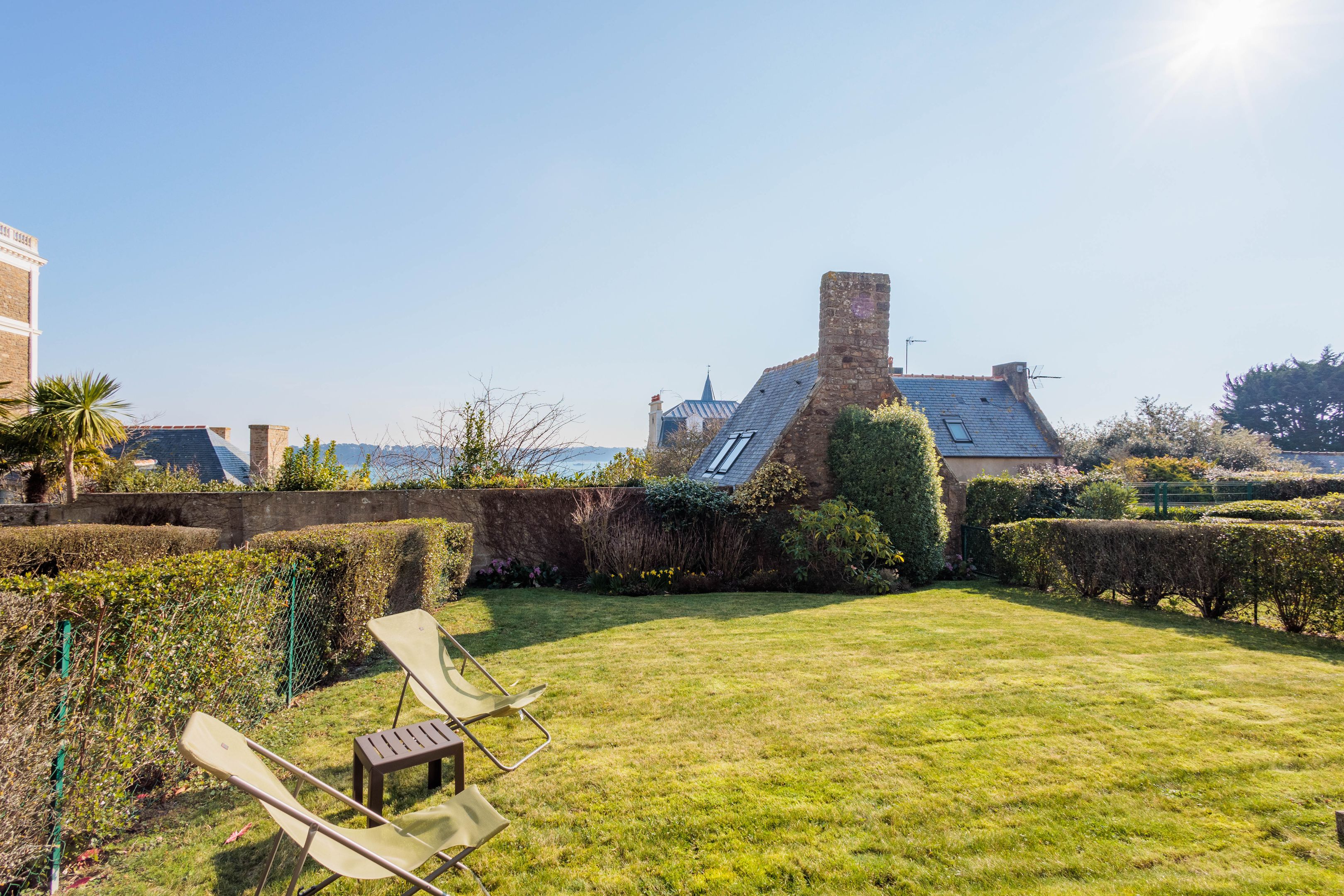 VENDU PAR BRETEUIL - "Les Jardins du Tennis Club" - Au cœur de Dinard, à proximité immédiate des commerces, de la plage et du port de plaisance, dans une résidence calme et bien entretenue. Agréable appartement en rez-de-jardin bénéficiant d'un emplacement de premier plan, d'une superbe vue mer et de beaux espaces extérieurs. Entrée, agréable séjour avec large vue sur la baie du Prieuré et la Tour Solidor ouvrant sur terrasse et jardin à usage privatif de 140m² environ, cuisine ouverte équipée, 2 chambres de belle taille avec placard toute hauteur et accès sur le jardin, salle de bains et toilettes séparées. Cave de 3㎥ à quelques mètres. Place de stationnement intérieur. Garage à vélos et court de tennis à usage partagé. Services quotidiens d'une gardienne.