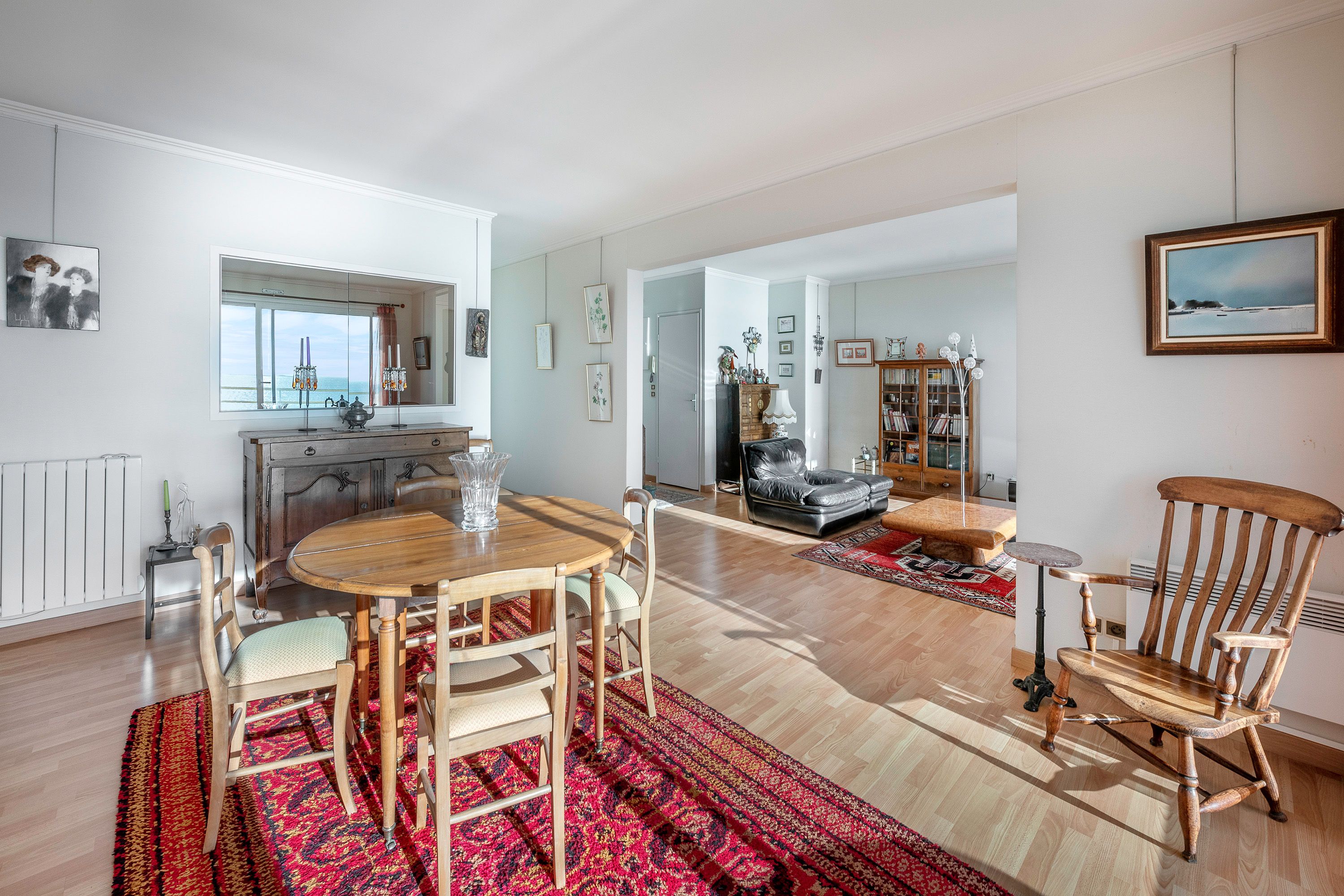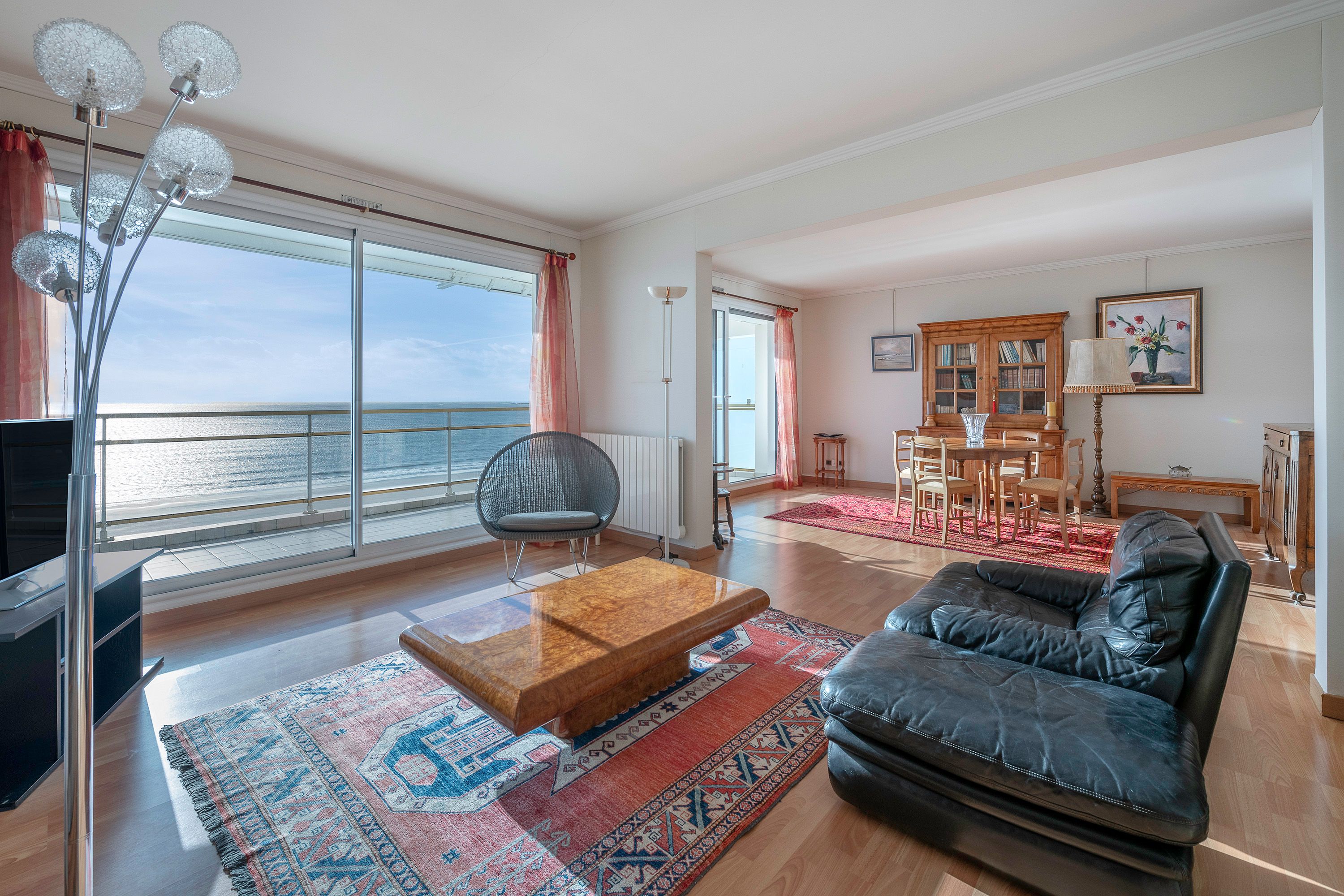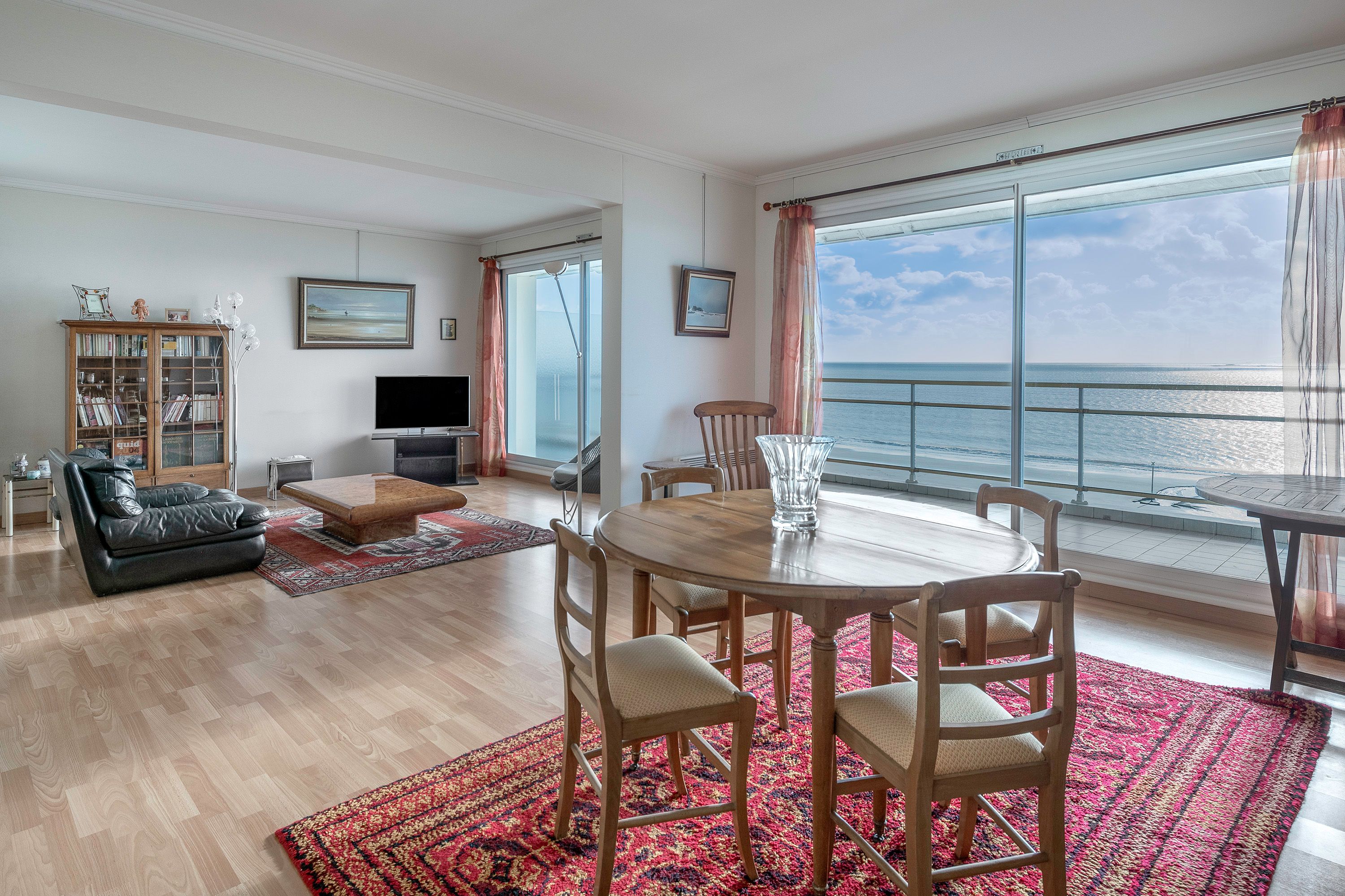Au cinquième étage d'une résidence sécurisée face mer vaste appartement lumineux et traversant: double pièce de vie ouverte sur une grande terrasse, cuisine séparée, 2 chambres sur l'arrière dont une avec placards, dégagement avec placards, toilettes séparées, salle d'eau et buanderie. Grand garage au sous- sol, 2 locaux à vélos.