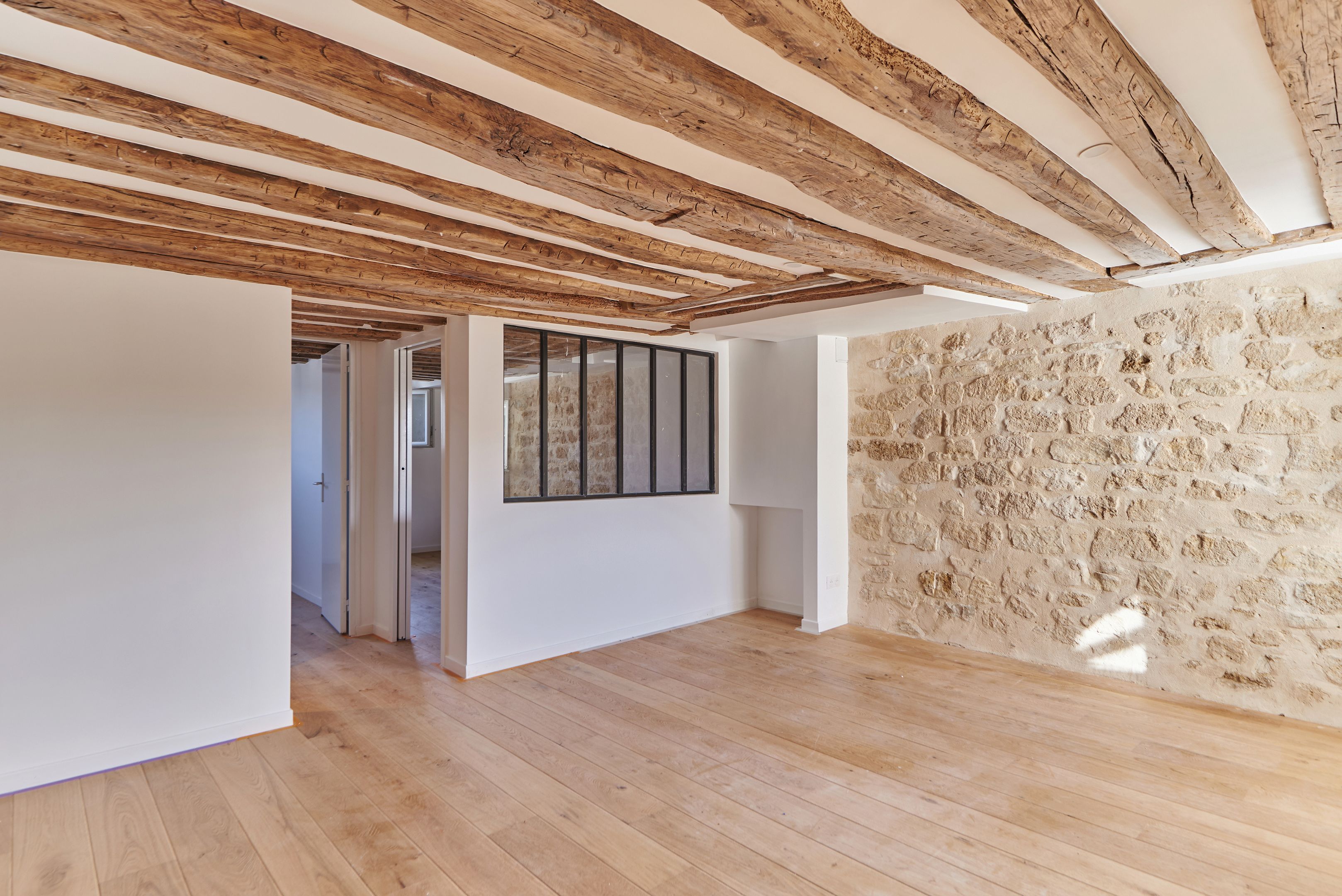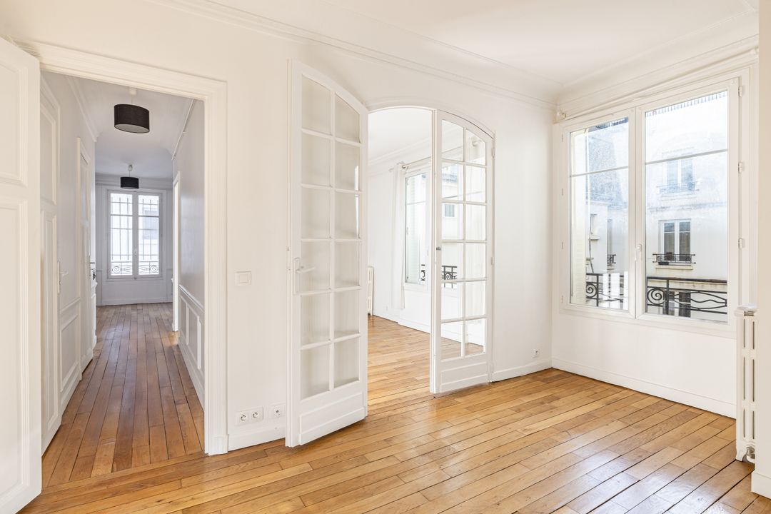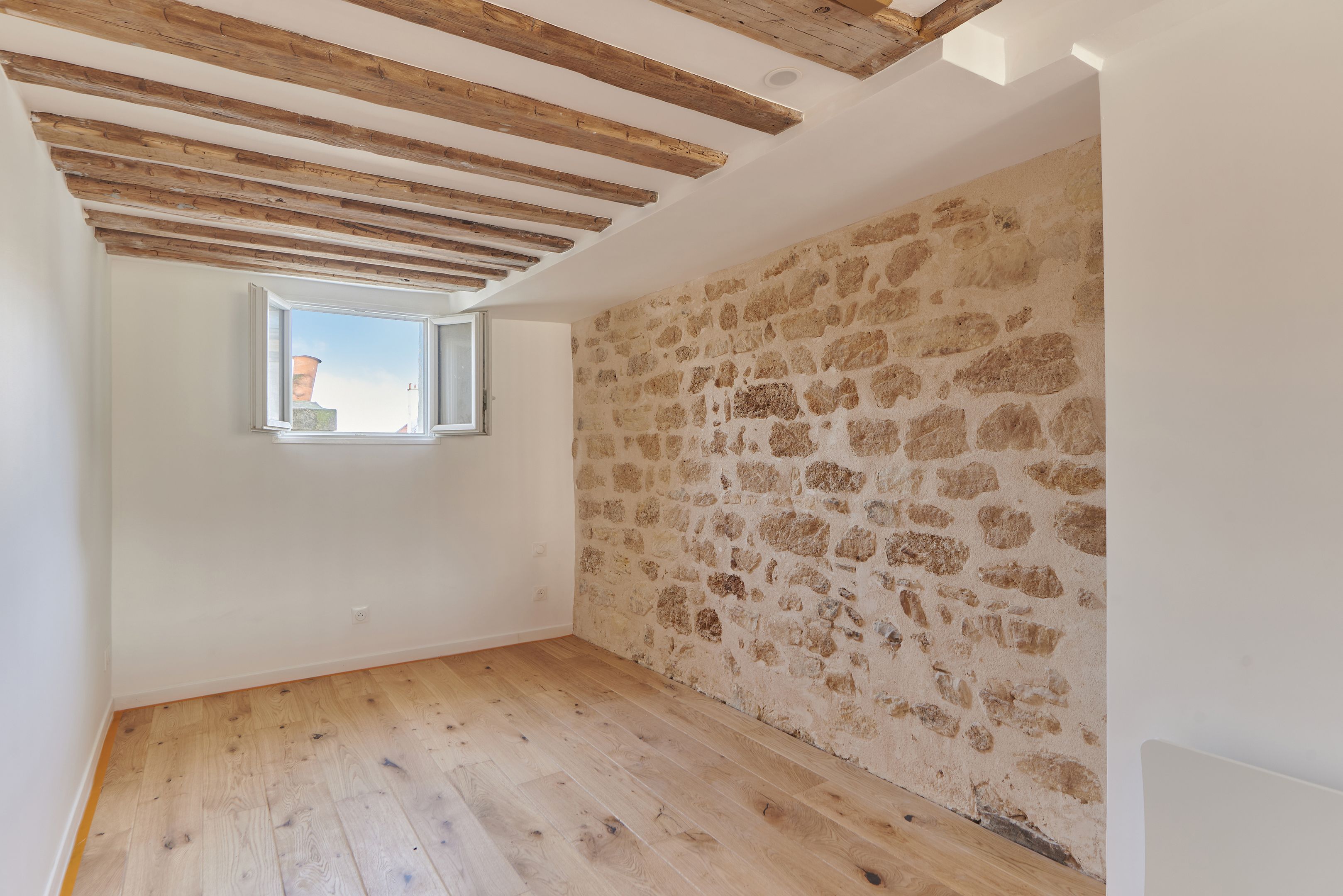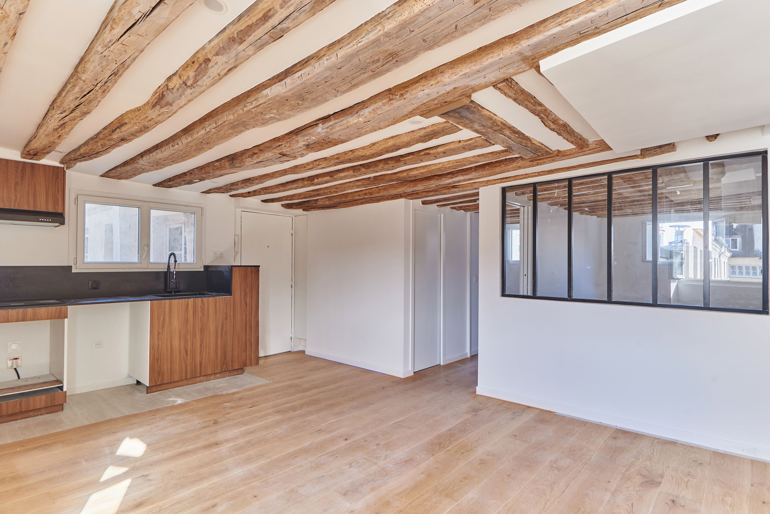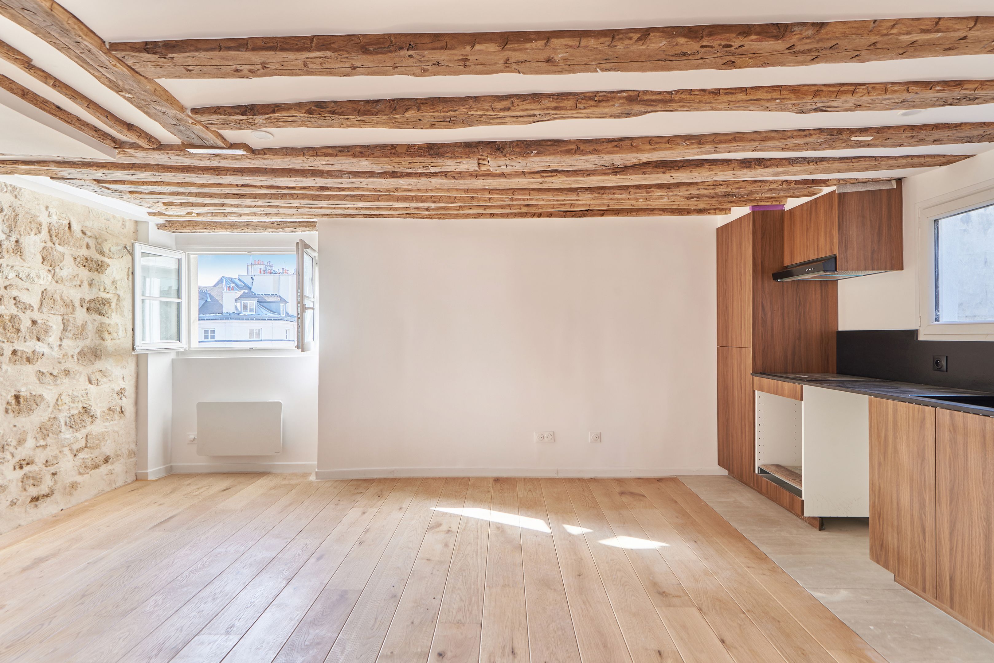 Appartement traversant refait à neuf de 45,97 m² Loi Carrez, au 5ème et dernier étage desservi par un escalier. Séjour avec cuisine ouverte, 2 chambres à coucher, une salle de bains avec toilettes, rangements. Cave. Calme.