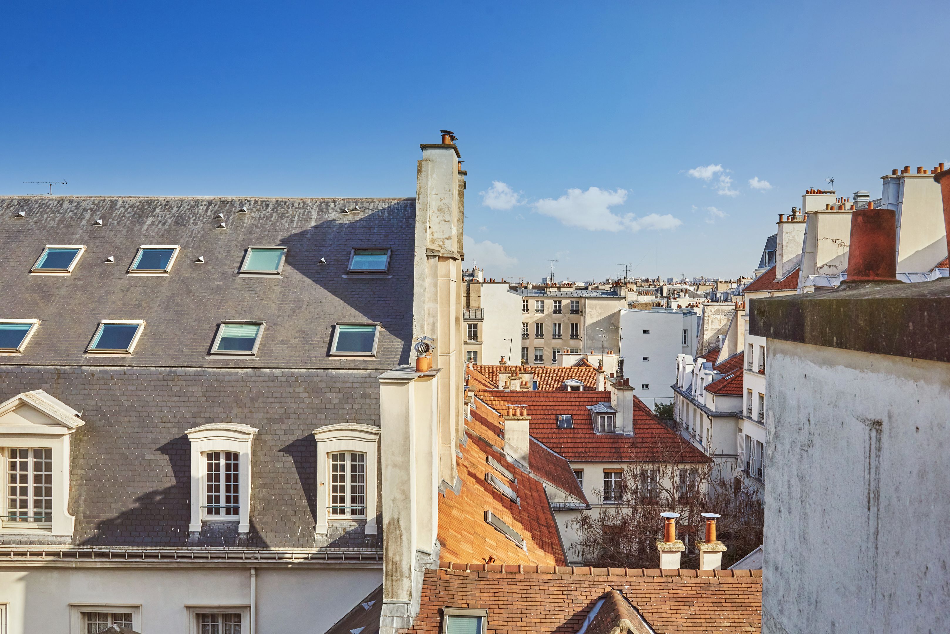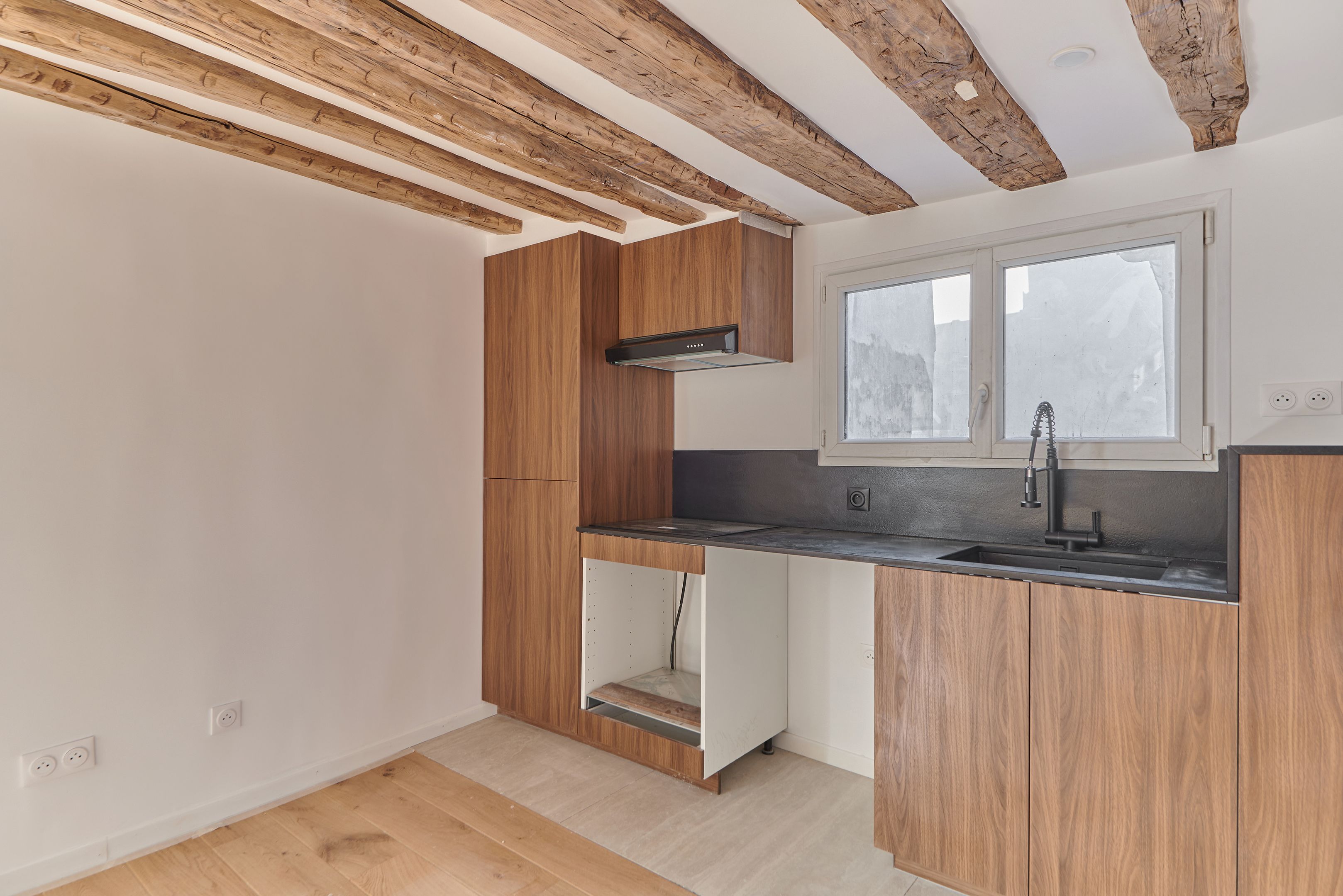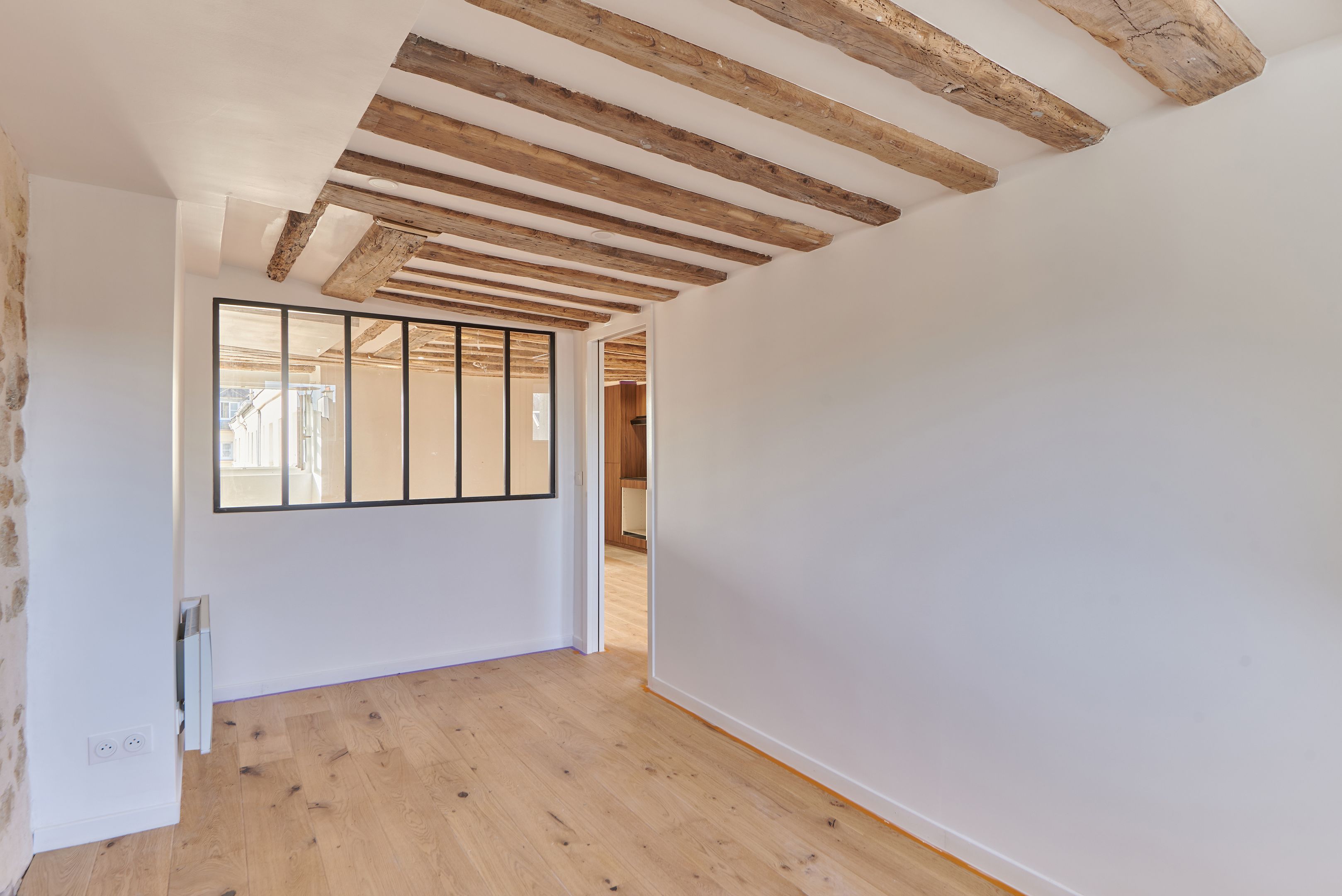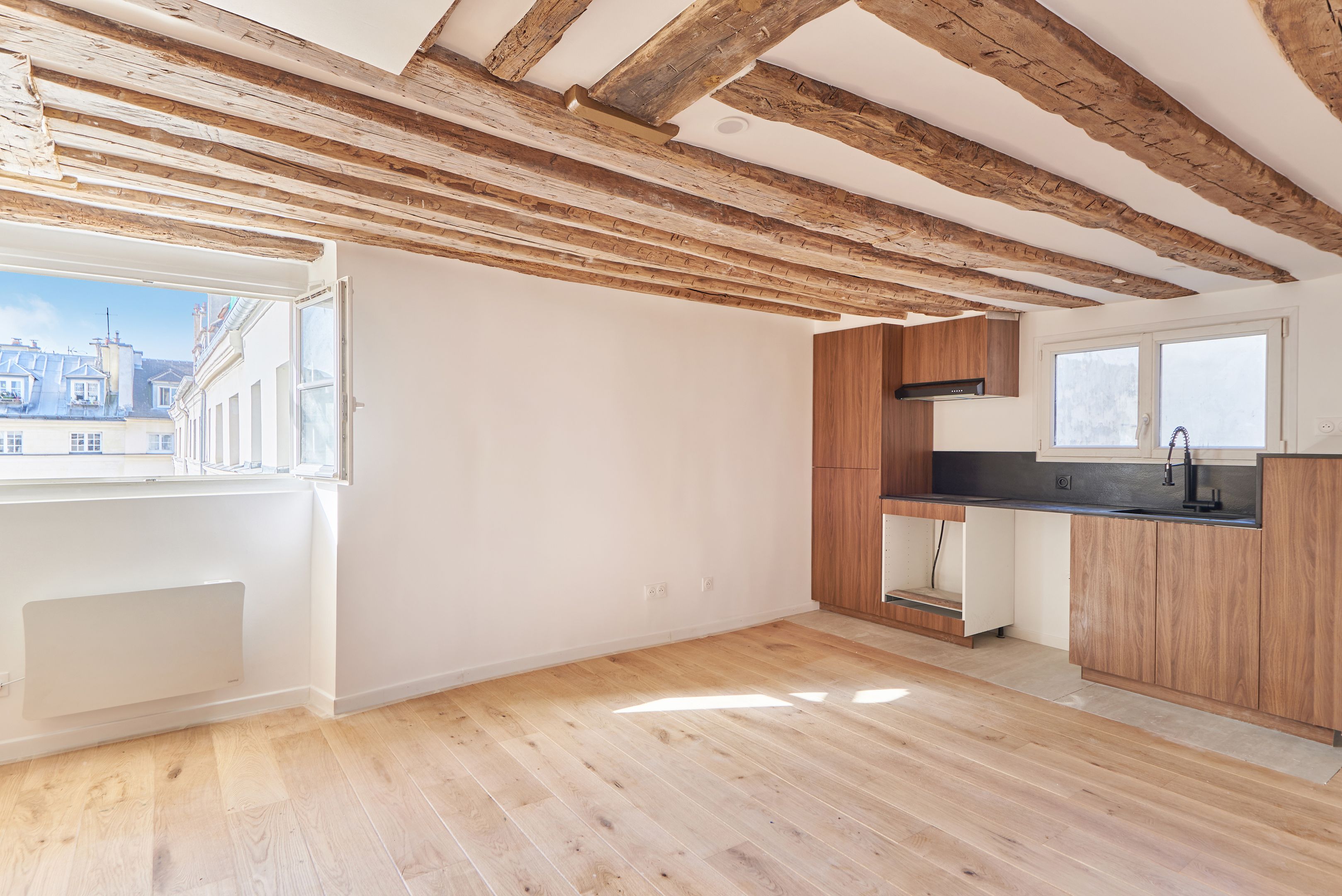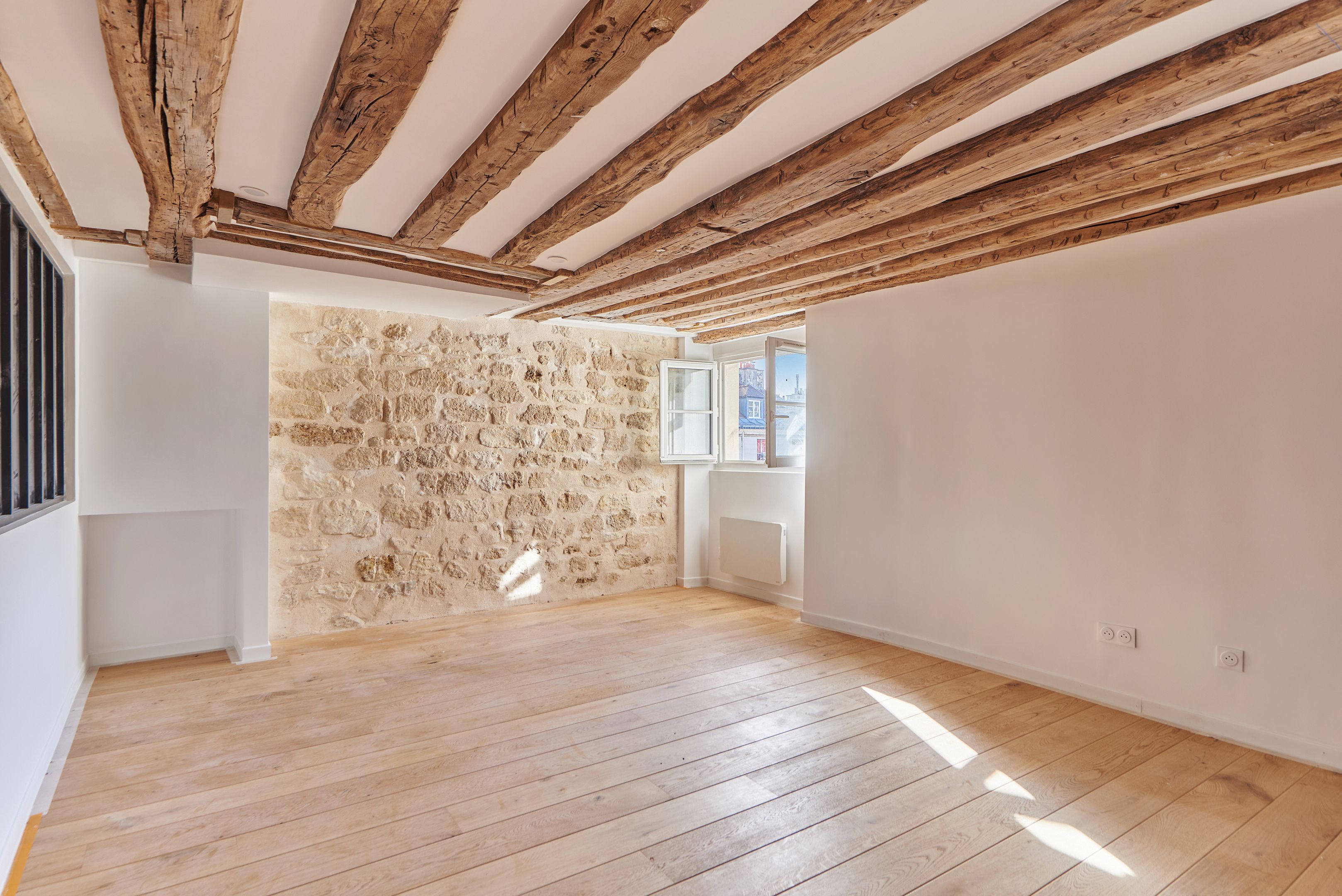 Appartement traversant refait à neuf de 45,97 m² Loi Carrez, au 5ème et dernier étage desservi par un escalier. Séjour avec cuisine ouverte, 2 chambres à coucher, une salle de bains avec toilettes, rangements. Cave. Calme.