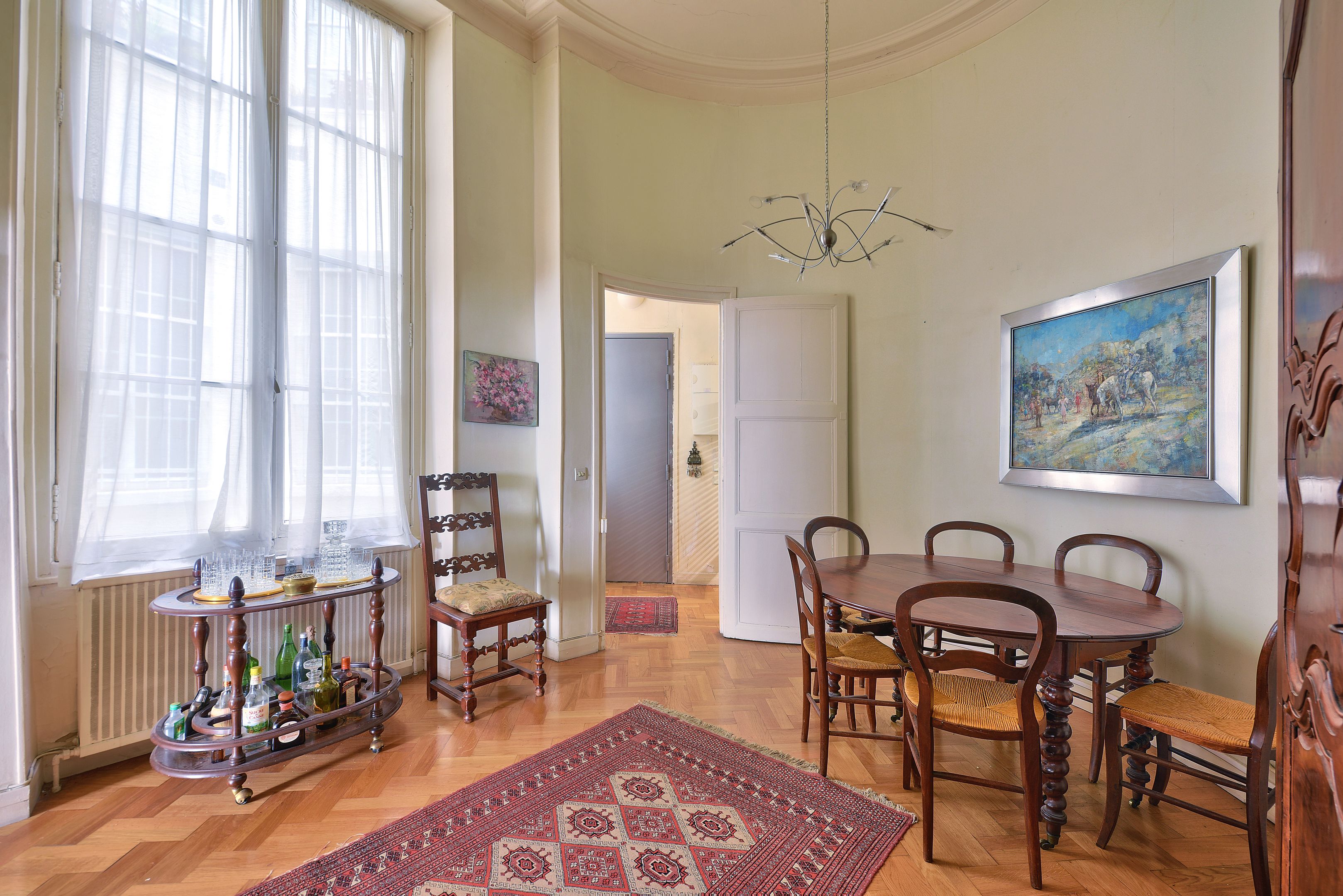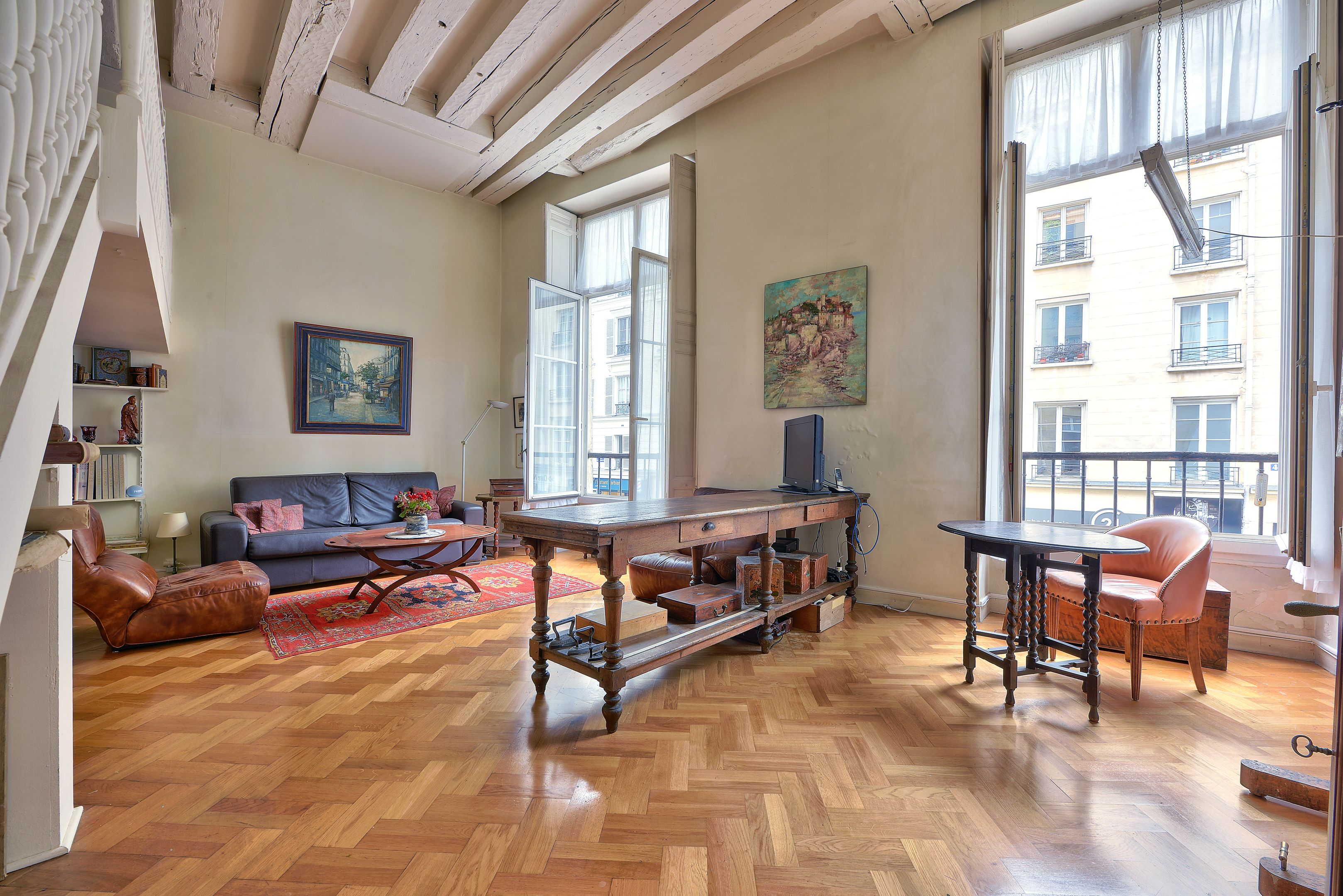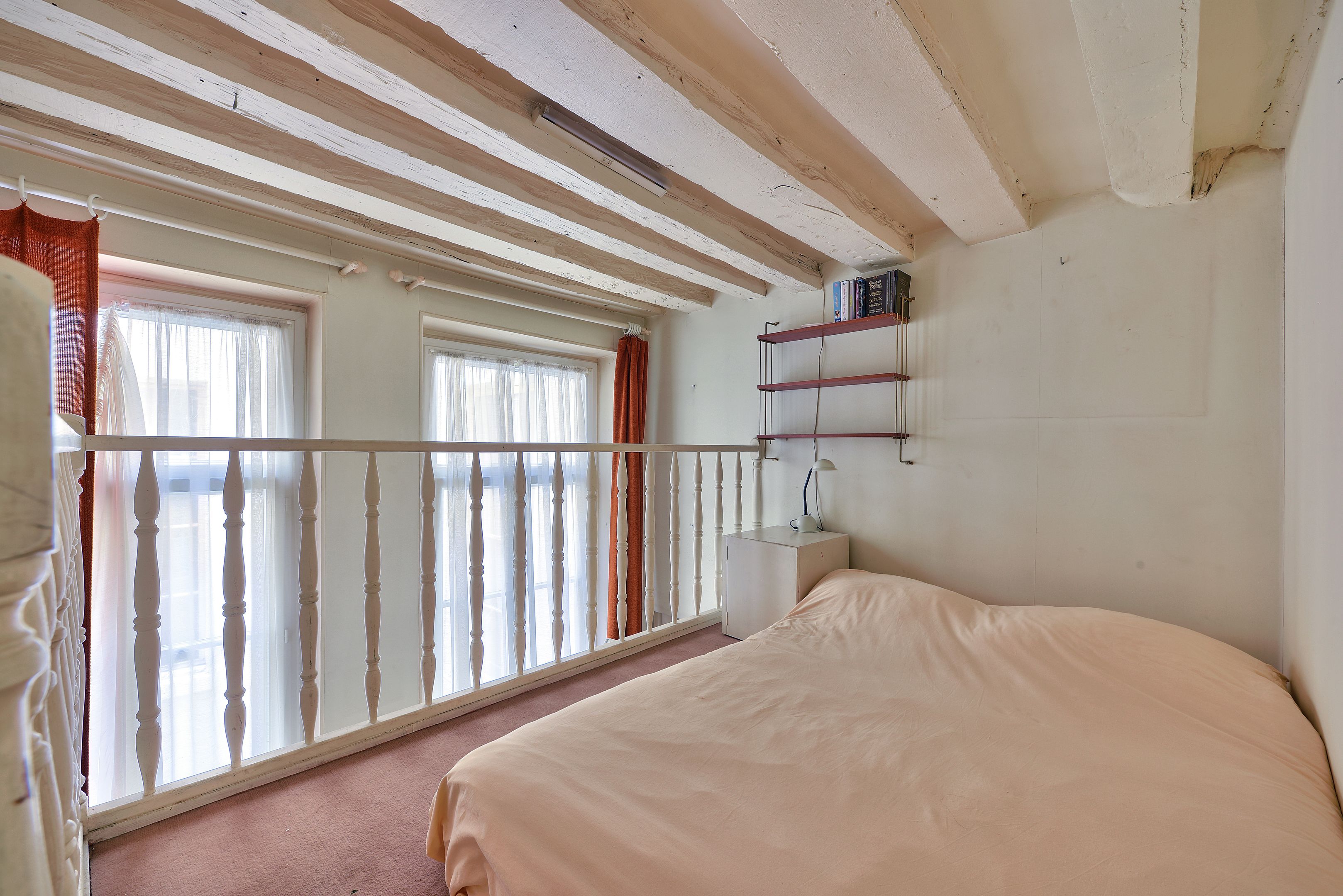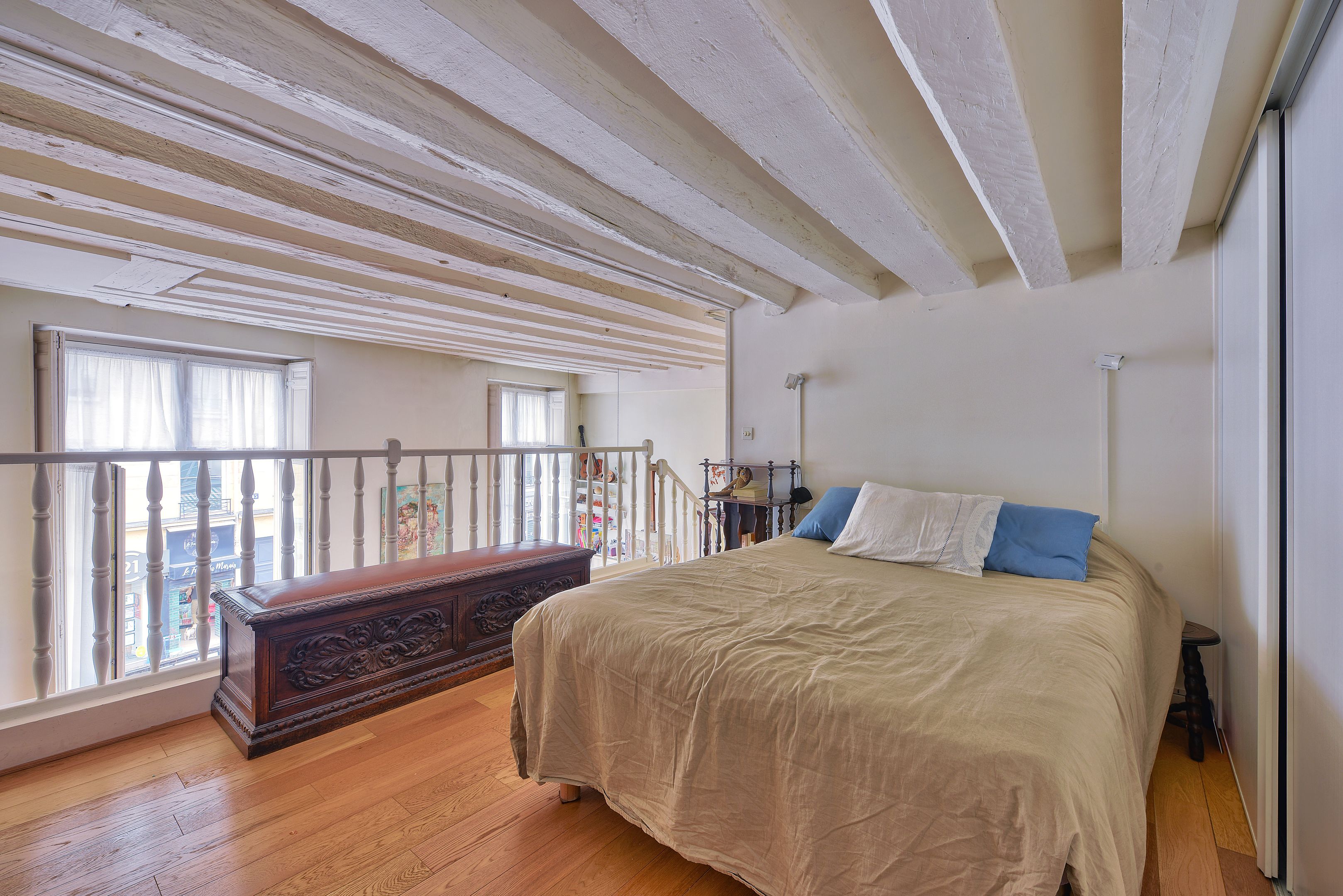 Idéalement situé dans le Marais à quelques pas de la place des Vosges, appartement à l'étage noble d'un immeuble du 18ème siècle bénéficiant d'une hauteur sous plafond de plus de 4 mètres et desservi par ascenseur, nombreuses possibilités d'aménagements, charme du Marais (poutres, hauteur sous plafond, parquet). Entrée, séjour lumineux sur rue, exposé ouest, salle à manger, cuisine indépendante aménagée et équipée (possibilité de l'ouvrir), chambre avec mezzanine sur cour, deuxième chambre en mezzanine. Cave. Professions libérales autorisées.
