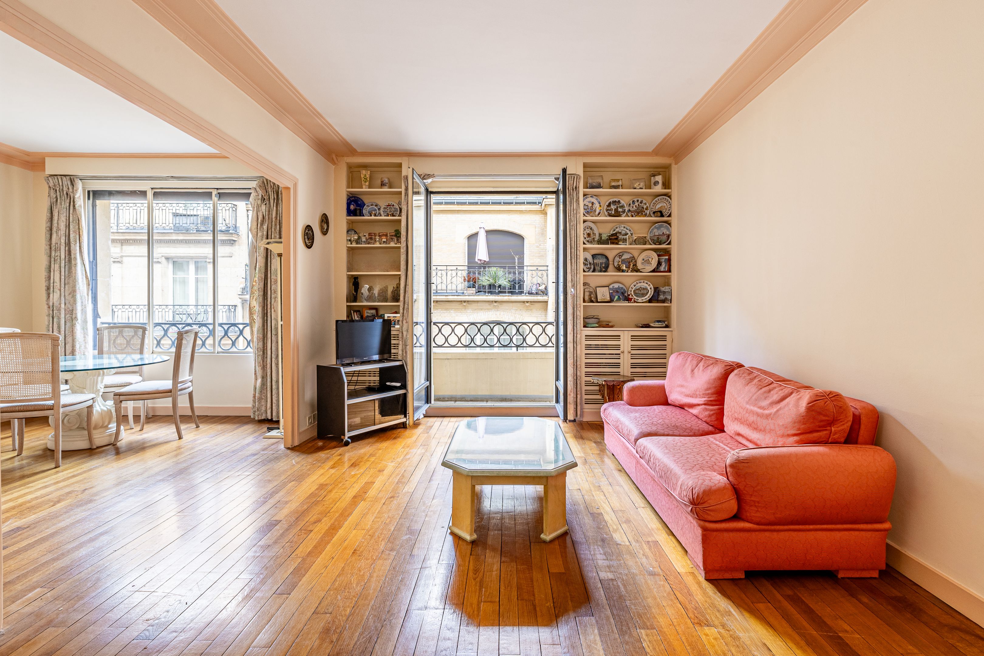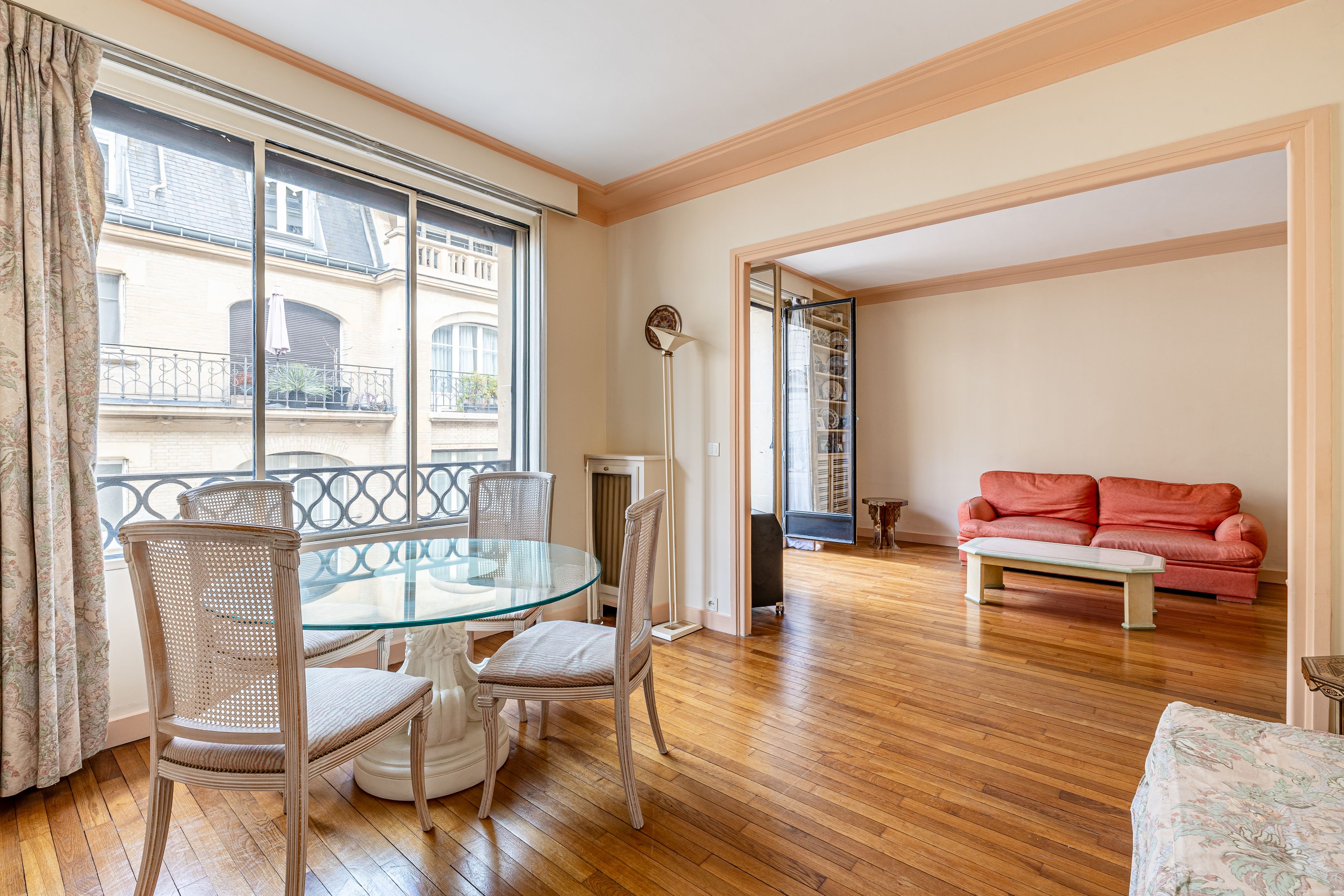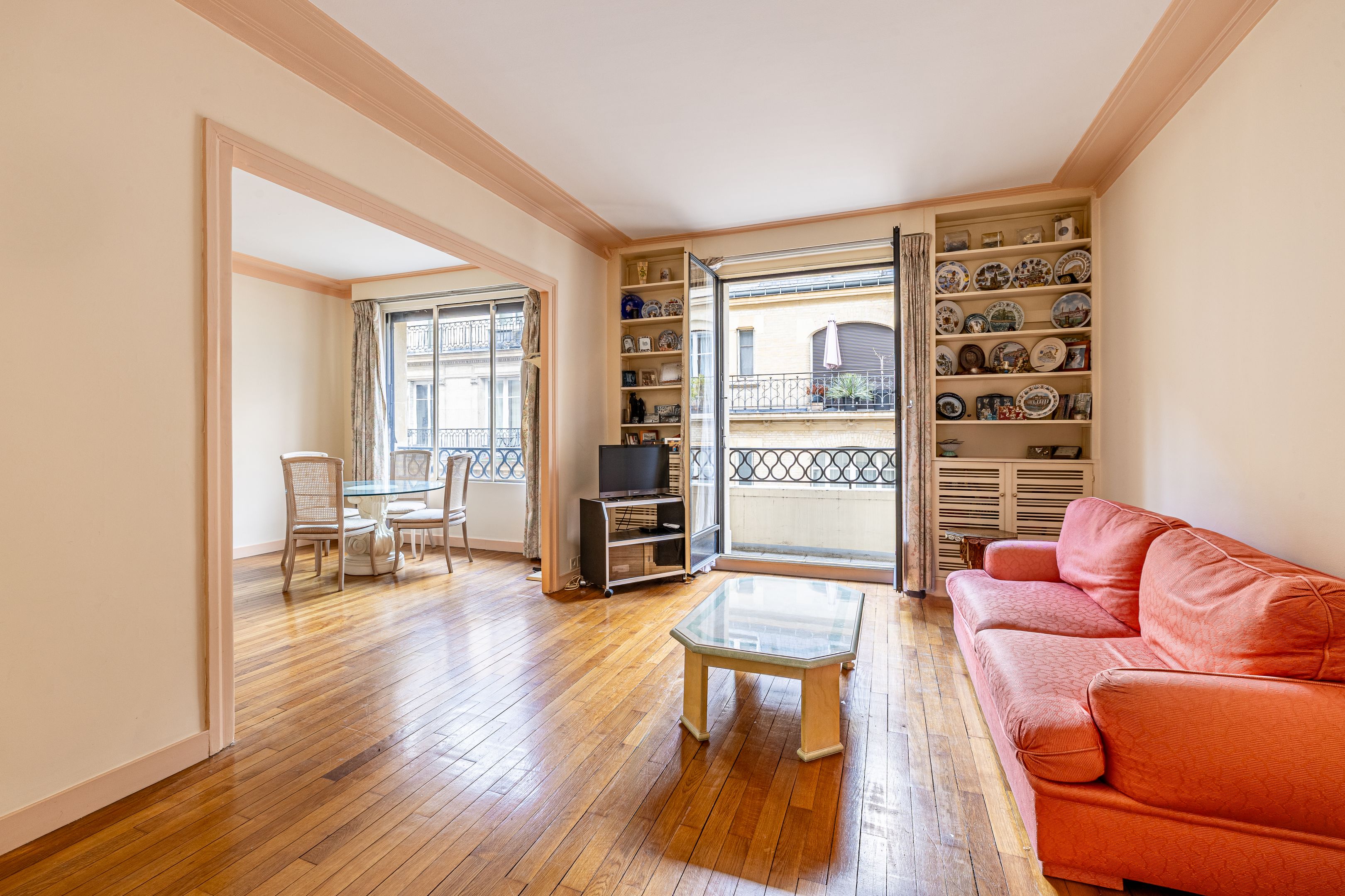 Victor Hugo - Chaillot. Idéalement situé à proximité de nombreux commerces et transports. Au quatrième étage desservi par ascenseur d'un bel immeuble ancien en pierre de taille, style art déco de standing et sécurisé, joli appartement d'une surface de 62,14 m² Loi Carrez bénéficiant d'un plan exemplaire offrant de nombreuses possibilités d'aménagement. Entrée, double séjour lumineux orienté à l'est ouvrant sur un large balcon, cuisine séparée aménagée (ouverture possible sur le séjour), chambre au calme orientée à l'ouest avec toilettes et point d'eau, salle de bains, toilettes séparées, nombreux rangements. Idéal pied-à-terre dans un secteur prisé. Cave. Un emplacement de parking en supplément indissociable de l'appartement au prix de 55 000 €. Exclusivité Breteuil.