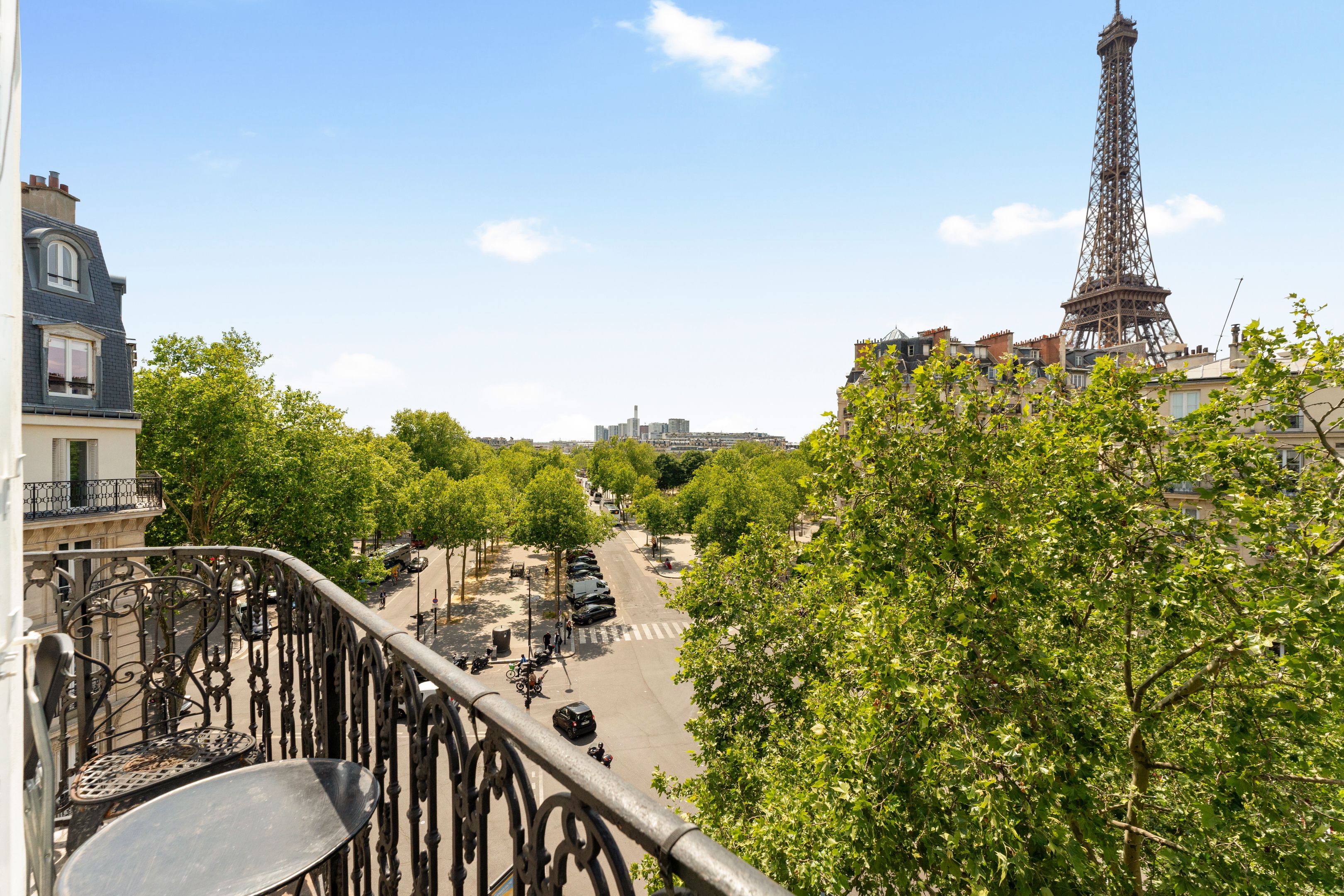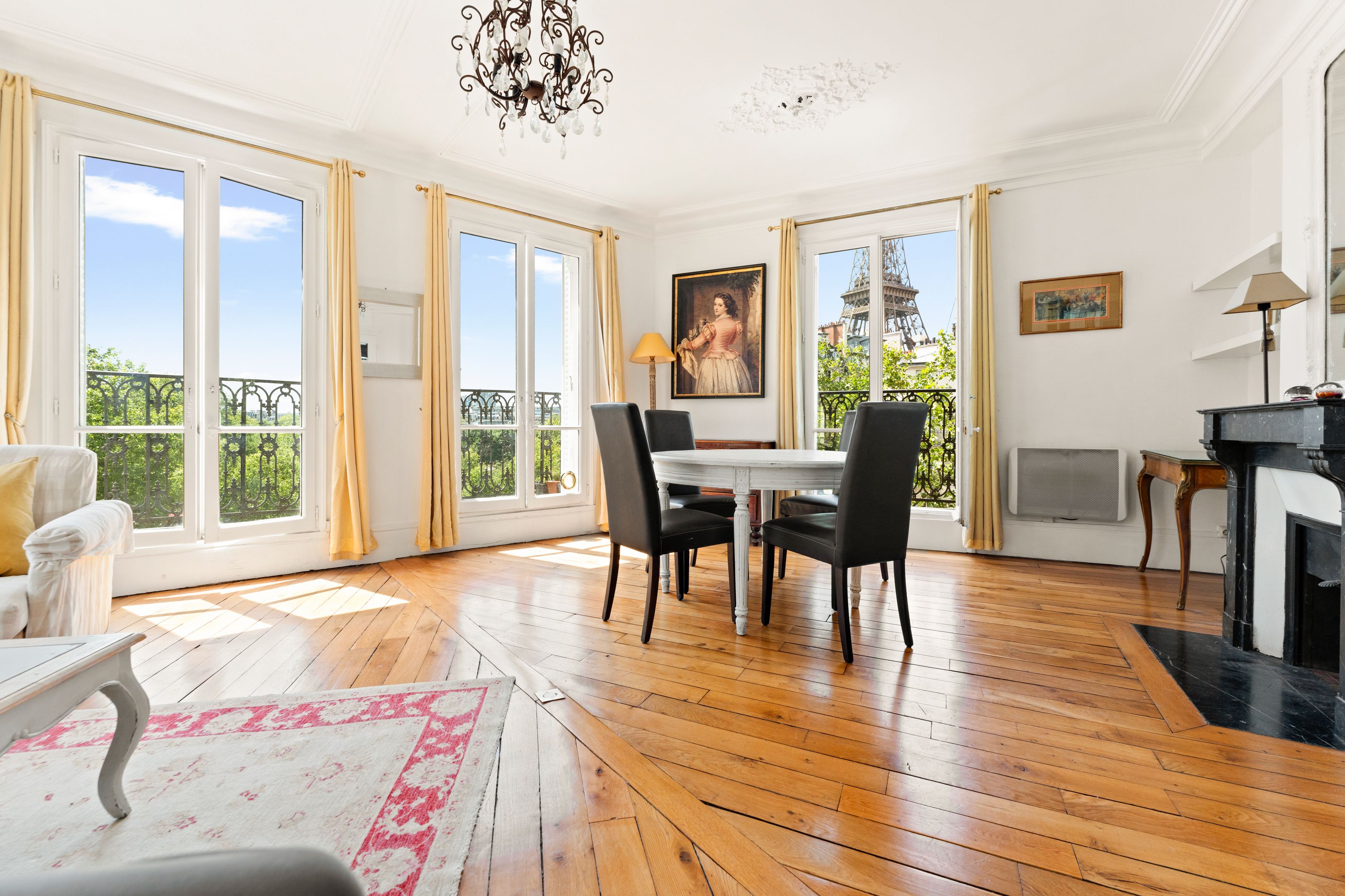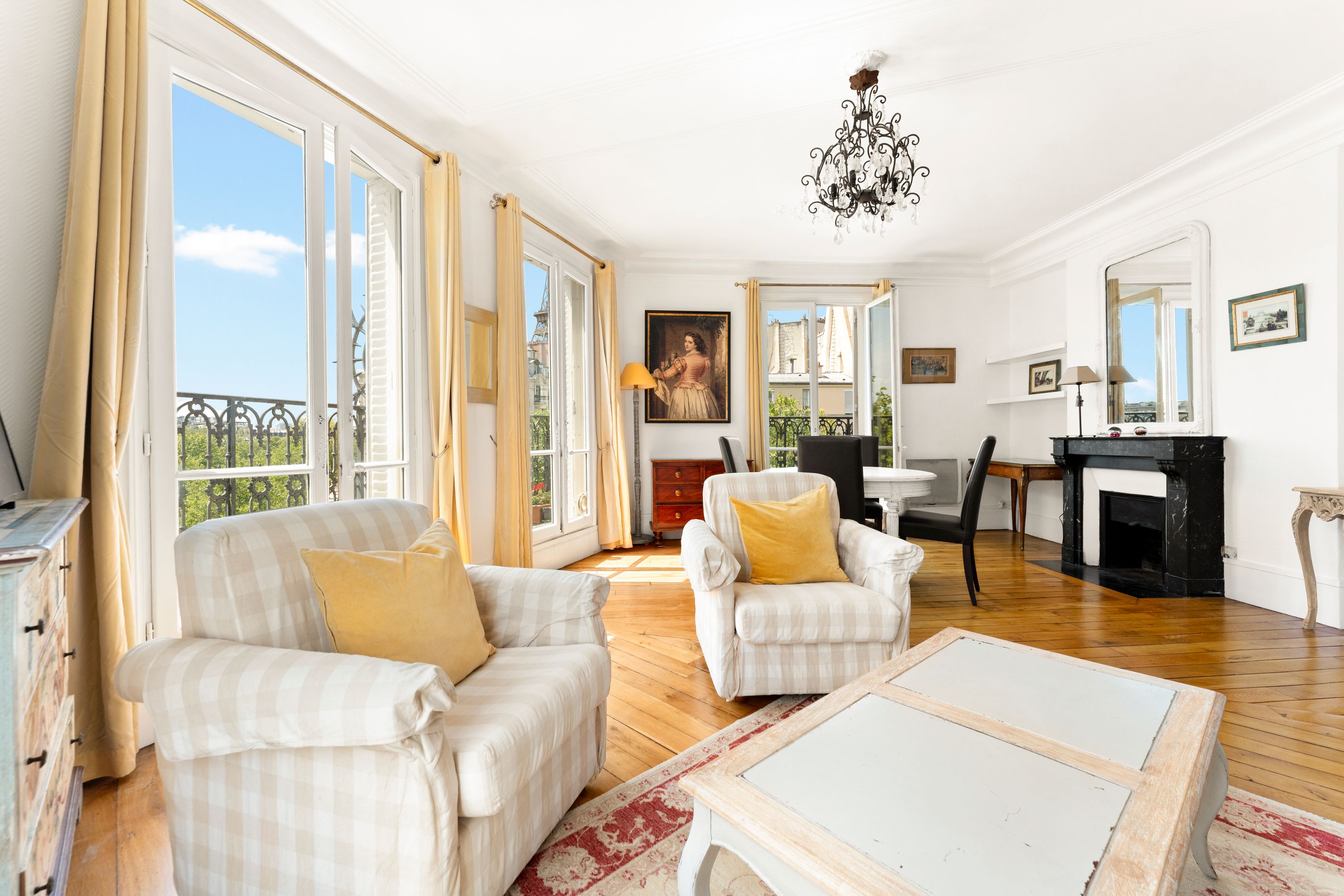 Au coeur du quartier du Gros Caillou, immeuble d'angle en pierre de taille de bon standing jouissant de parties communes très bien entretenues, appartement traversant de 73,31m² au sol (72,69m² loi Carrez), bénéficiant d'une belle luminosité, d'un plan optimisé, d'un balcon filant et d'exceptionnelles vues sur la Tour Eiffel et le dôme des Invalides, situé au 5ème étage desservi par ascenseur. Entrée, vaste double séjour disposant de 4 porte-fenêtres ouvrant sur le balcon filant, cuisine séparée, deux chambres dont une avec salle de bains privative, salle de bains, 2 toilettes séparées, nombreux rangements. Cave.