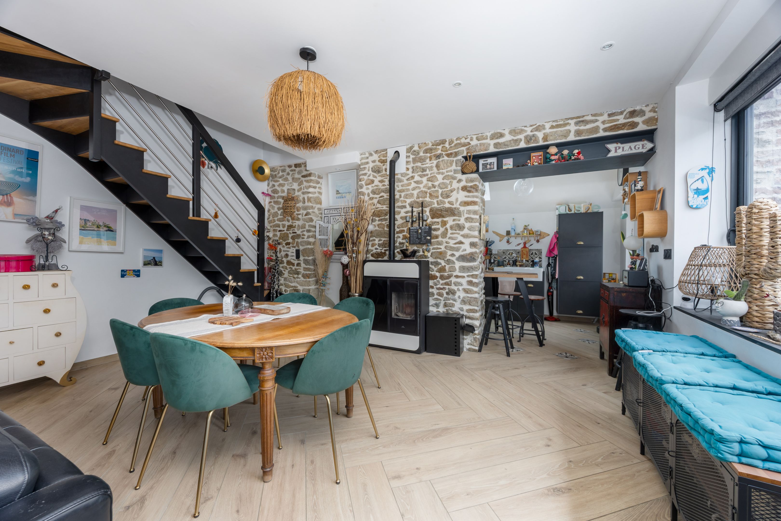 Dinard, à proximité de Saint-Énogat et du nouveau quartier de Newquay. Jolie maison en pierres apparentes profitant d'une rénovation complète, d'un plan optimisé et d'une bonne isolation énergétique. Salon-salle à manger de 33m² avec large surface vitrée et équipé d'un poêle à granulés, belle cuisine équipée, buanderie, toilettes séparées. À l'étage, deux chambres, salle de bain. Sous combles, chambre mansardée avec salle d'eau. Cour intérieure sous pergolas permettant de stationner des vélos et profiter d'un bain de soleil.