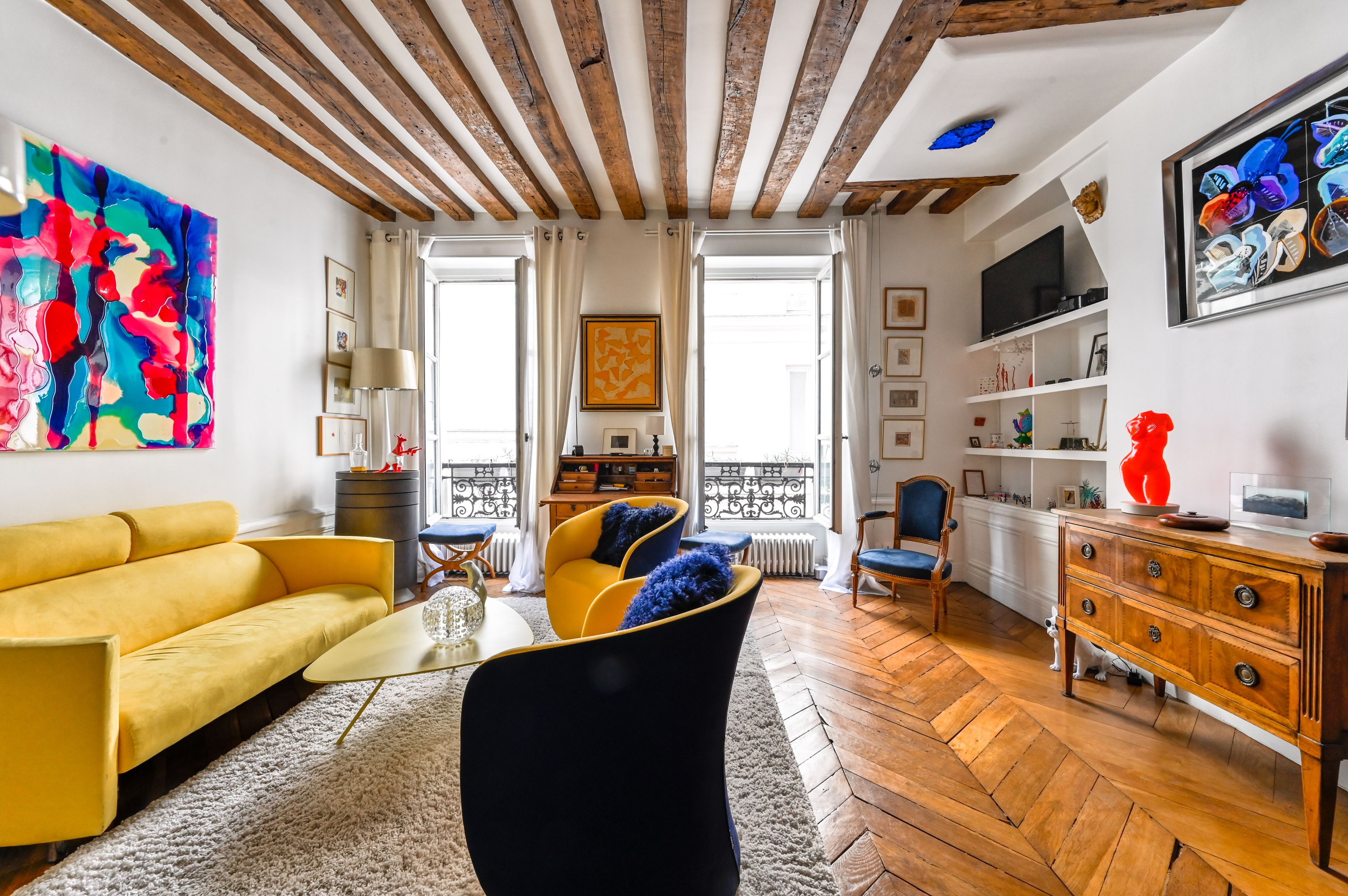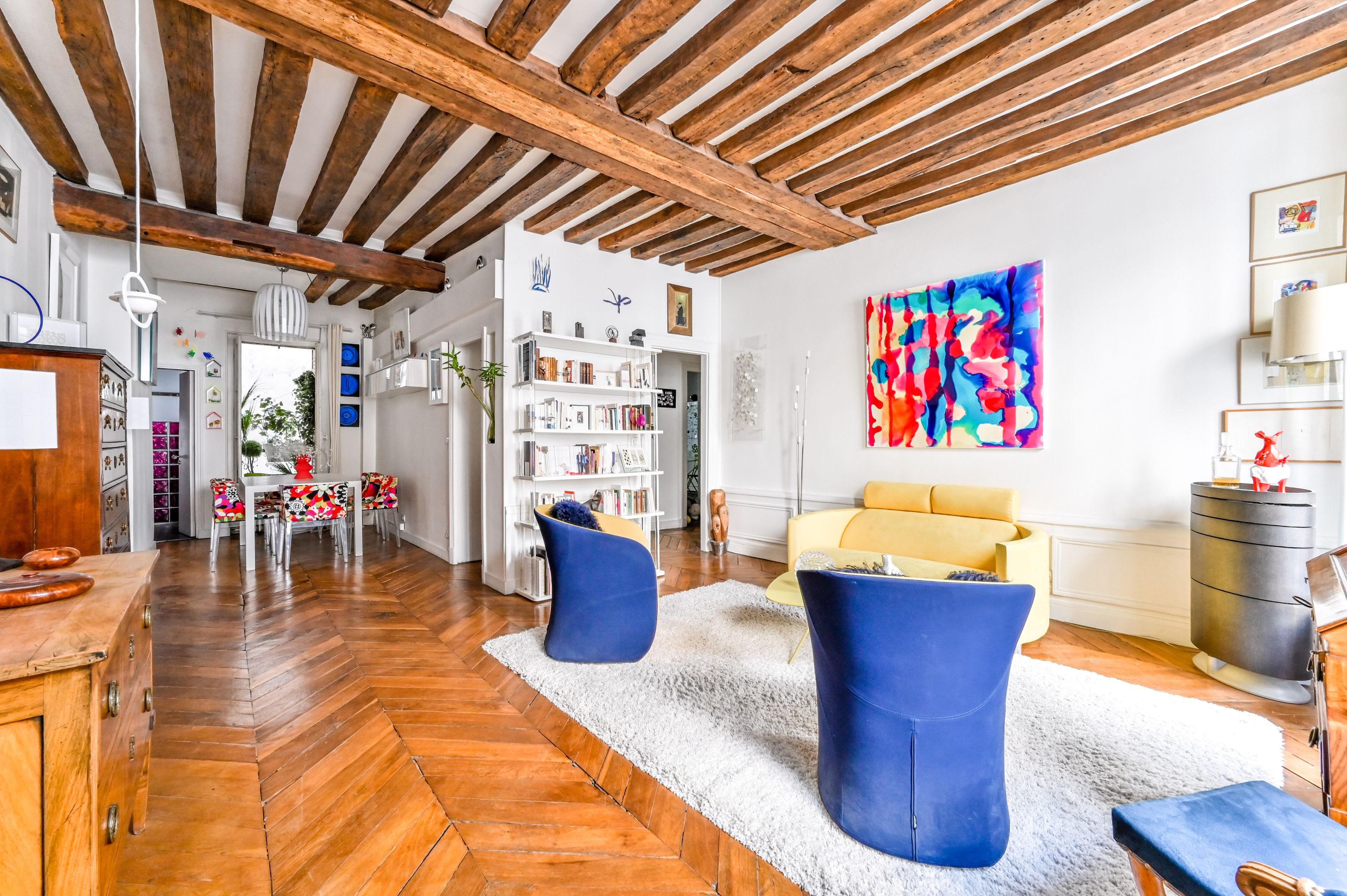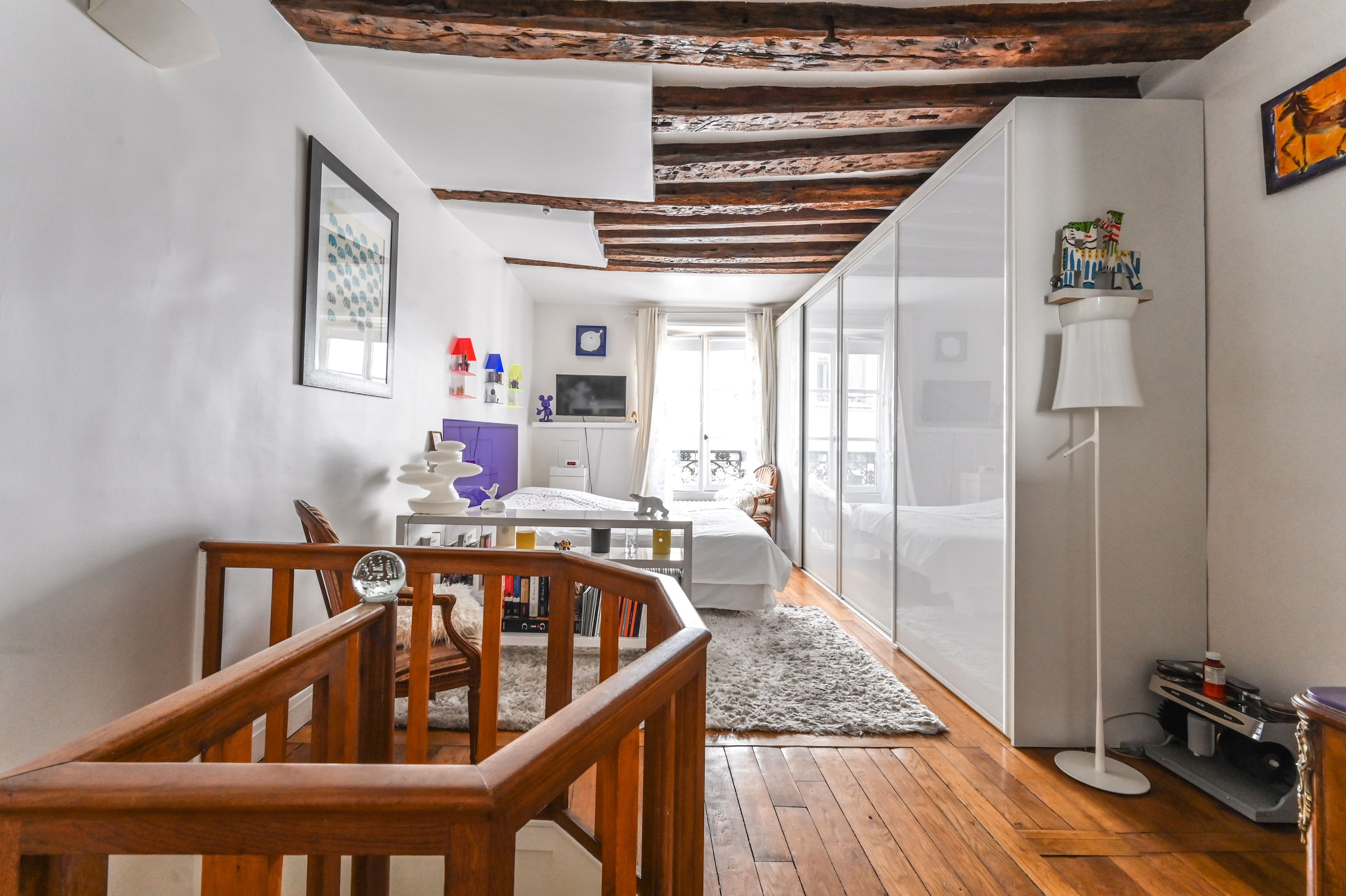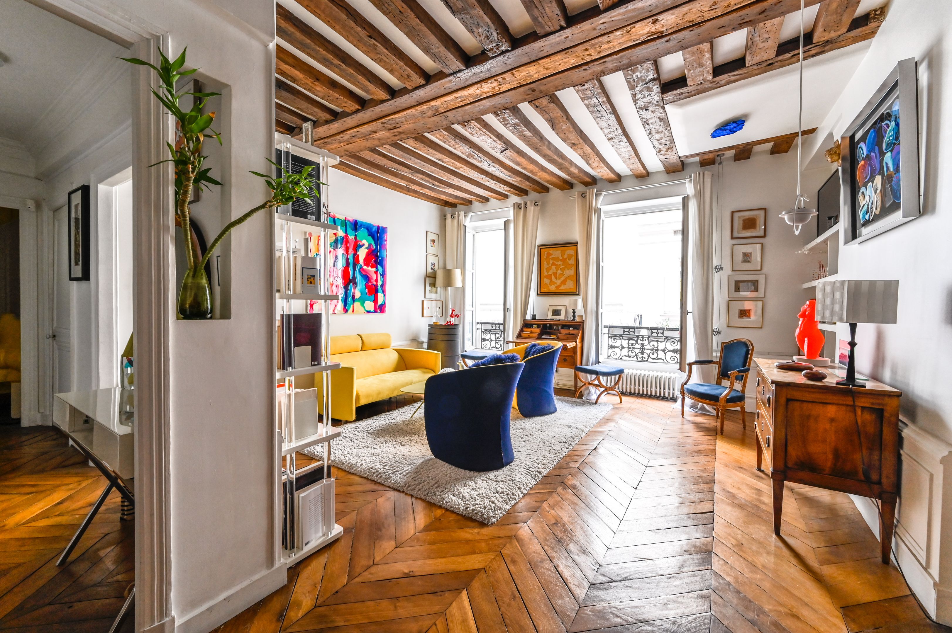 Immeuble fin XVIIIe aux parties communes soignées, appartement en duplex aux 2ème et 3ème étages desservis par escalier, bénéficiant de beaux volumes et du charme de l'ancien (poutres apparentes et parquet point de Hongrie).