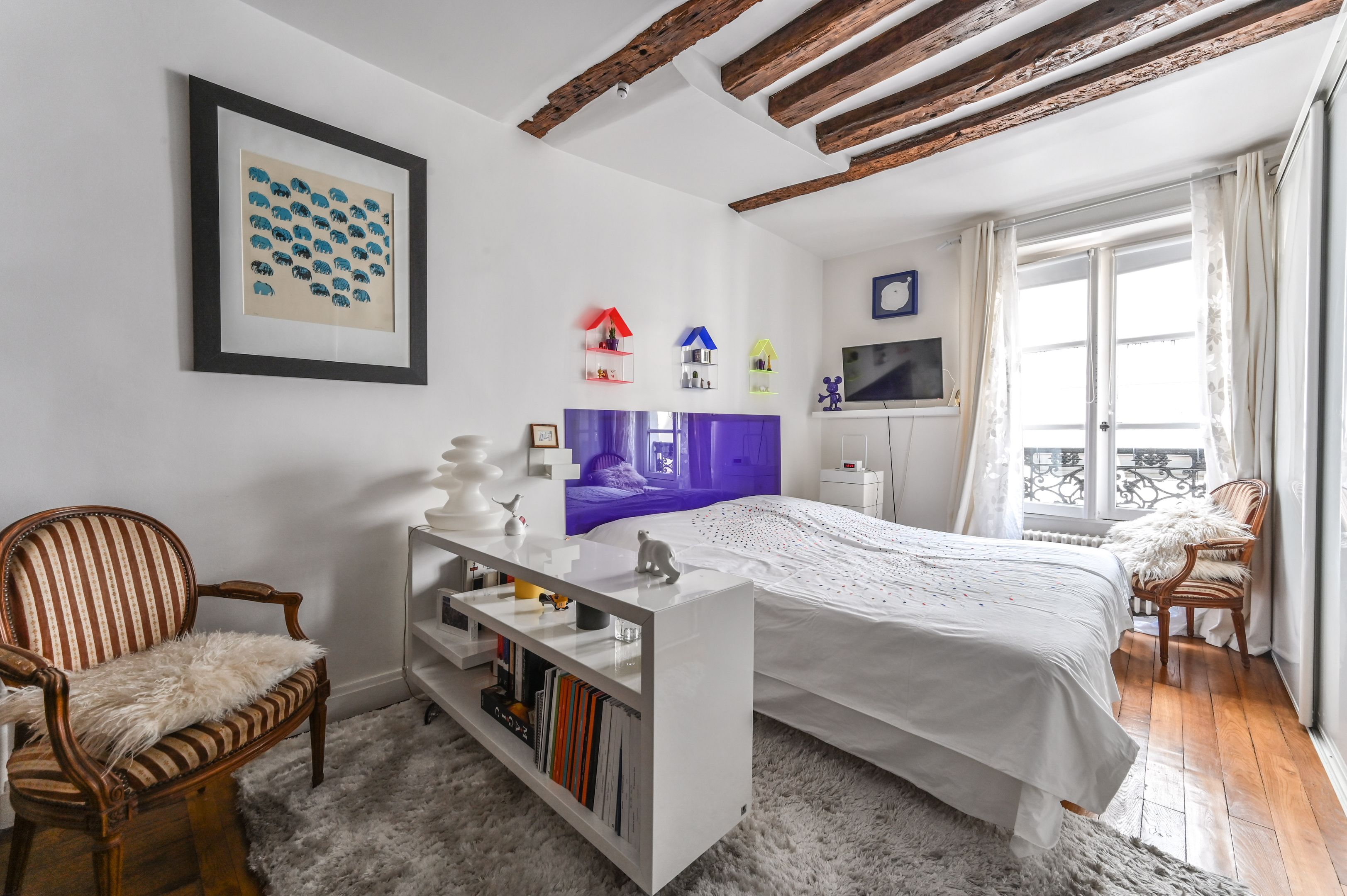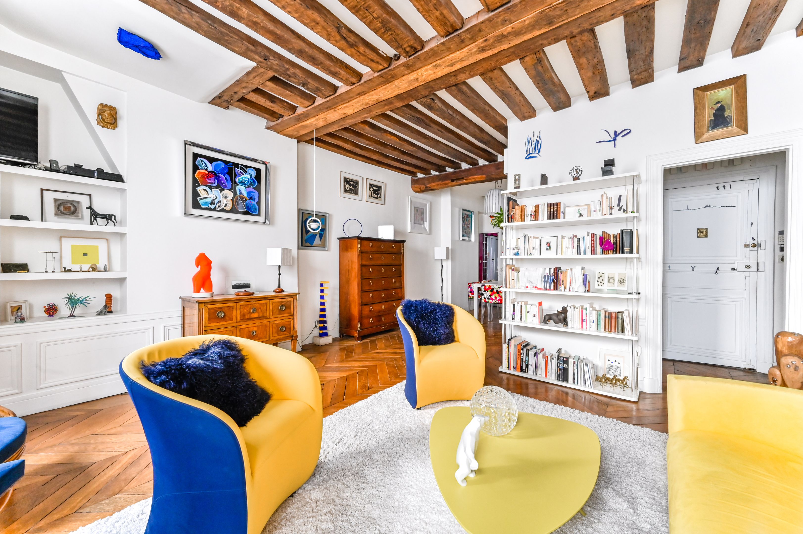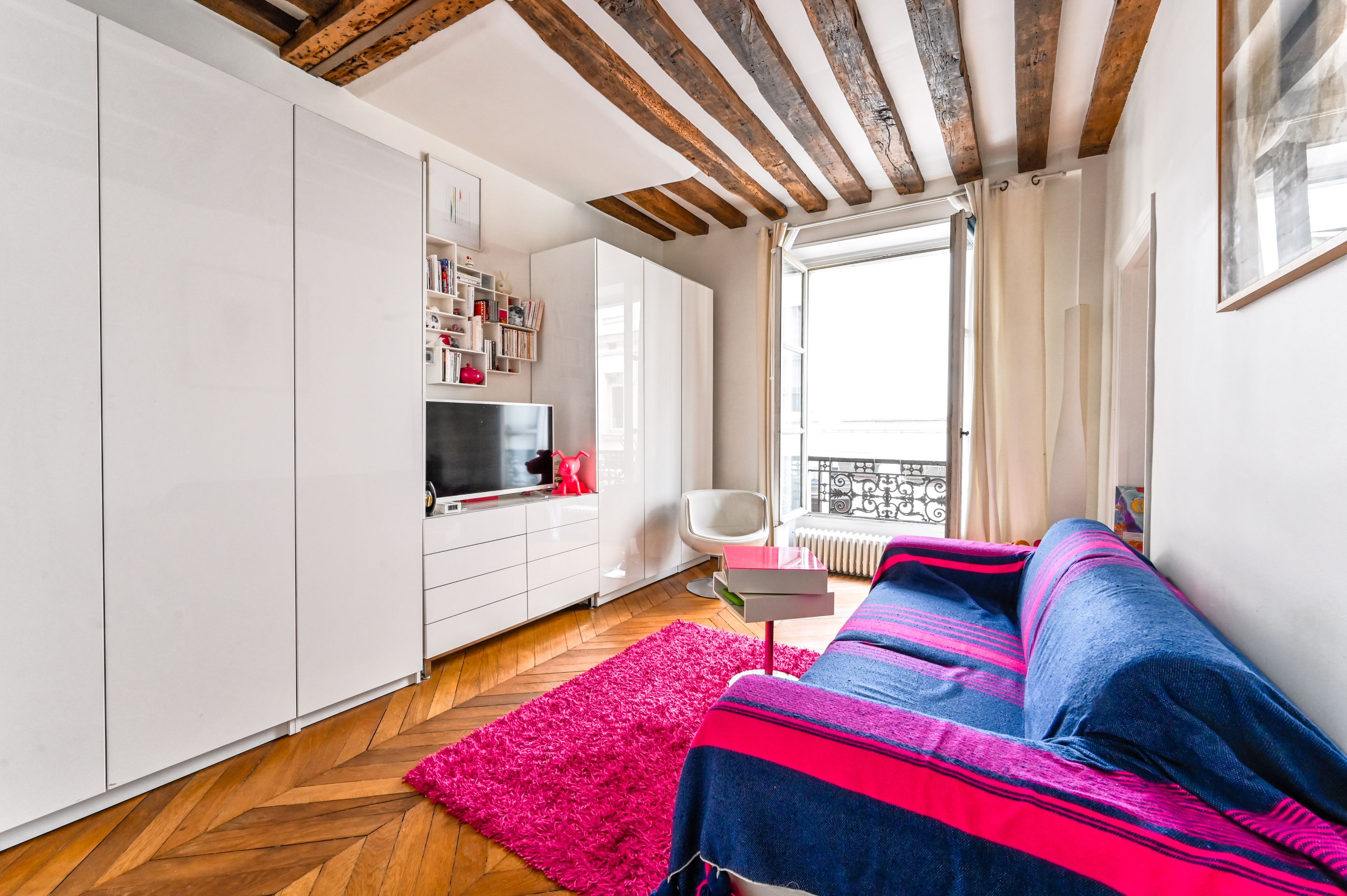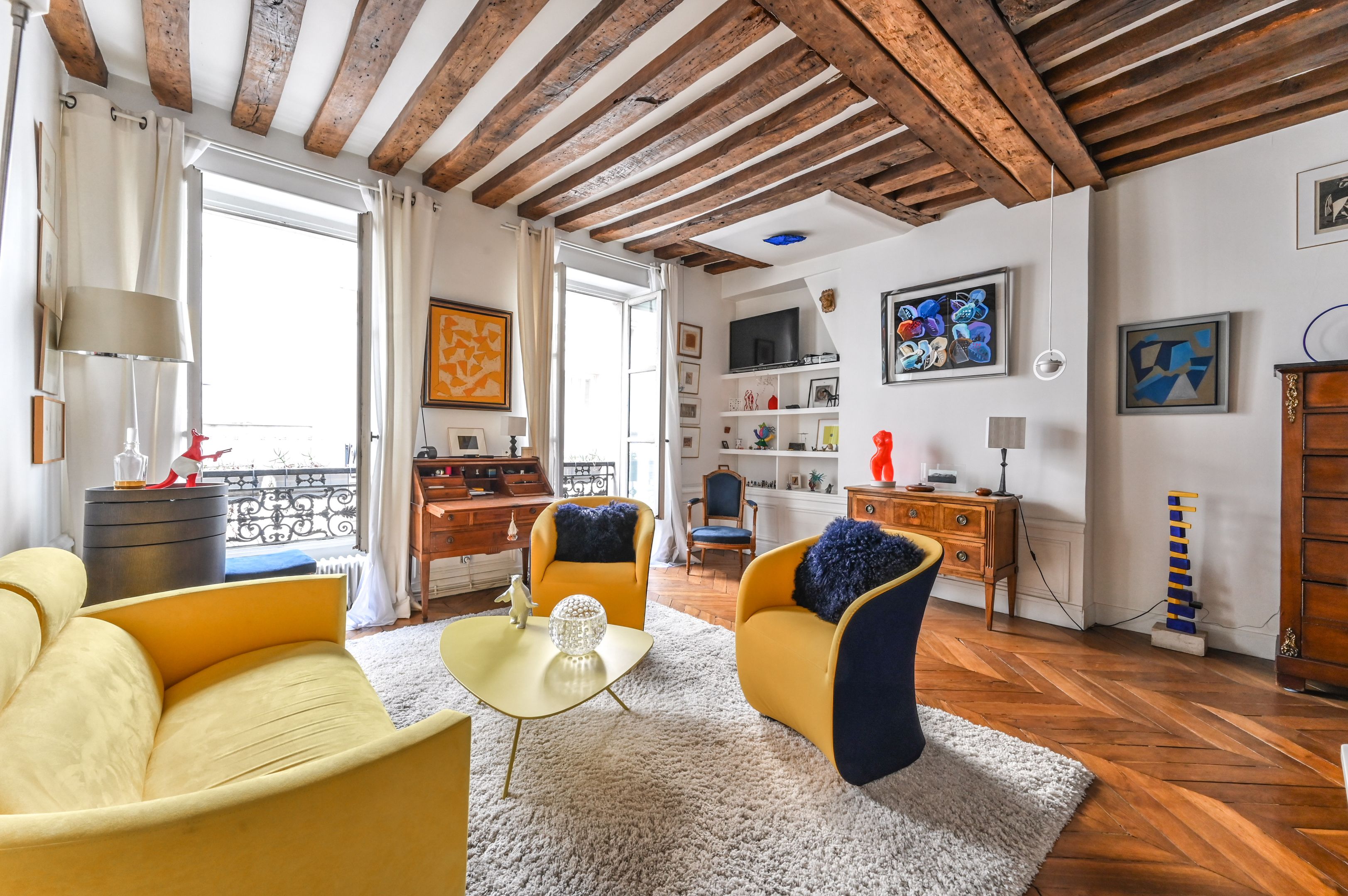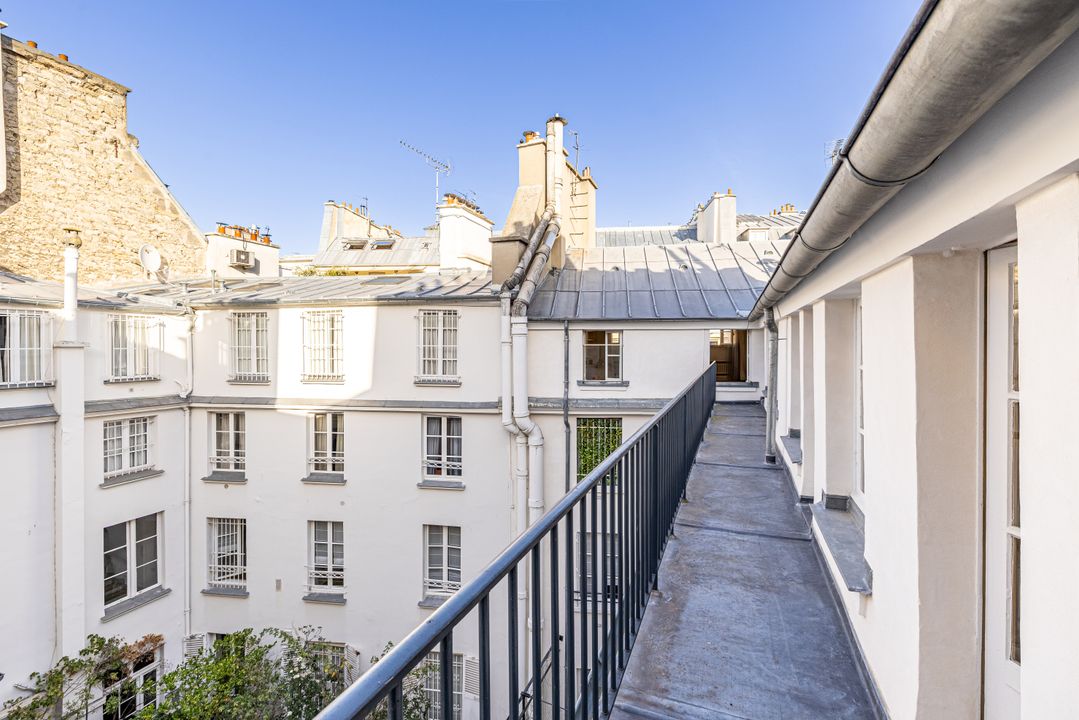 Immeuble fin XVIIIe aux parties communes soignées, appartement en duplex aux 2ème et 3ème étages desservis par escalier, bénéficiant de beaux volumes et du charme de l'ancien (poutres apparentes et parquet point de Hongrie).
