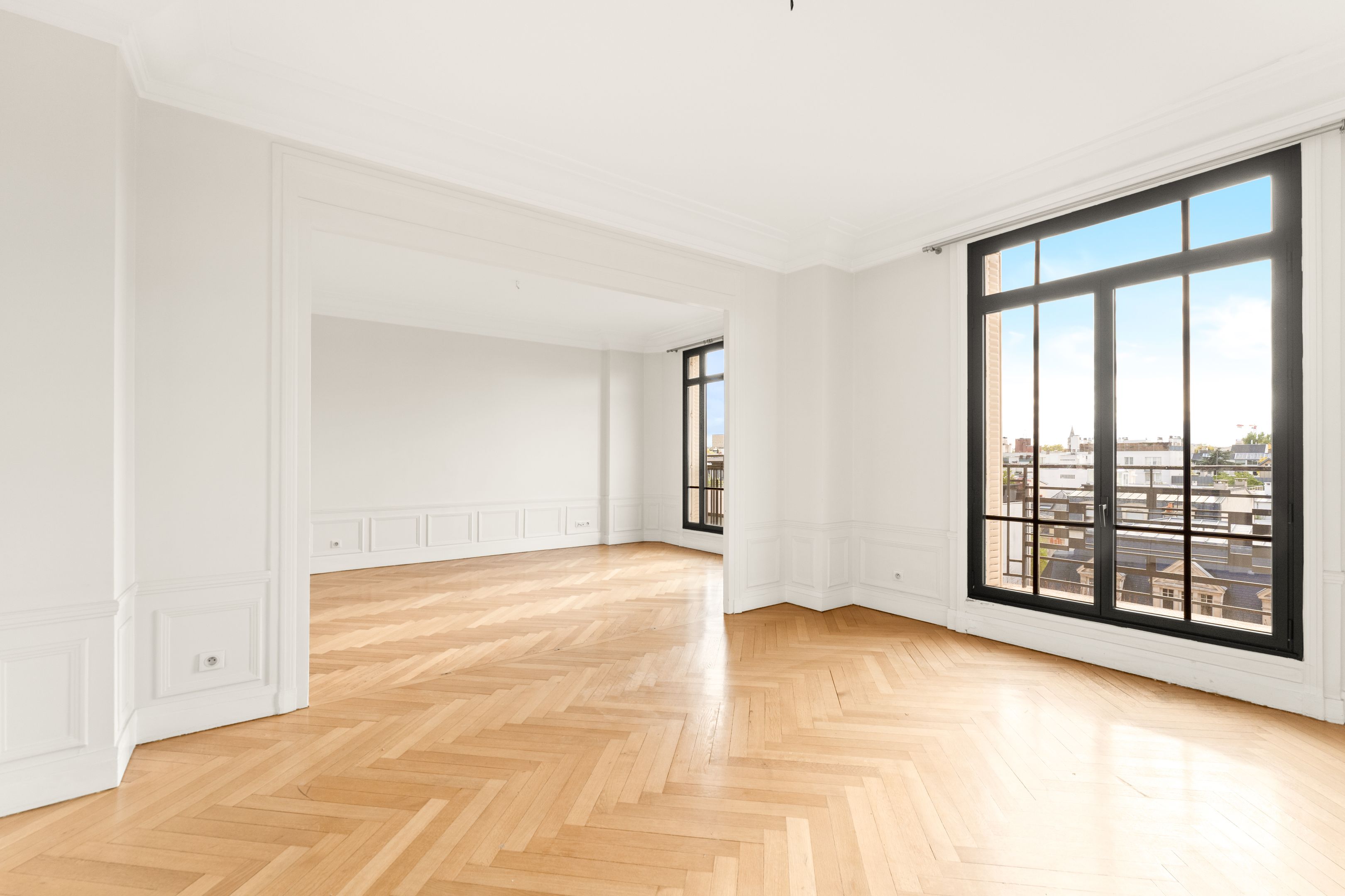 Neuilly - Place du Duc d'Orléans, idéalement situé dans un magnifique immeuble Art Déco sécurisé de haut standing et dont les parties communes ont été récemment rénovées, appartement de 93,5 m² loi Carrez situé au 6ème étage avec ascenseur, traversant et ensoleillé. Entrée, double séjour, 2 chambres, salle de bains, toilettes et rangements. Cave