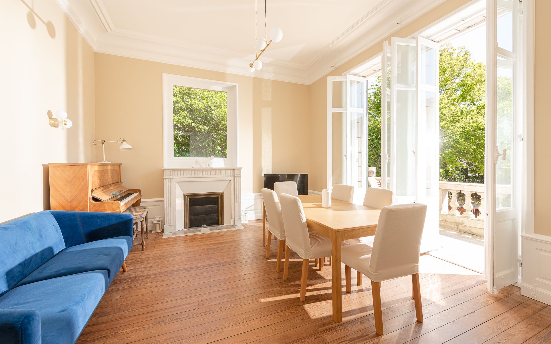 Au sein d'une demeure prestigieuse construite par le célèbre architecte biarrot Gustave Huguenin, à l'origine de la construction de la Villa d'Ilbarritz, appartement de 5 pièces en rez-de-chaussée d'une surface de 126 m², quadruple exposition. Entrée, séjour doté d'une double exposition avec balcon donnant sur jardin. 2 chambres très au calme, 3 salles d'eau avec toilettes, 2 bureaux vitrés. Faisabilité validée et chiffrée pour l'aménagement d'une cuisine ouverte sur séjour:salle à manger. Espaces modulables et fort potentiel pour de l'aménagement résidentiel ou l'exercice d'une profession libérale. Jardin d'agrément en jouissance exclusive de 600 m2, partie piscinable à l'arrière, implantation possible d'un garage couvert, 6 places de stationnements supplémentaires, cave de 15 m2. L'annonce comprend une photo non contractuelle (cuisine home-staging)