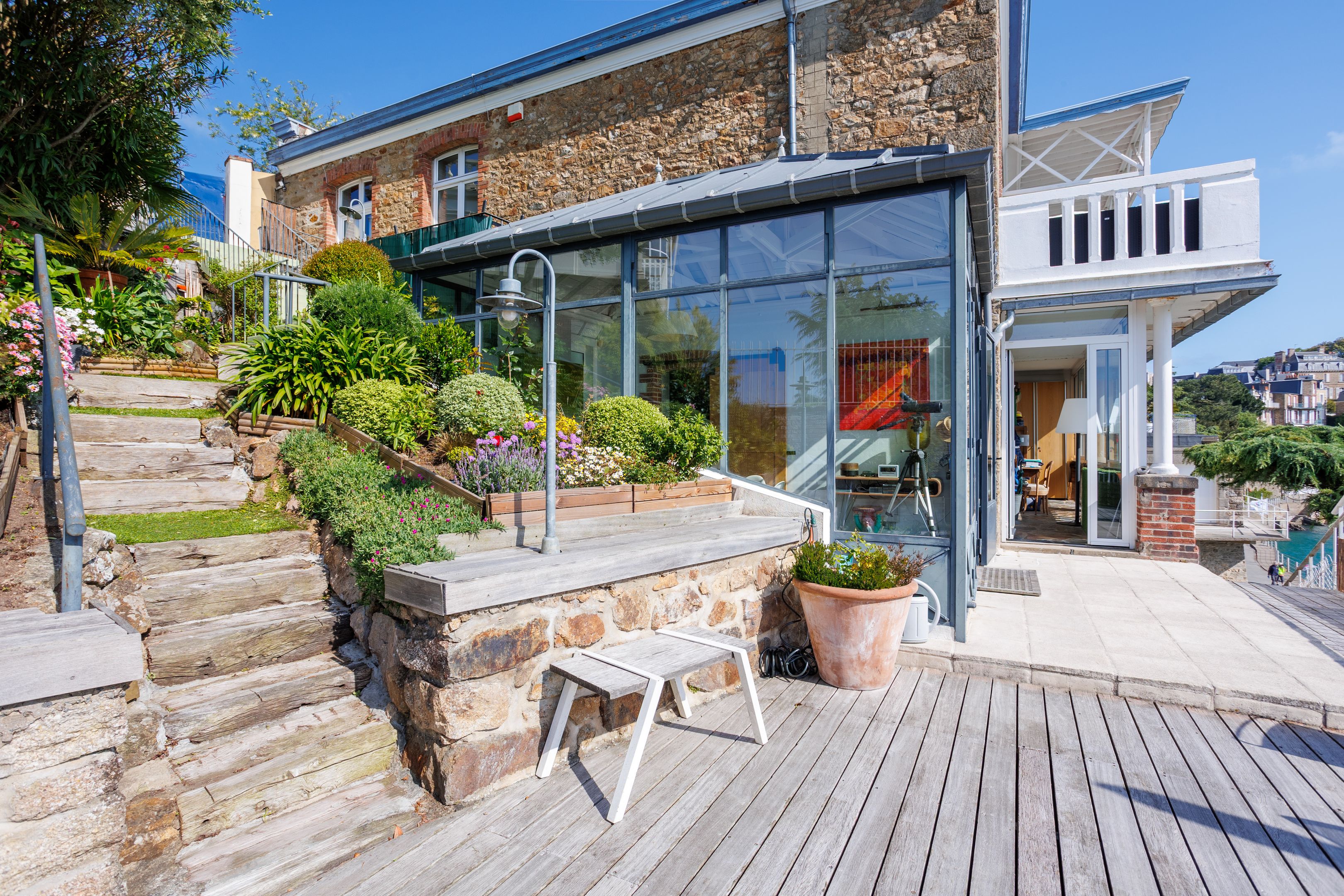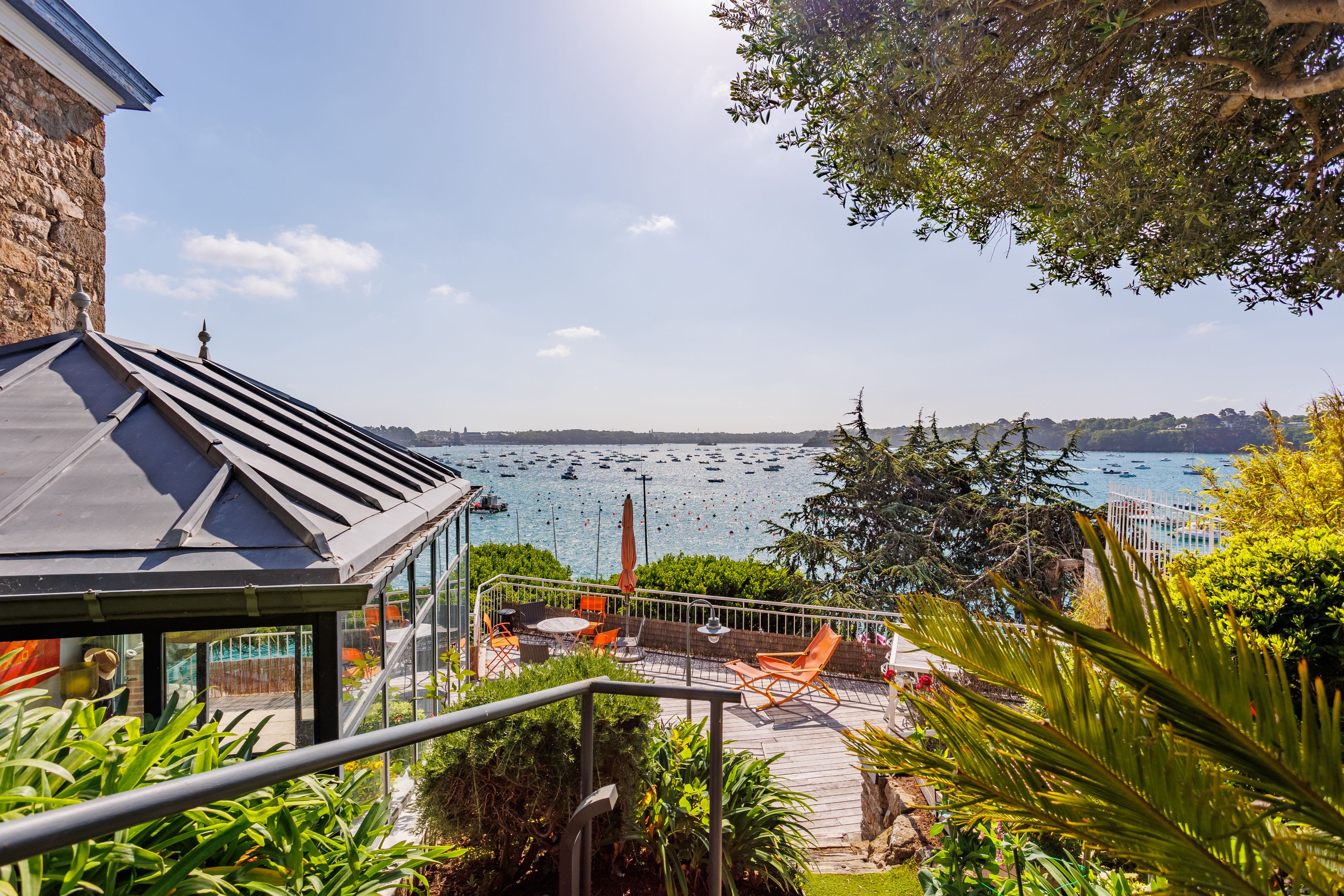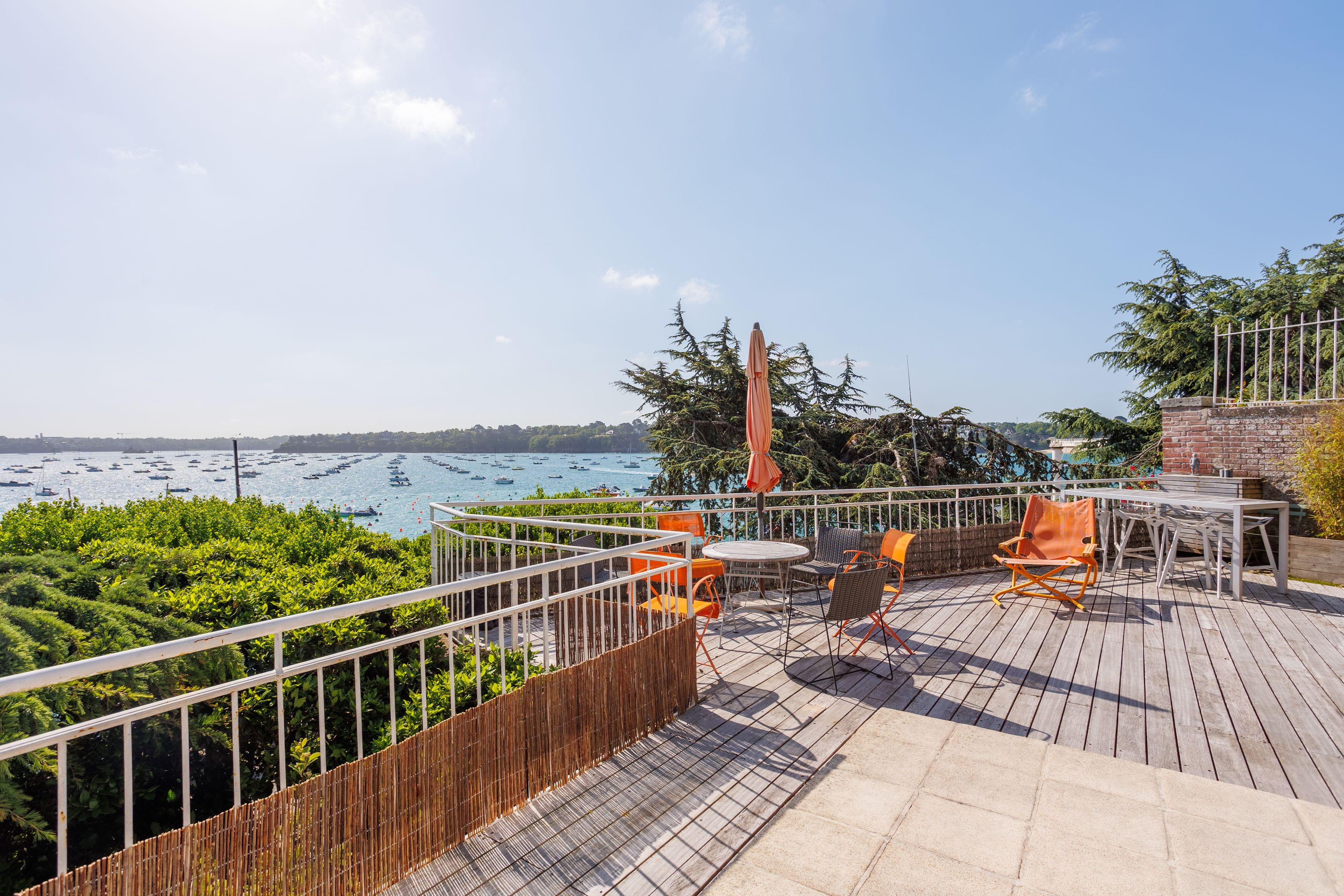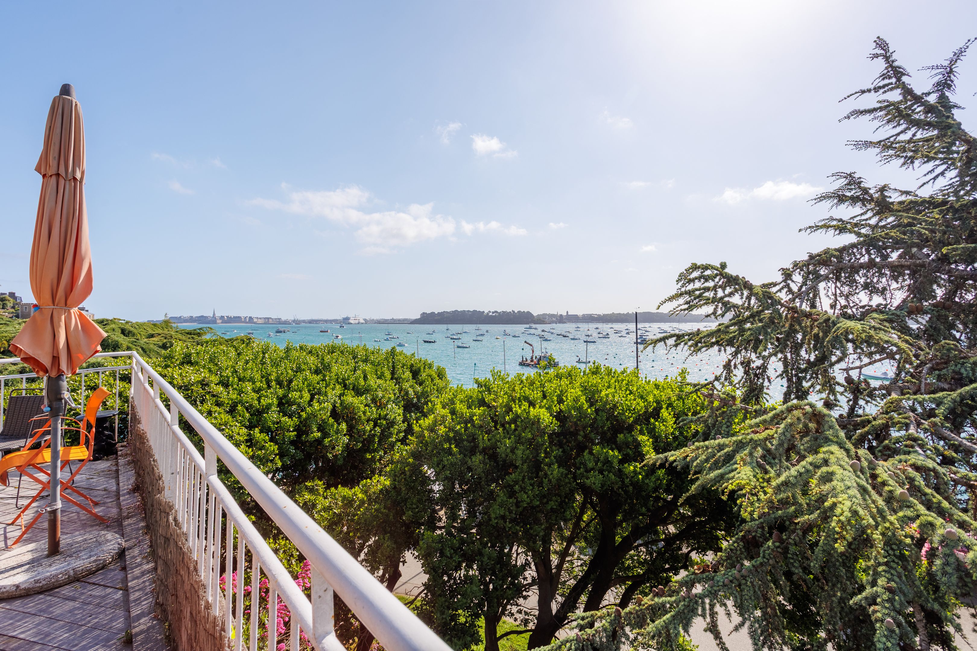 À proximité immédiate des commerces du centre-ville et des plages, en surplomb du port de plaisance, dans une villa dinardaise calme et bien entretenue. Rare appartement front de mer d'une surface totale de 120 m² (107 m² Loi Carrez) avec accès indépendant bénéficiant d'un emplacement privilégié, d'une superbe vue et d'un extérieur exceptionnel de près de 140 m². Entrée, agréable séjour parqueté dominant la baie du Prieuré et profitant du confort d'un véritable poêle à bois, salle à manger vitrée baignée de lumière, cuisine attenante, trois chambres dont deux côté mer profitant de l'orientation est, trois salles d'eau, buanderie. Grande terrasse ensoleillée offrant une vue panoramique extraordinaire à 180° depuis le Prieuré jusqu'à Saint-Malo et le large. Très bel espace végétalisé et fleuri. Abri à vélos. Accès direct à la promenade du Clair de Lune, l'espace de baignade et le port situés en contrebas.
