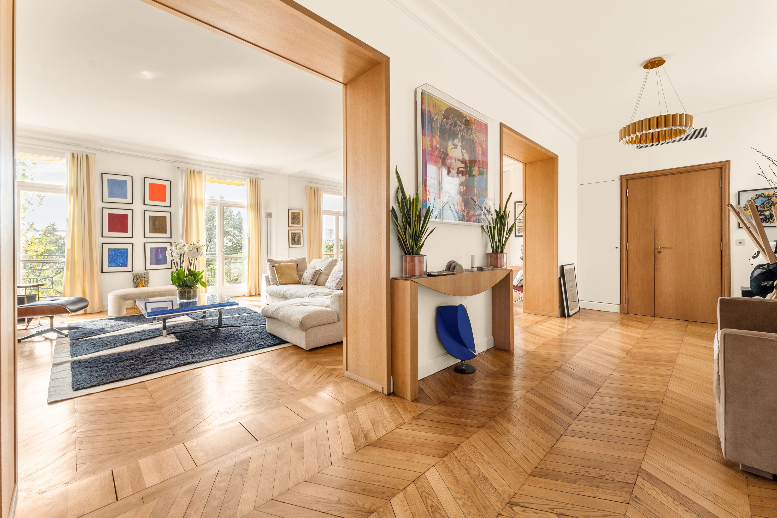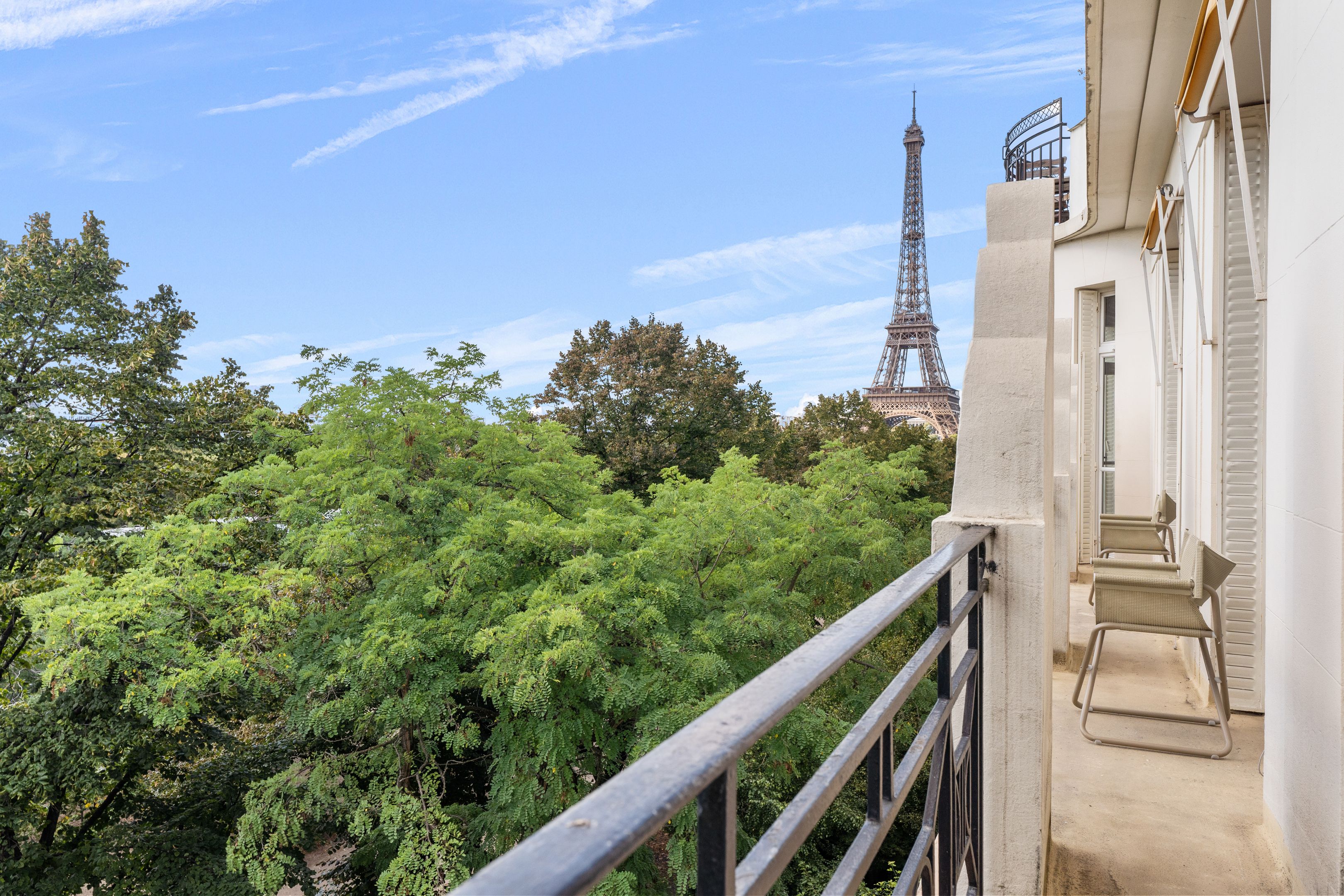 Appartement art déco avec balcon et vue sur le Champ de Mars et la Tour Eiffel. Vaste séjour ensoleillé, salle à manger et cuisine indépendante. Grande suite parentale et deux chambres enfants.