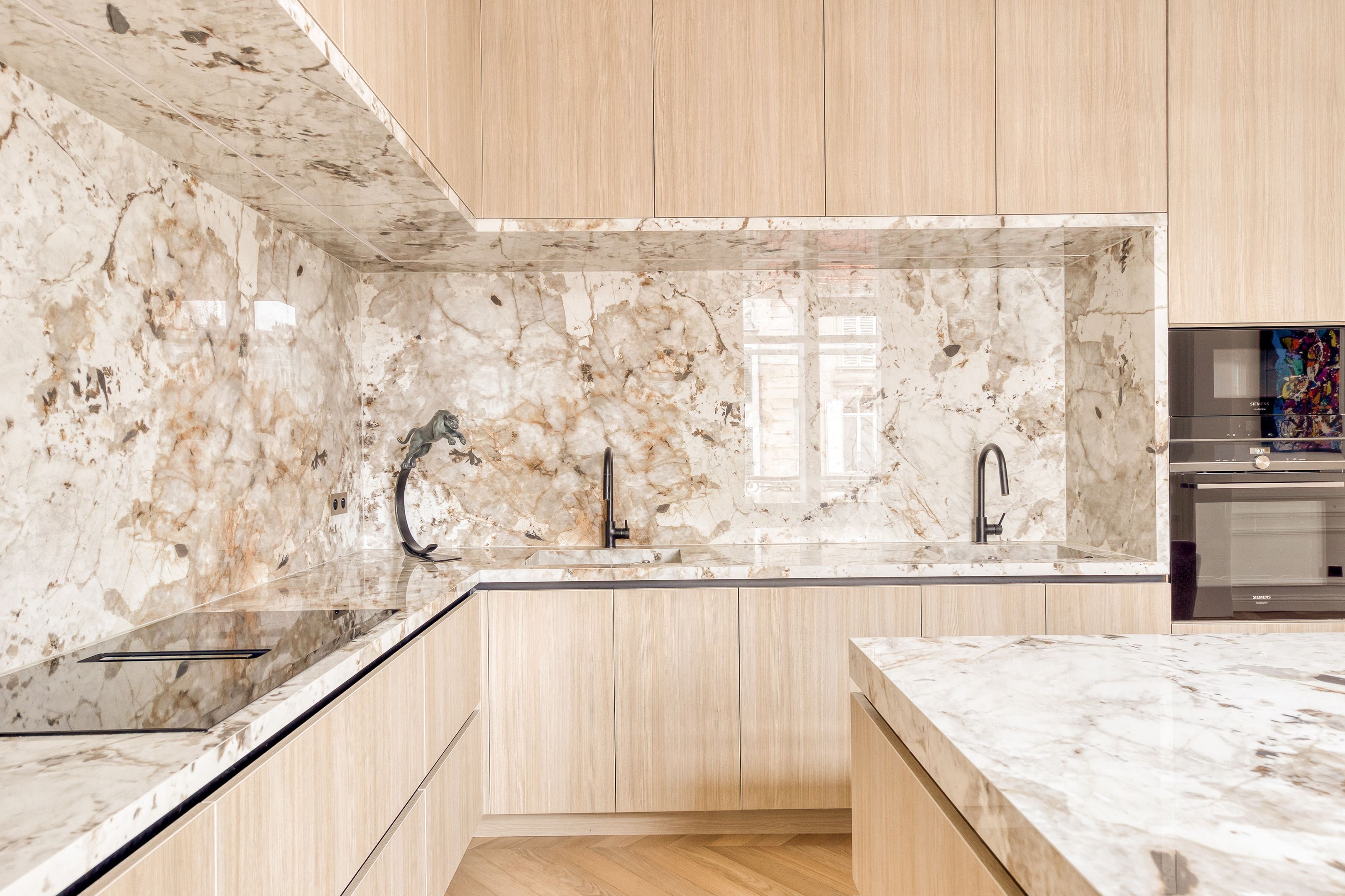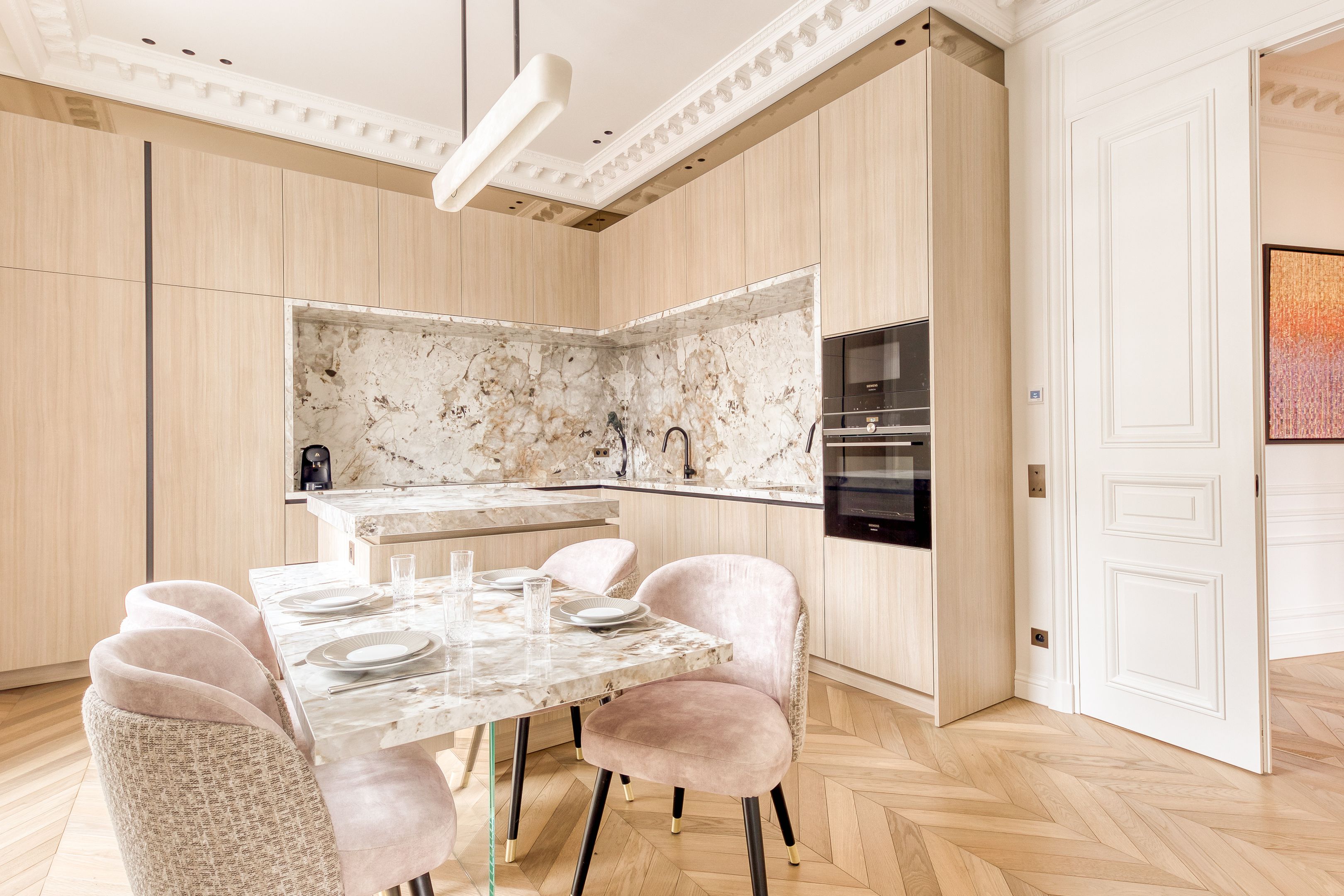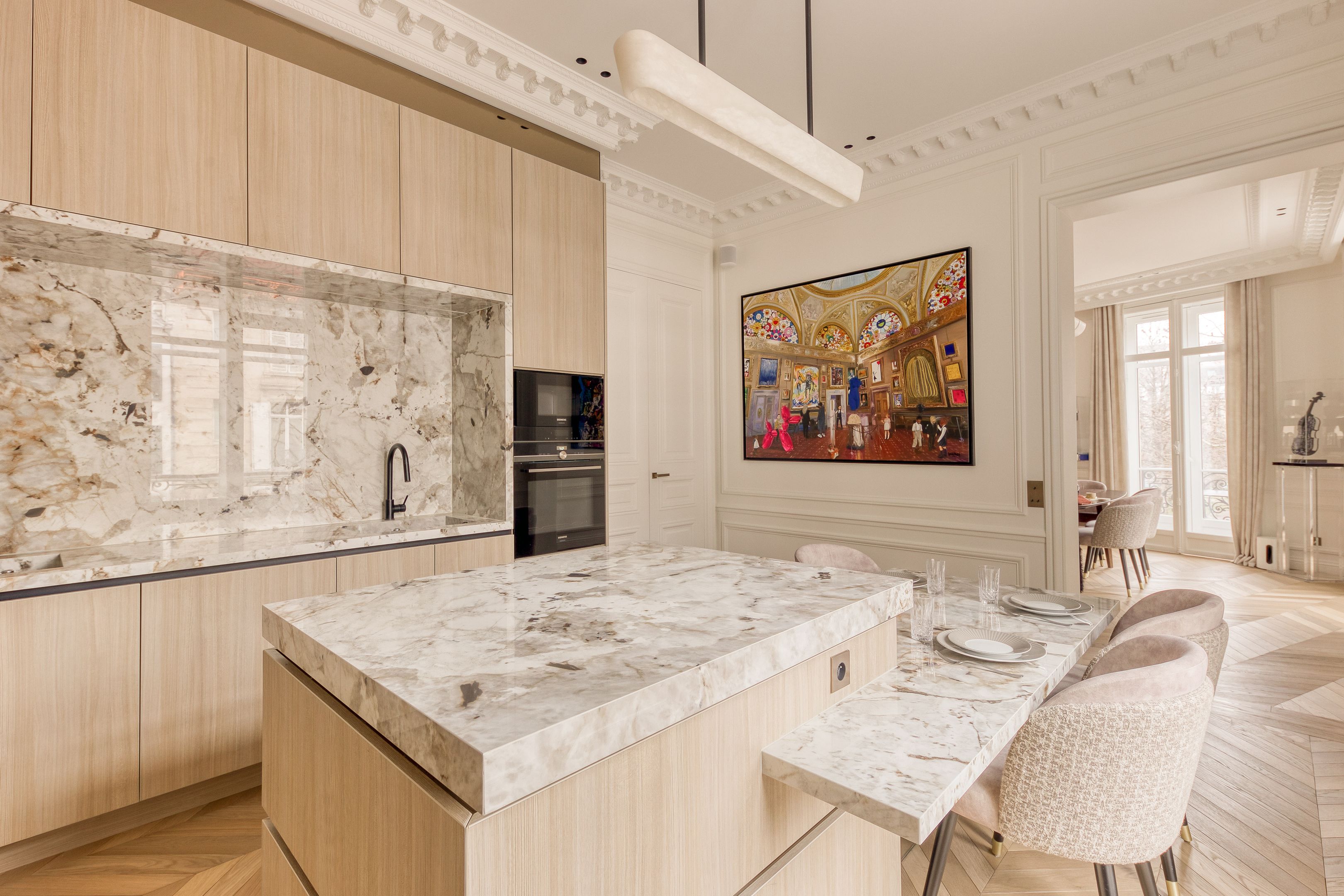 Un écrin de prestige Place du Maréchal Juin. Cet appartement de 200 m² mêle volumes spacieux, décoration artistique et prestations haut de gamme. Deux master suites avec salles de bains en marbre, salon raffiné orné d’œuvres d’art et cuisine hautement équipée.