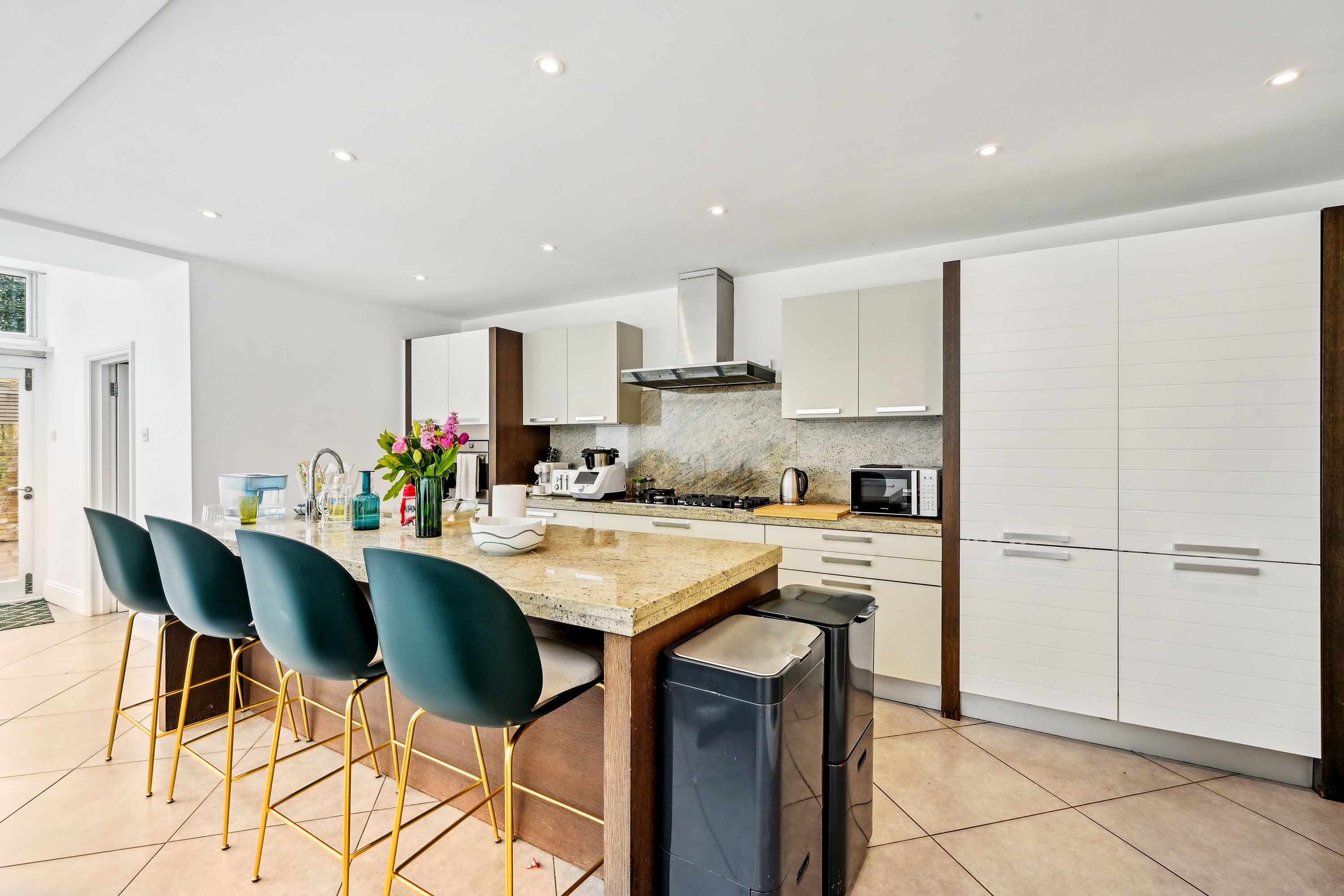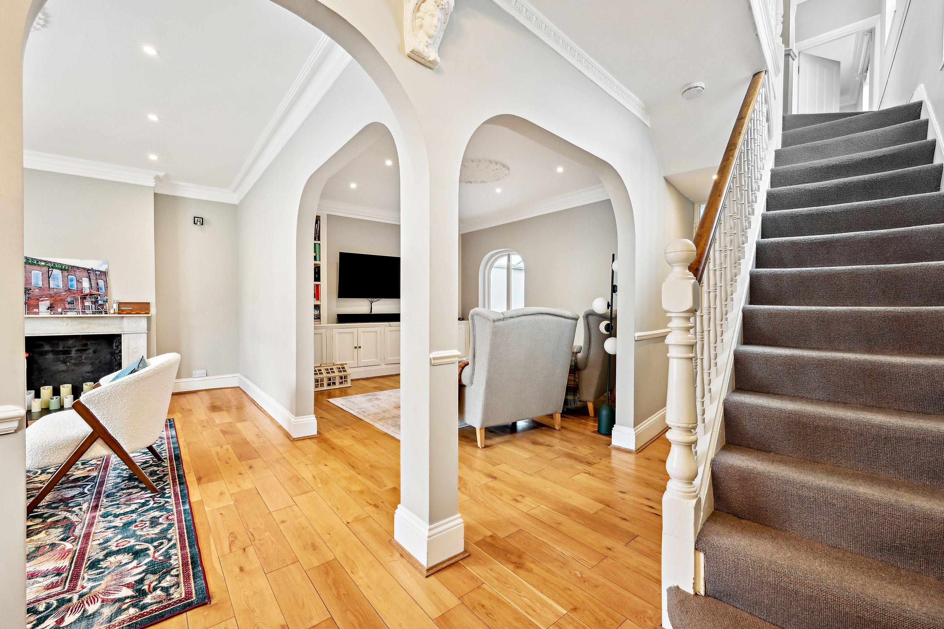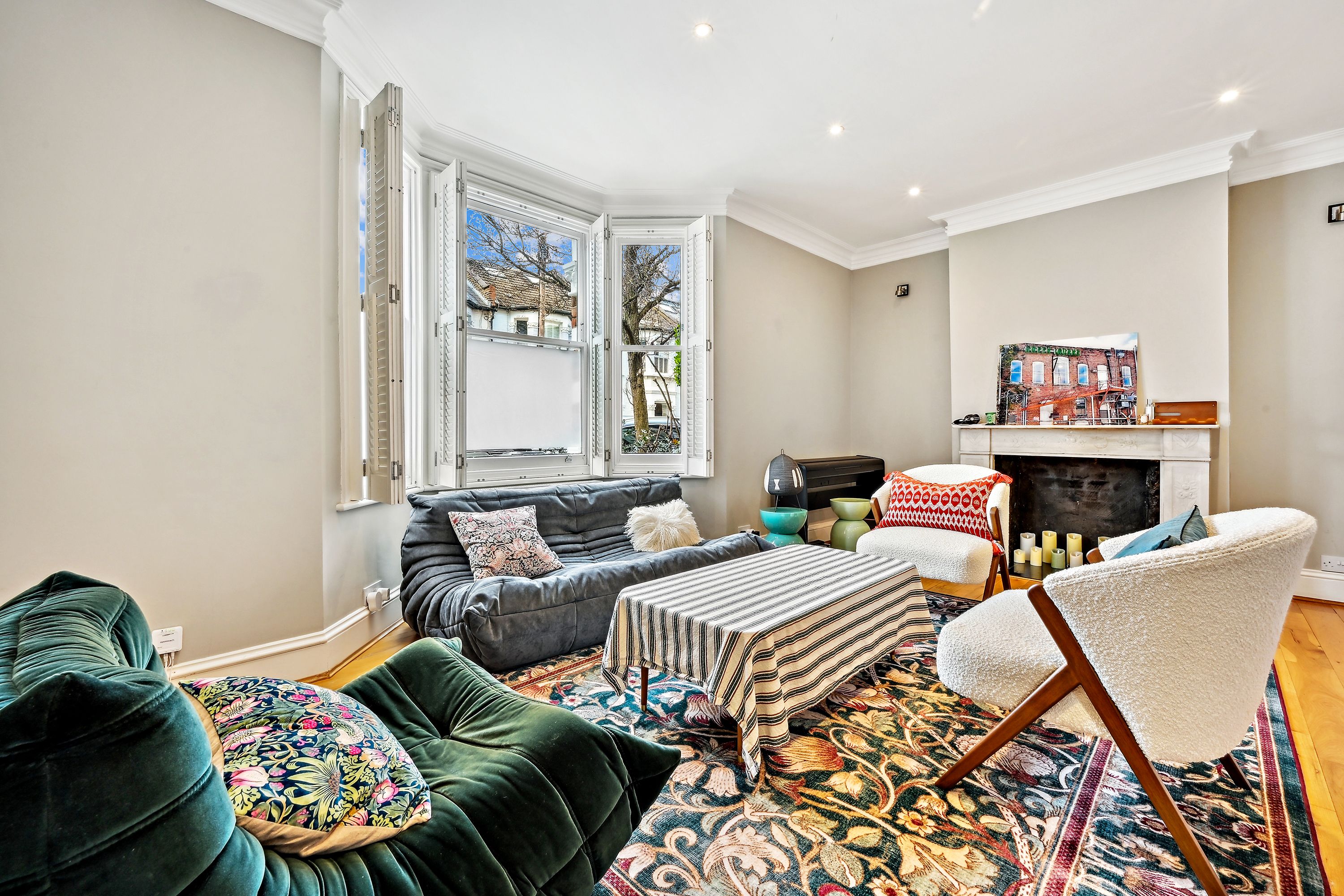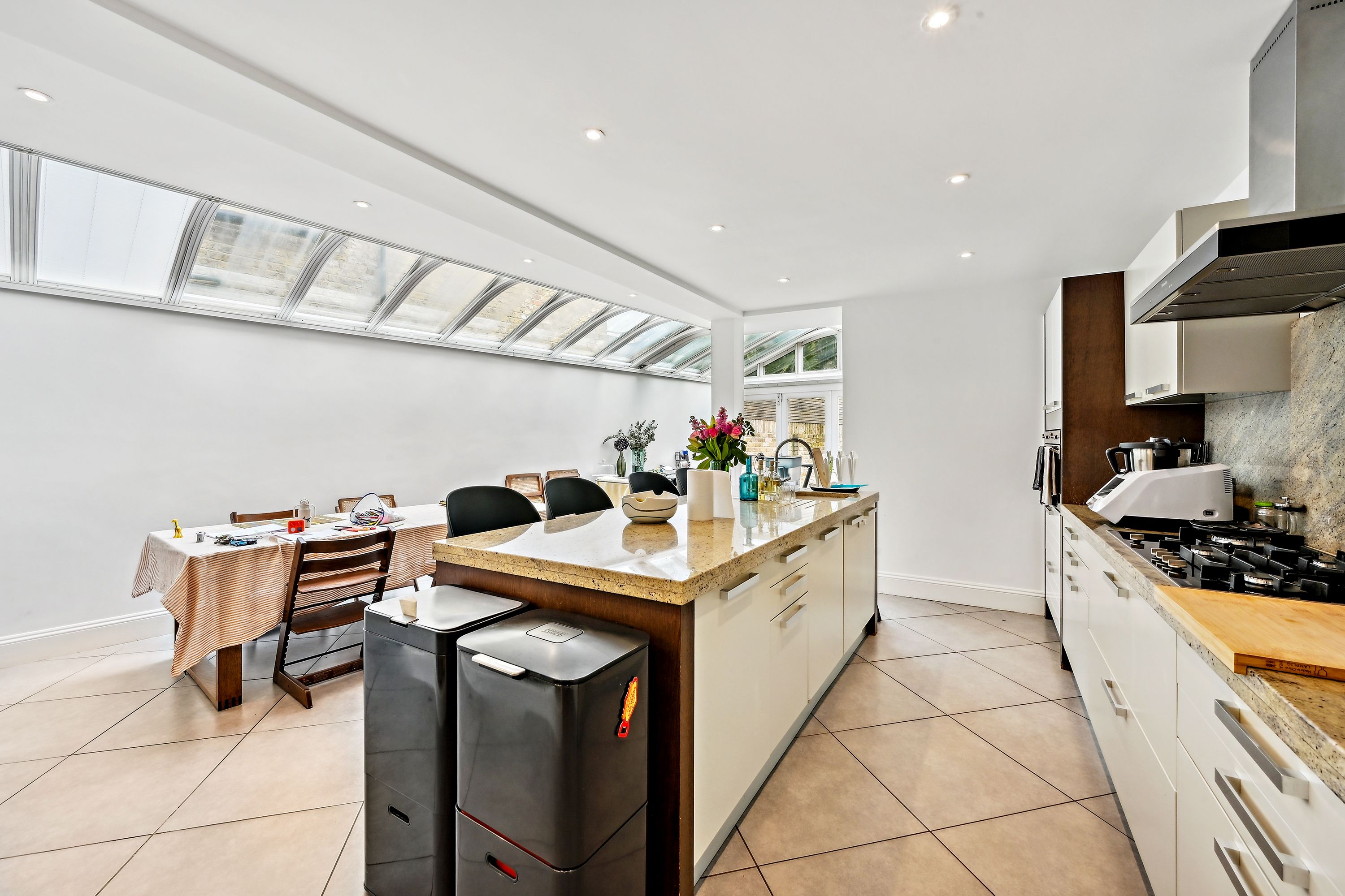 This property, located at the end of Narborough Street next to Settrington Road, enjoys a prime position. As an end-of-terrace house, it features bright rooms throughout. The ground floor offers a spacious front reception room with a large bay window, a ceiling rose, and wood flooring. This leads to a versatile room with ample storage, suitable as a second reception room or dining area. The rear hosts a modern kitchen with integrated Miele and Smeg appliances and dining space, along with a separate utility room. Bi-fold doors open to a south-facing garden with artificial grass, perfect for al fresco dining, with street access for bikes and scooters. The first floor has three double bedrooms, one en suite, all with fitted wardrobes, a family bathroom, and a study. The second floor comprises two more double bedrooms and another bathroom.