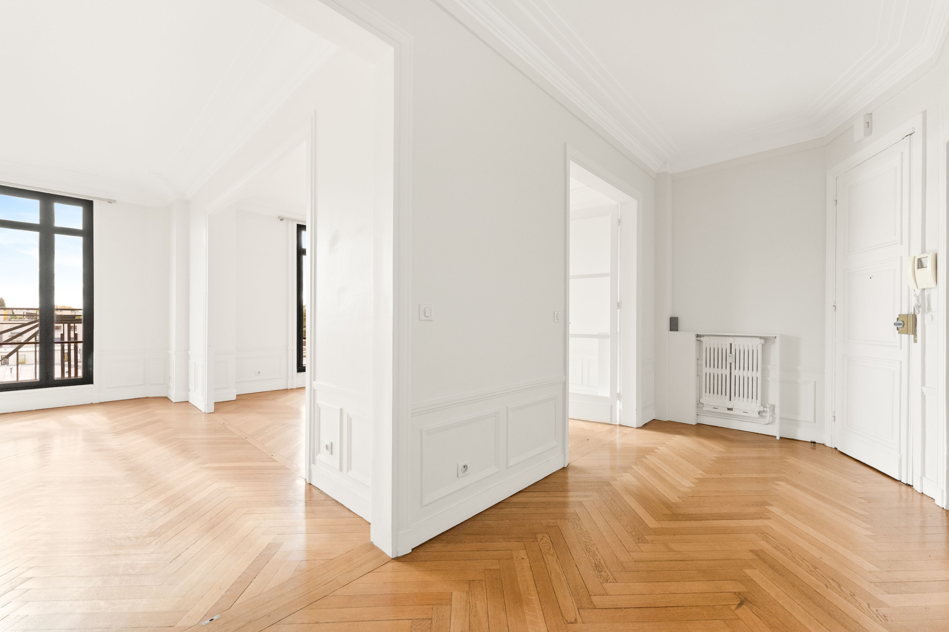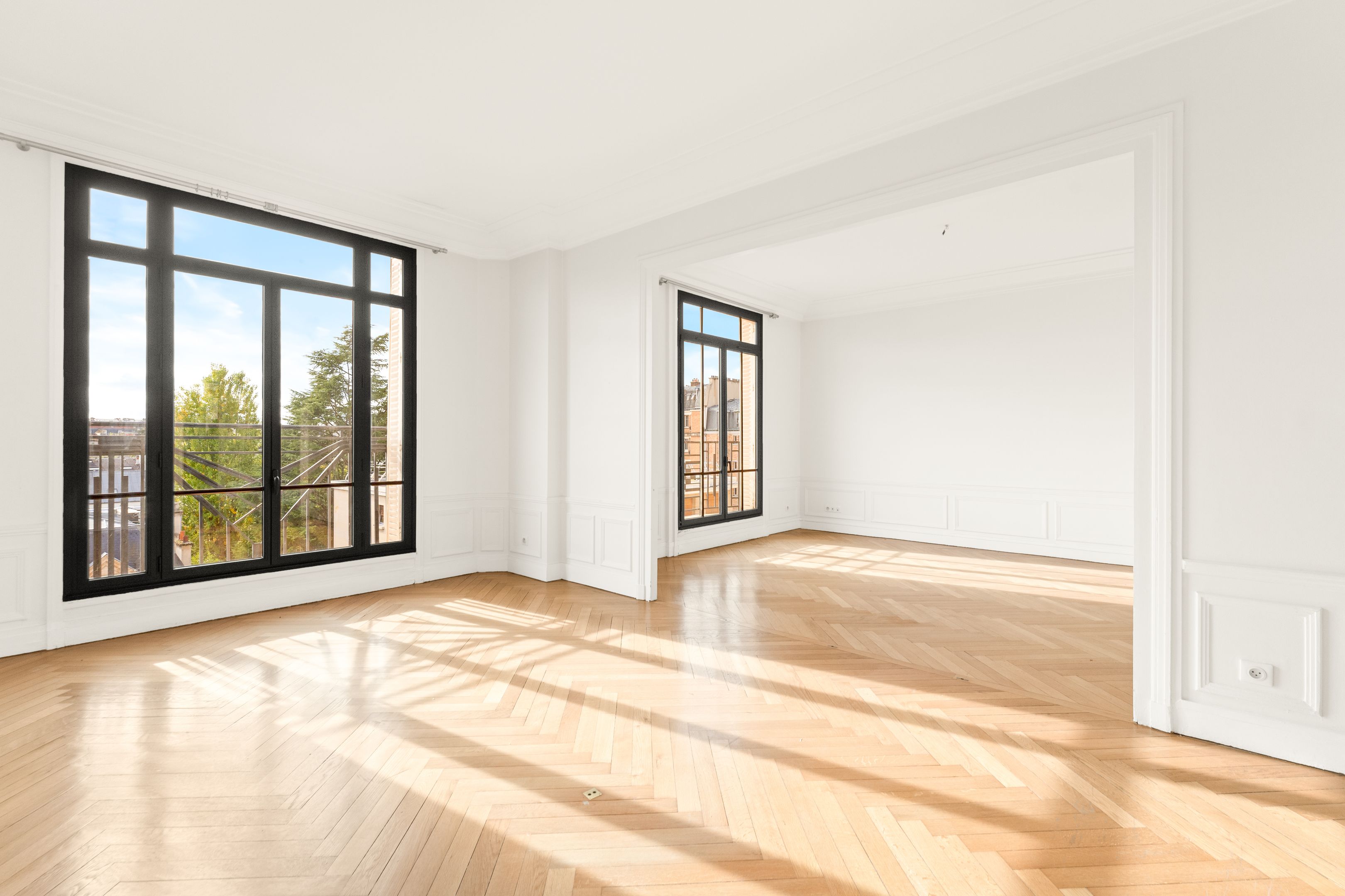 Neuilly - Place du Duc d'Orléans, idéalement situé dans un magnifique immeuble Art Déco sécurisé de haut standing et dont les parties communes ont été récemment rénovées, appartement de 125,5 m² loi Carrez situé au 6ème étage avec ascenseur, traversant et ensoleillé. Galerie d'entrée, double séjour, 3 chambres, salle de bains, salle d'eau, deux toilettes et de nombreux rangements.