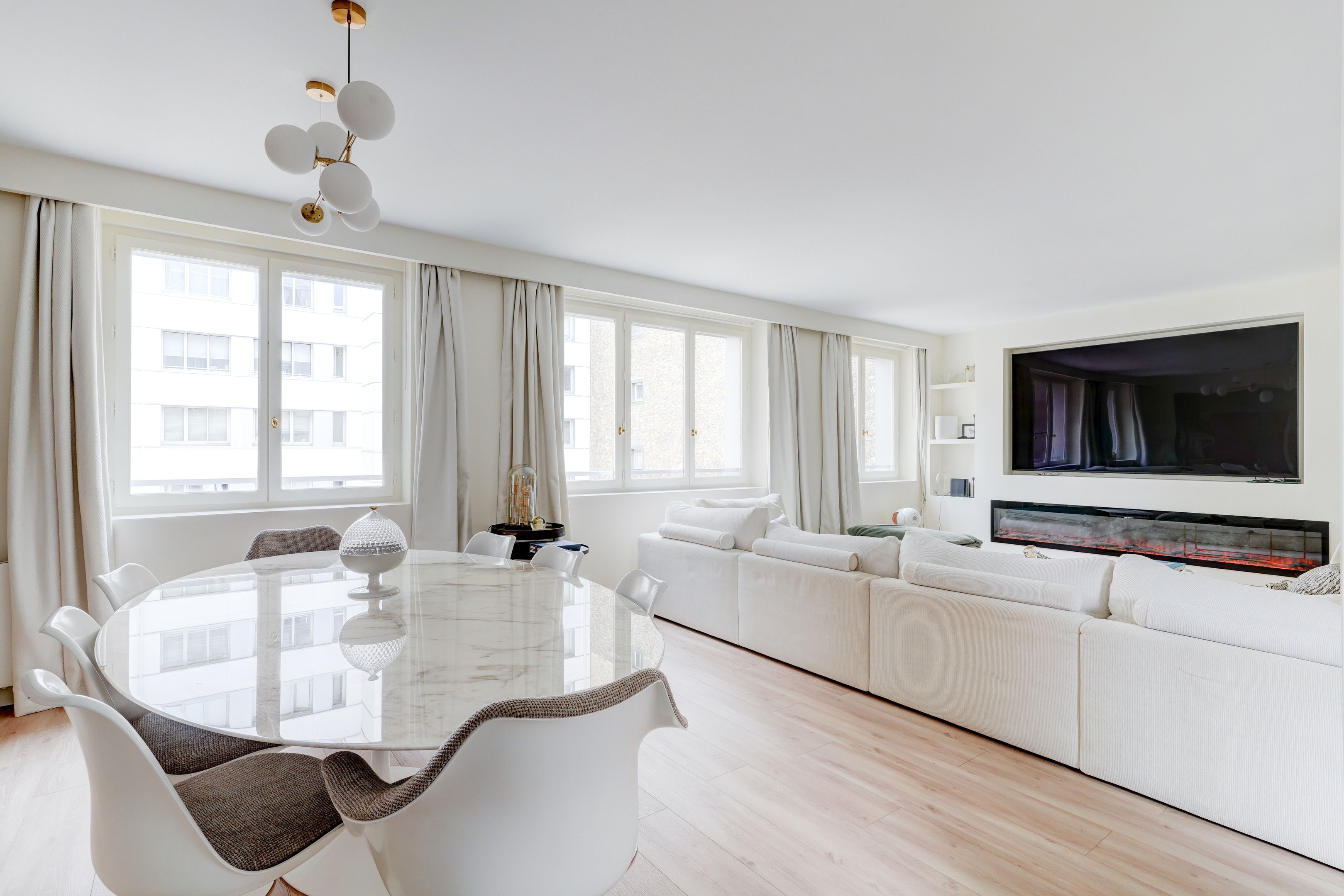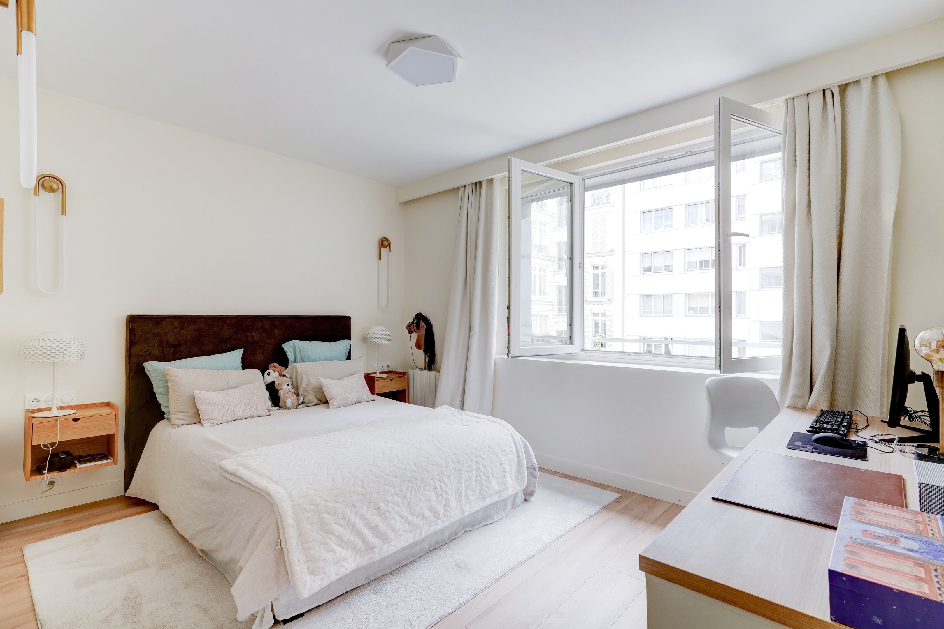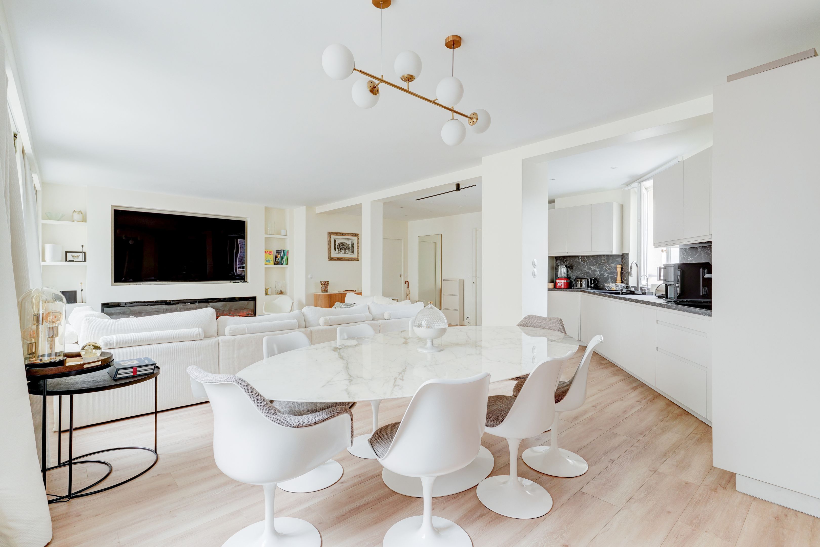 Idéalement situé à deux pas des commerces de la rue de. la Pompe et du lycée Janson de Sailly , appartement lumineux et calme de 134m2 parfaitement rénové dans un esprit contemporain aux prestations de qualité , au 3ème étage , seul sur le palier , d'un immeuble récent . Vaste double séjour avec cuisine à l'américaine équipée et aménagée , cheminée à éthanol, chambre parentale avec dressing et salle de bains (baignoire , douche, toilettes) , deux chambres, dotées chacune d'une salle d'eau, deux toilettes dont un d'invités, nombreux rangements, un cagibi. Deux caves , un box en location accessible directement par ascenseur .