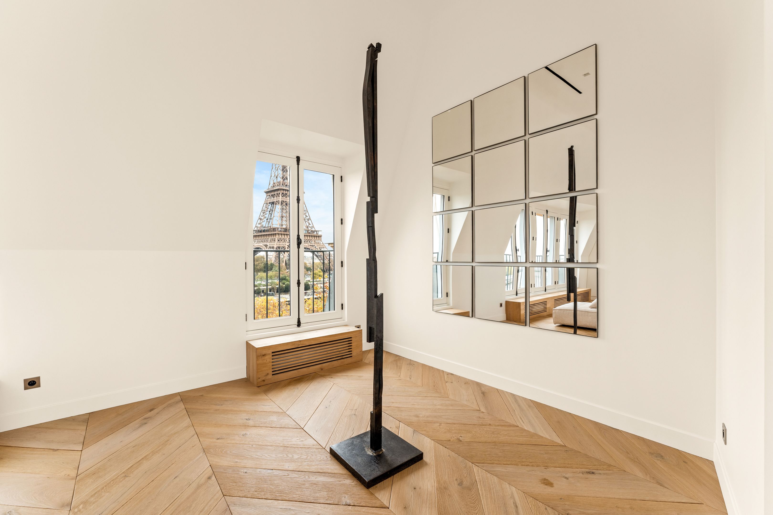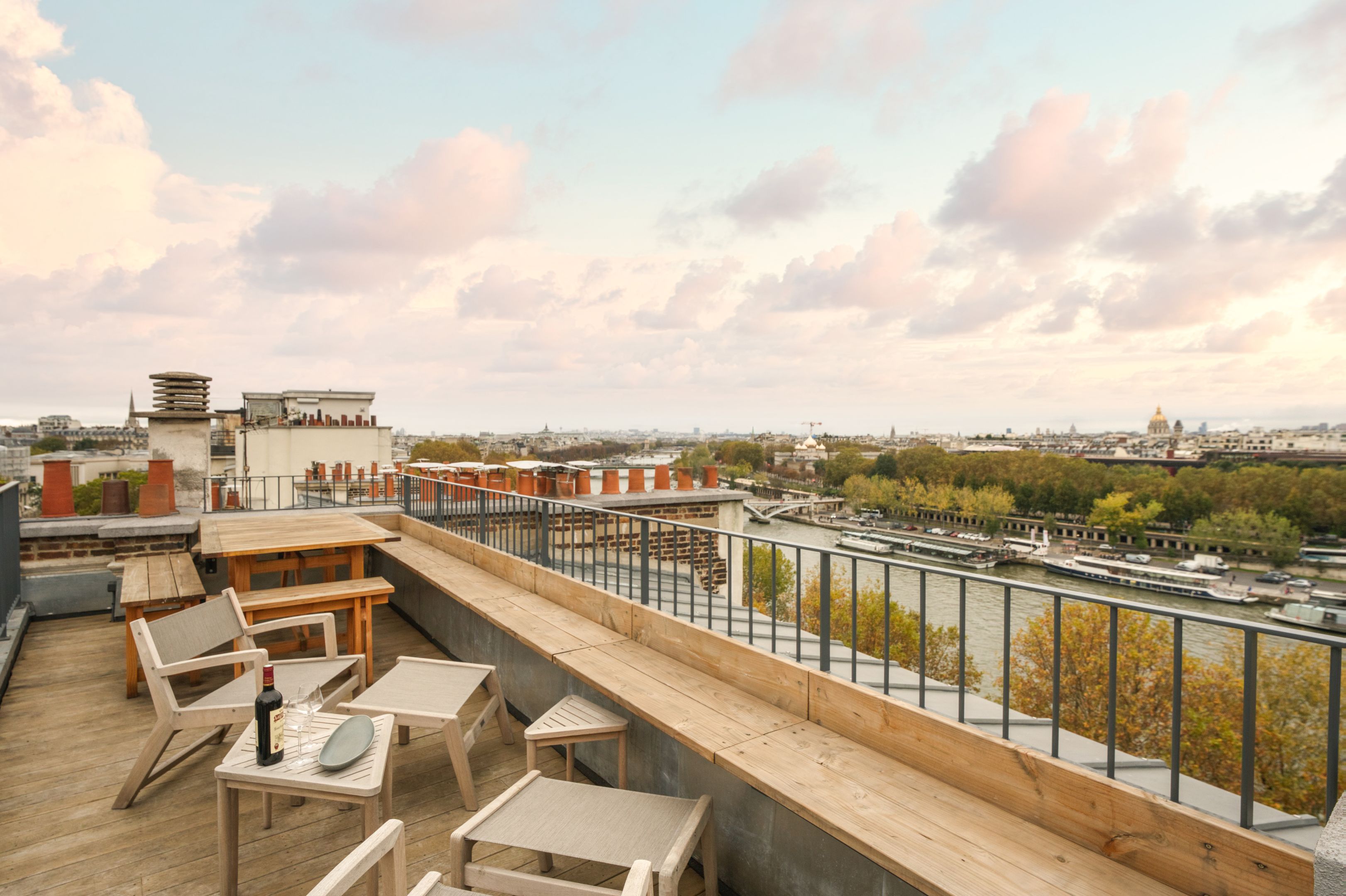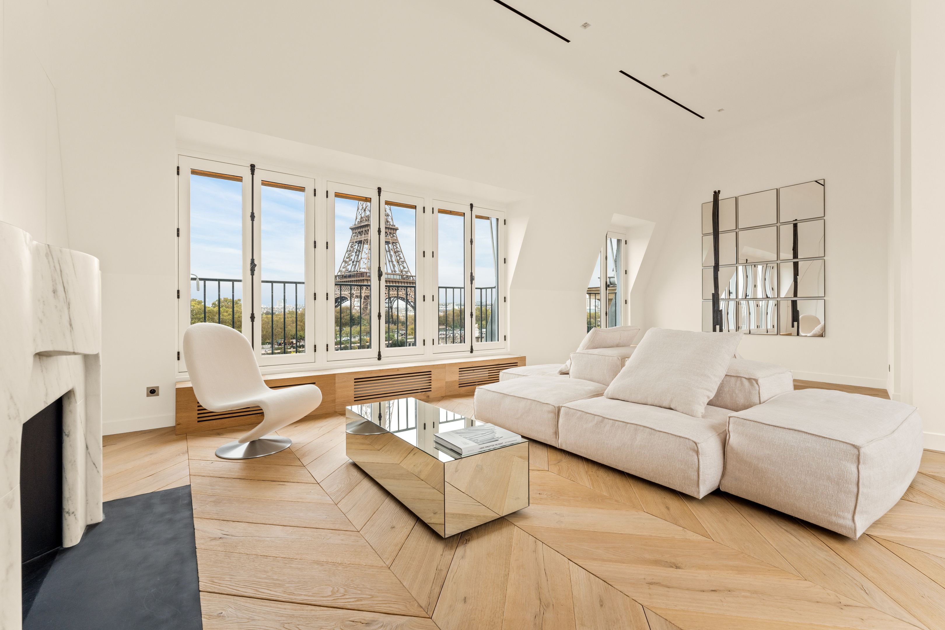 Duplex de standing offrant une vue exceptionnelle sur la Tour Eiffel depuis terrasse et rooftop. Suite parentale, chambres enfants, suite invités avec kitchenette, bureau et espace pour personnel. Climatisation et décoration design pour un confort optimal.
