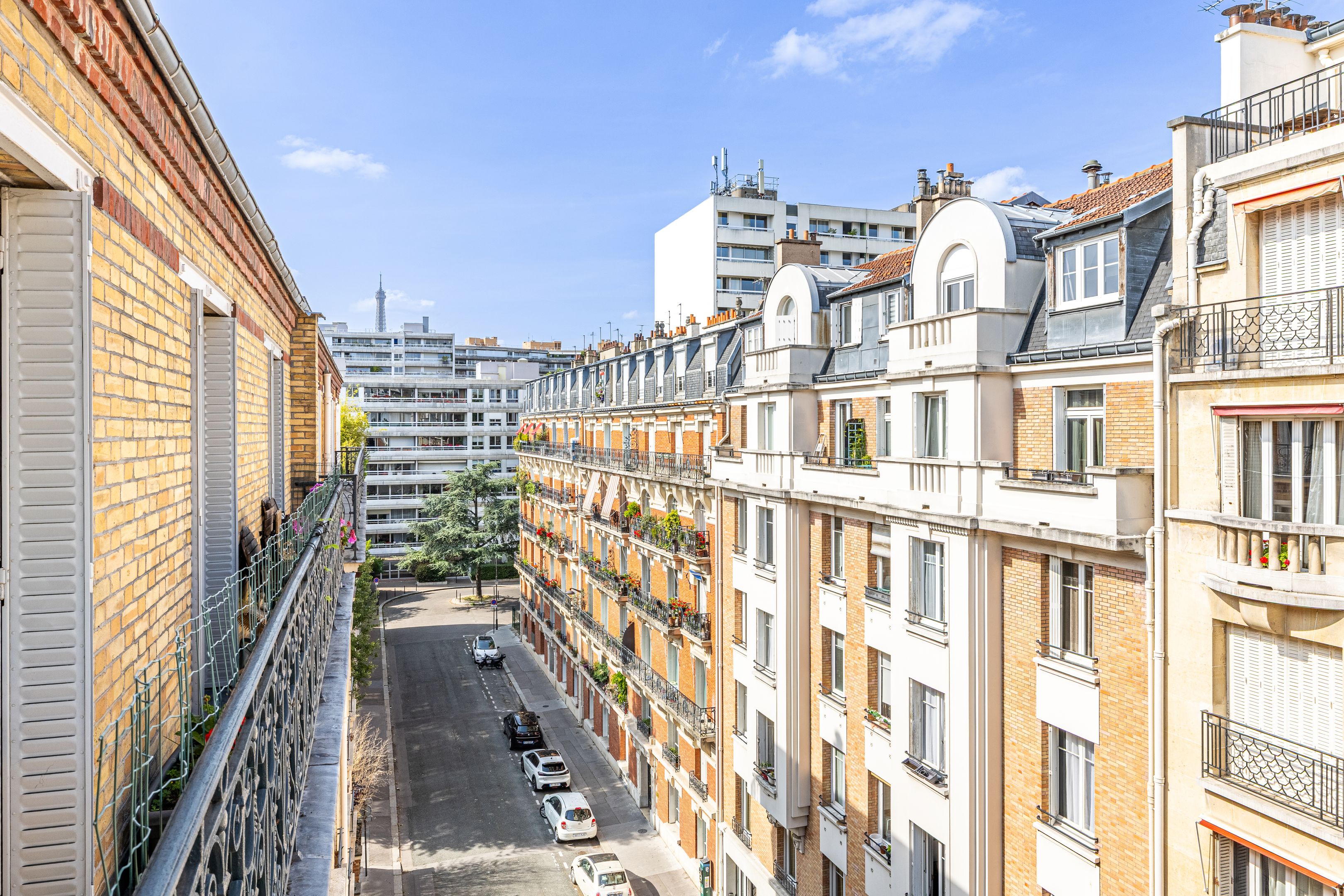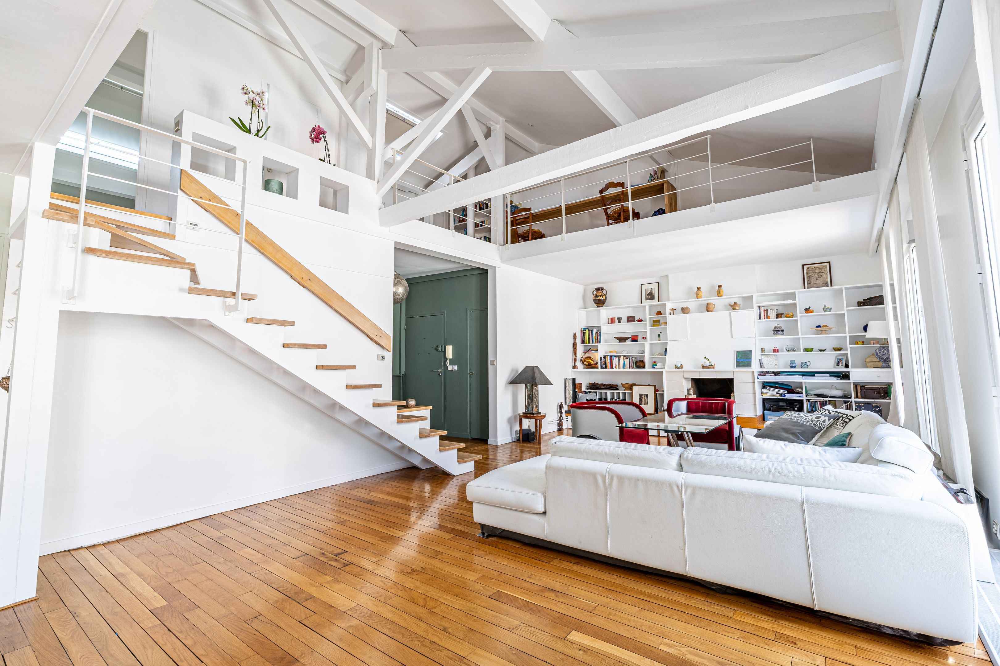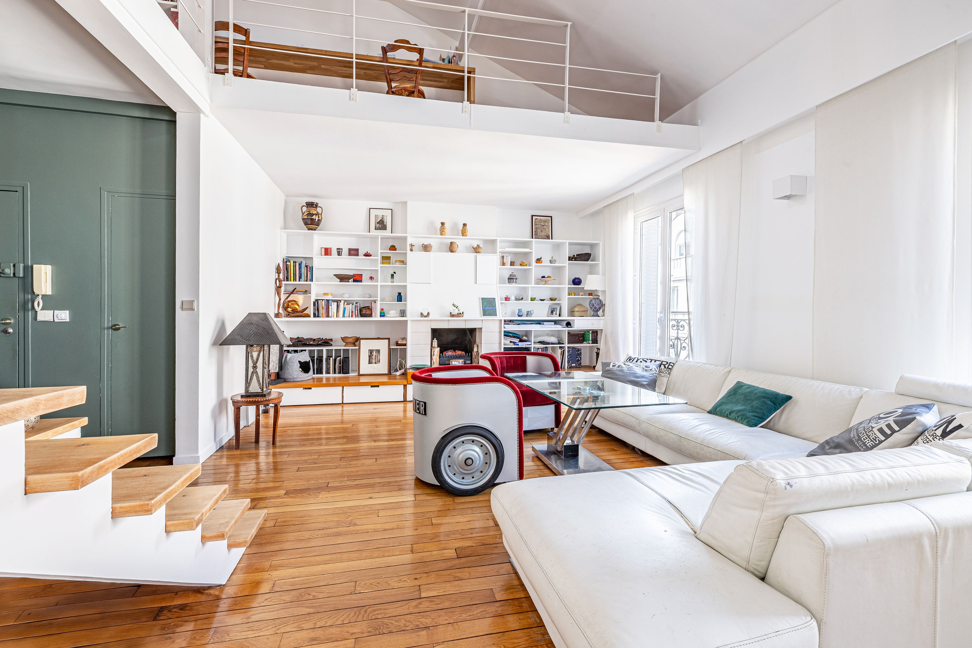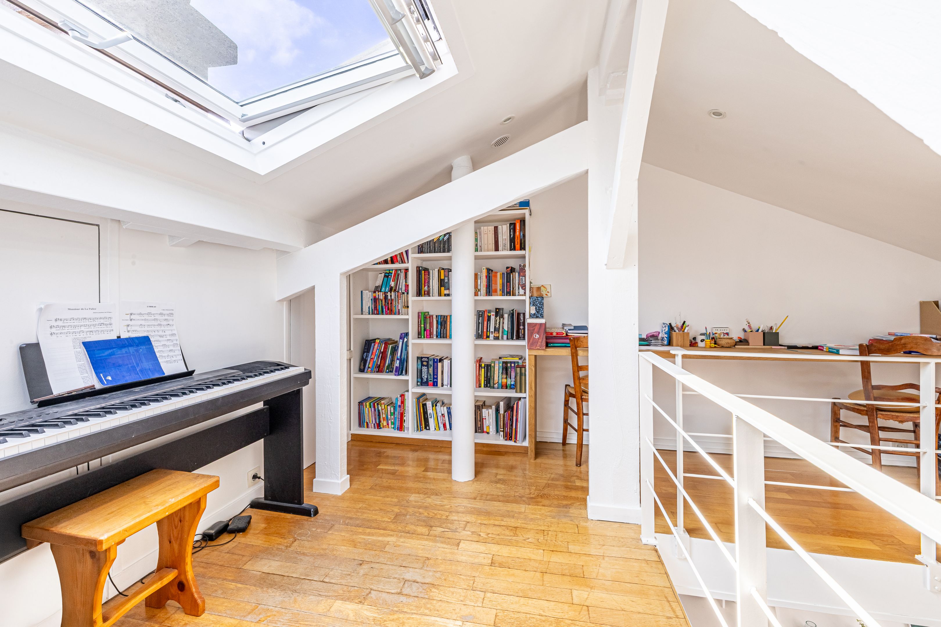 Agréable villa à proximité immédiate des commerces, des transports et des écoles de renom. Immeuble ancien en pierre et brique aux élégantes parties communes et bénéficiant des services d'un gardien, appartement de type duplex à l'esprit maison de 101 m² loi Carrez et 142 m² au sol, situé au 5ème et dernier étage desservi par ascenseur, en très bon état, au charme contemporain et disposant d'une très belle hauteur sous plafond, d'une agréable luminosité, d'un balcon filant avec vue sur la tour Eiffel ainsi que d'un excellent plan. Entrée, vaste double réception jouissant d'une grande hauteur sous plafond et du charme des poutres, cuisine séparée, chambre parentale (dressing et salle de bains), 2 chambres d'enfant au second niveau, bureau et espace télévision en mezzanine, salle d'eau, toilettes séparées, nombreux rangements dont un grenier de belle taille. Cave.