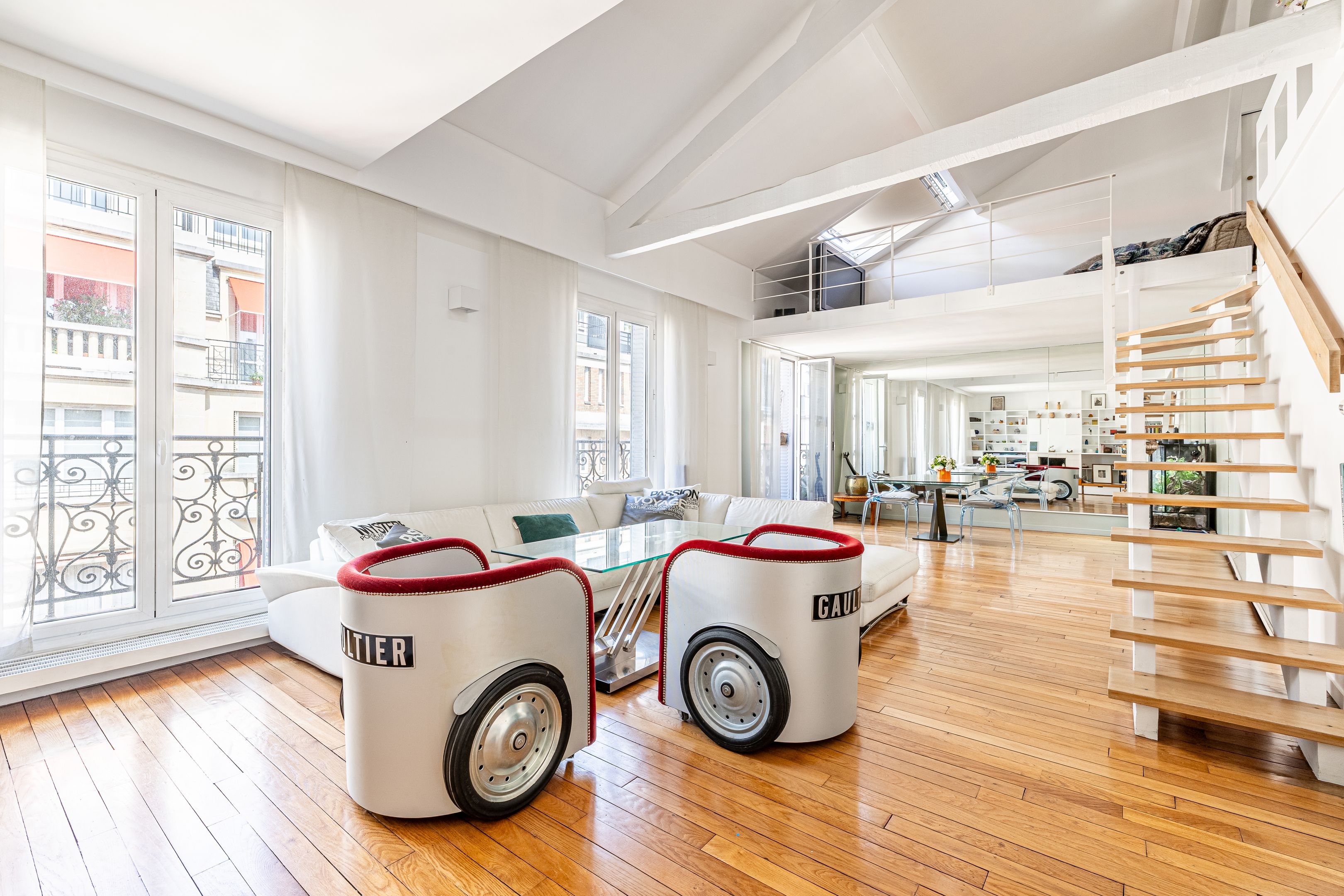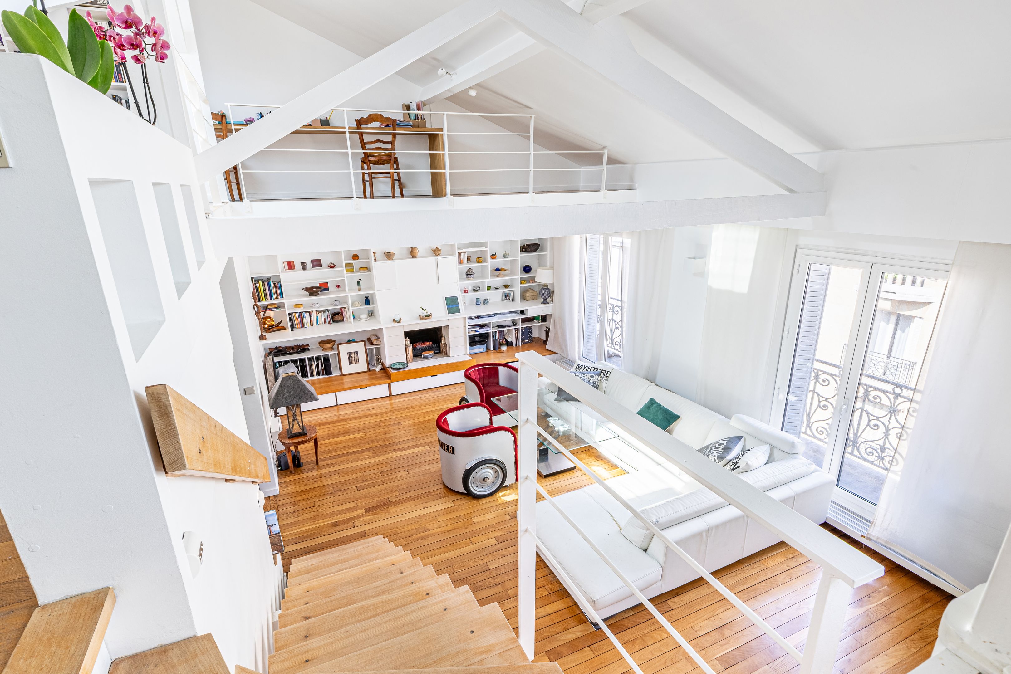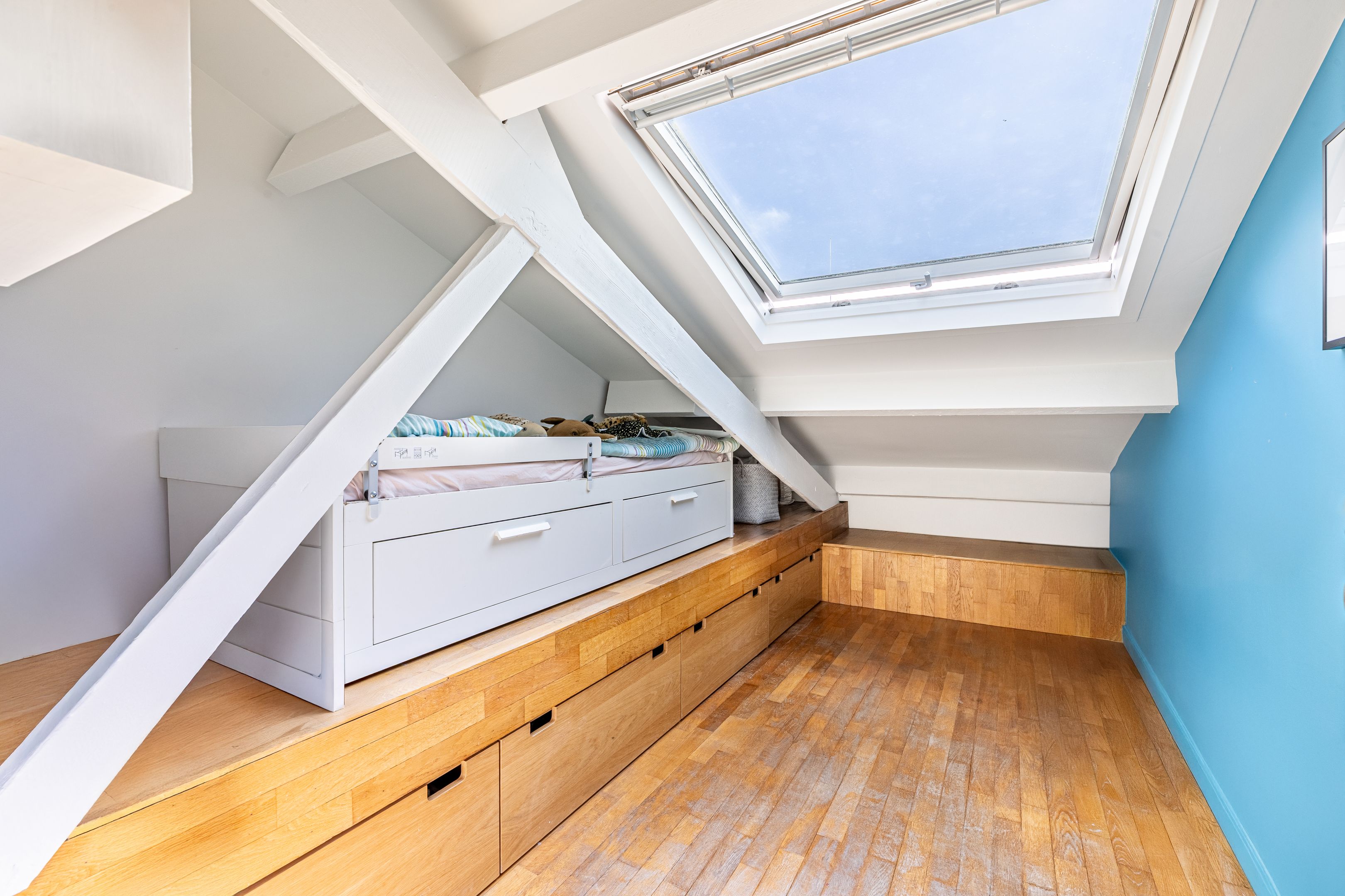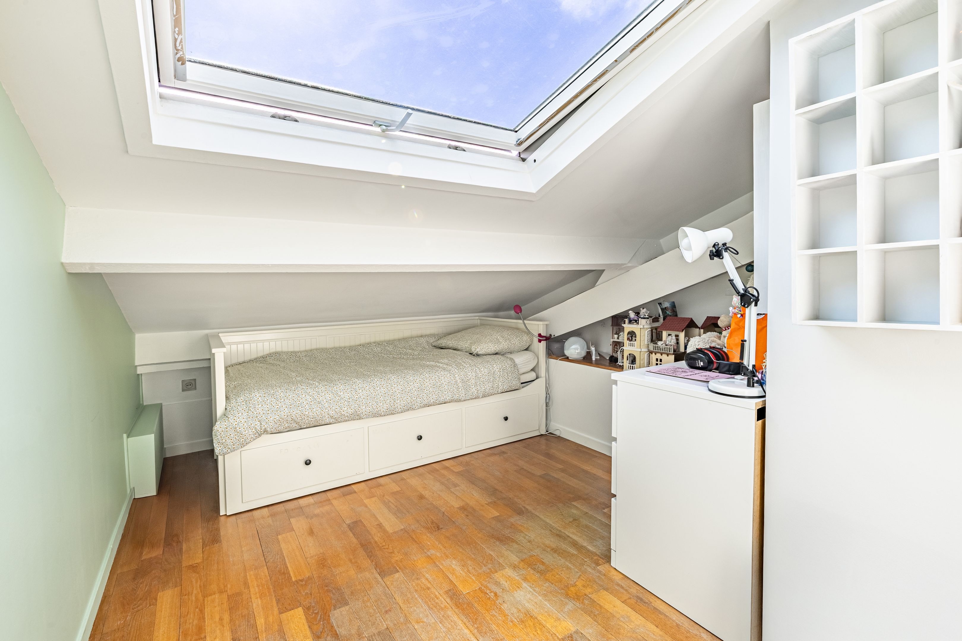 Agréable villa à proximité immédiate des commerces, des transports et des écoles de renom. Immeuble ancien en pierre et brique aux élégantes parties communes et bénéficiant des services d'un gardien, appartement de type duplex à l'esprit maison de 101 m² loi Carrez et 142 m² au sol, situé au 5ème et dernier étage desservi par ascenseur, en très bon état, au charme contemporain et disposant d'une très belle hauteur sous plafond, d'une agréable luminosité, d'un balcon filant avec vue sur la tour Eiffel ainsi que d'un excellent plan. Entrée, vaste double réception jouissant d'une grande hauteur sous plafond et du charme des poutres, cuisine séparée, chambre parentale (dressing et salle de bains), 2 chambres d'enfant au second niveau, bureau et espace télévision en mezzanine, salle d'eau, toilettes séparées, nombreux rangements dont un grenier de belle taille. Cave.