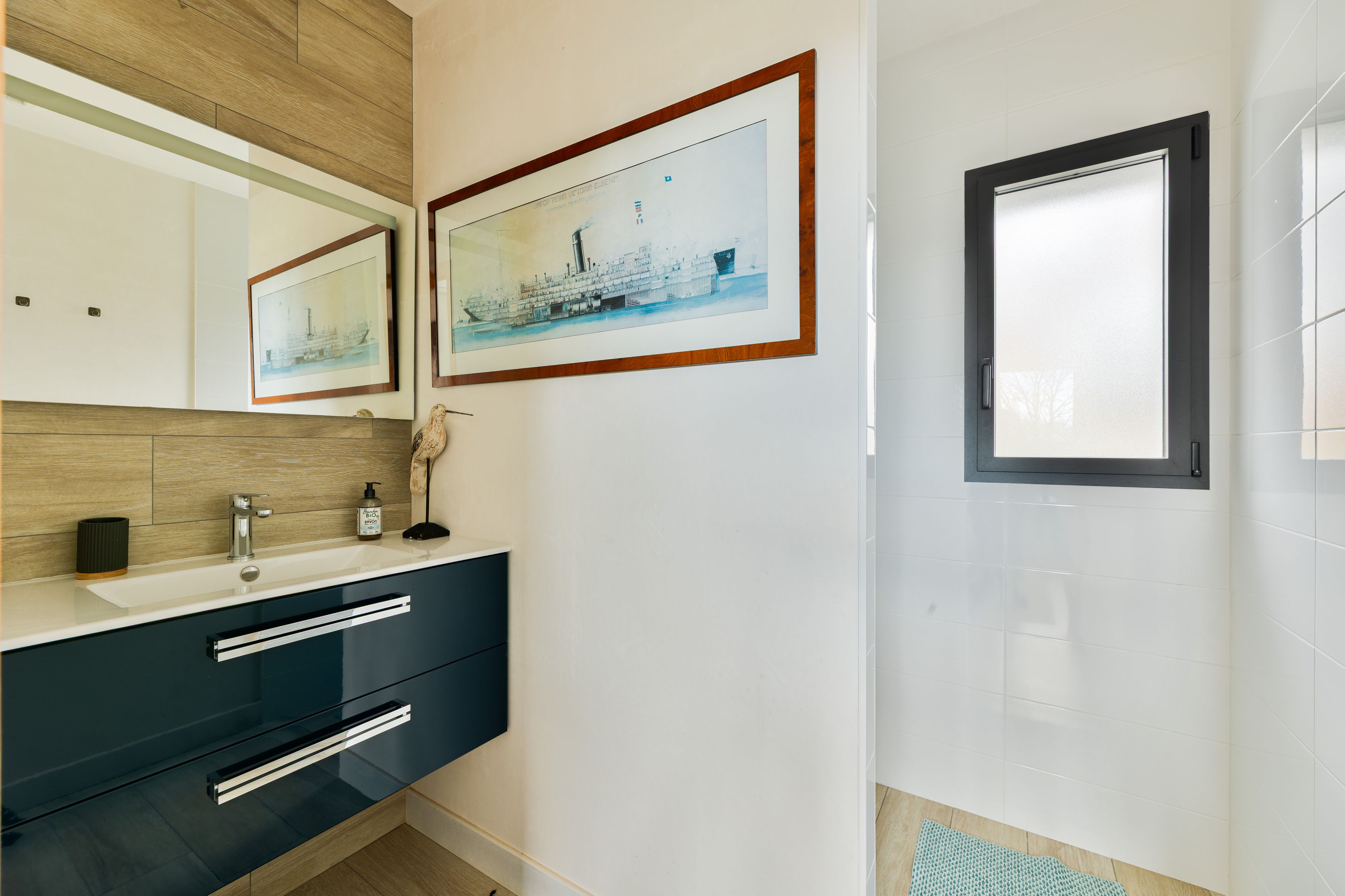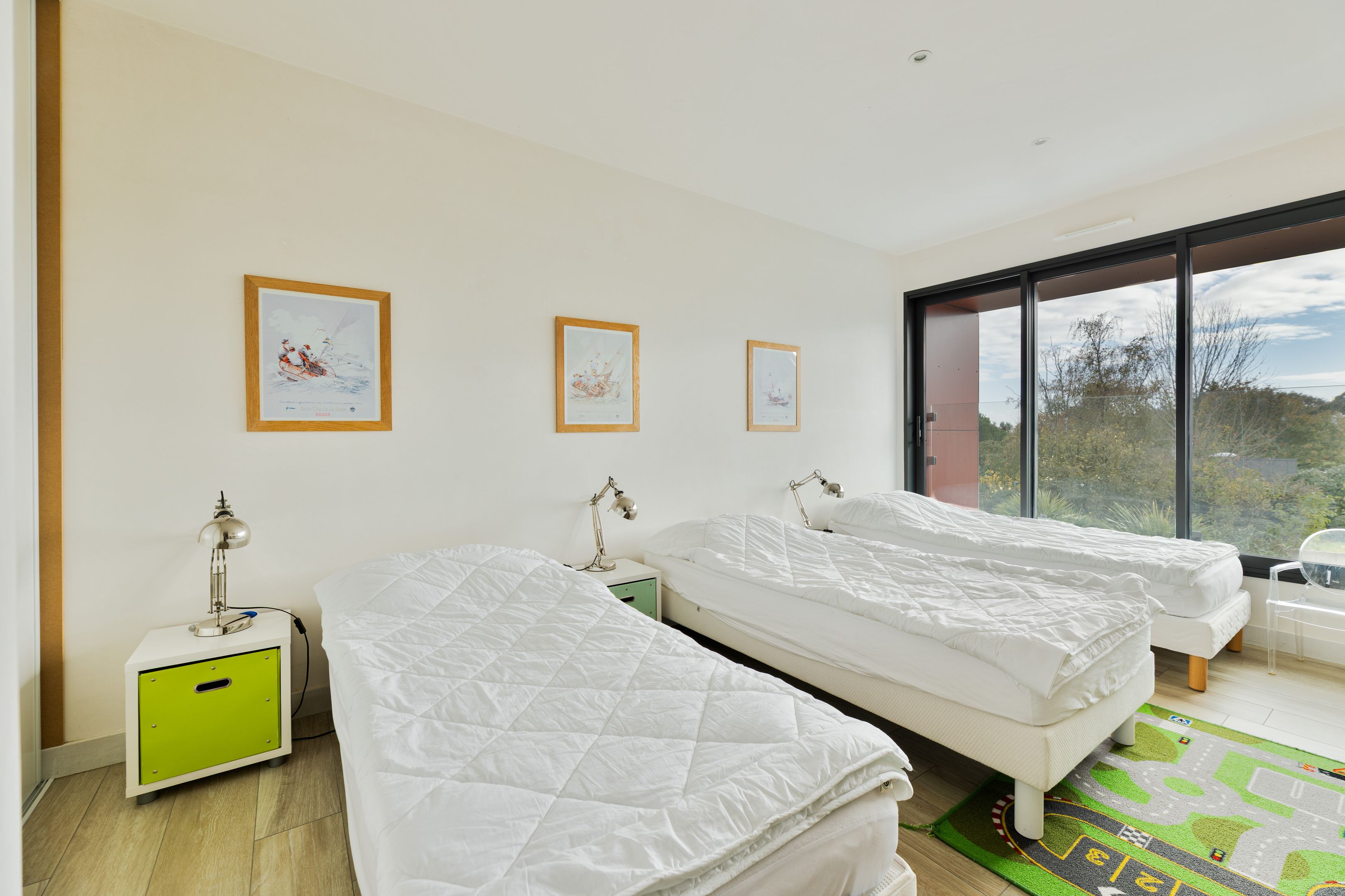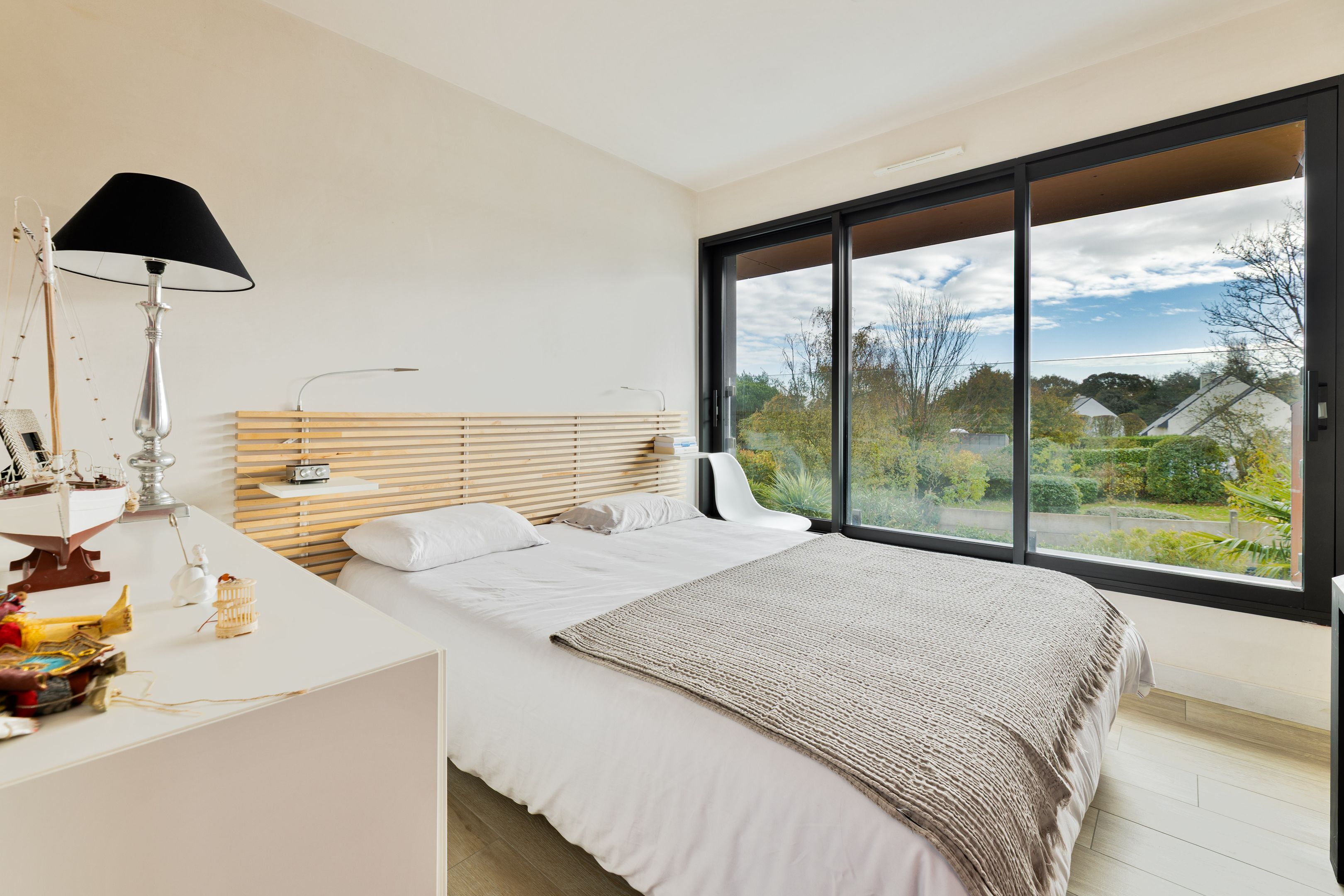 Proche de la plage de Trébézy à Saint-Marc sur Mer, villa récente de conception bioclimatique disposant d'un jardin arboré et clos ainsi que d'une piscine. Entrée, vaste pièce de vie de 70m² incluant une cuisine haut de gamme donnant sur une terrasse orientée sud, suite parentale avec salle d'eau et dressing, toilettes d'invités. A l''étage : palier, 3 belles chambres avec chacune sa salle d'eau/bains, toilettes séparées. Garage double, buanderie,