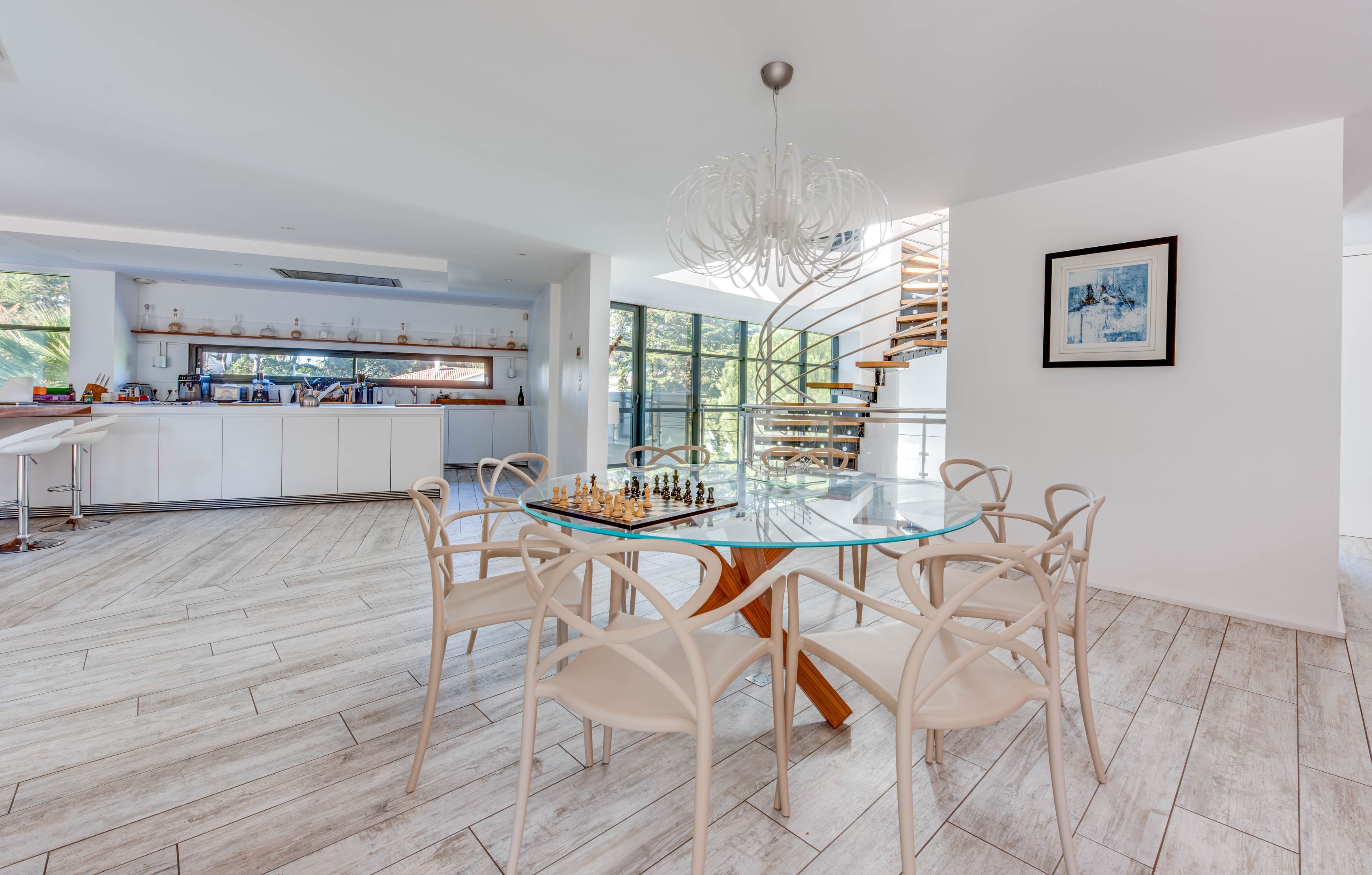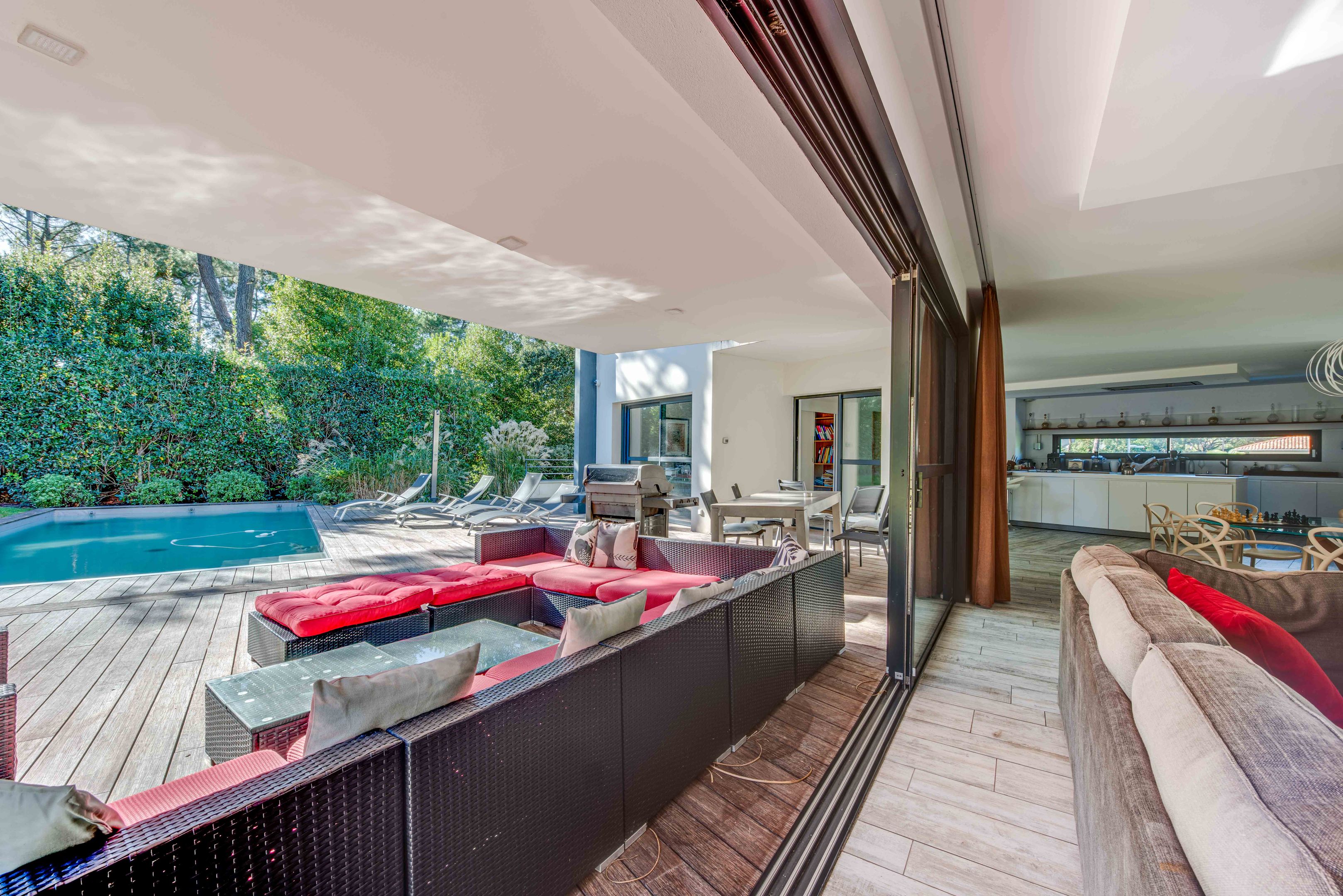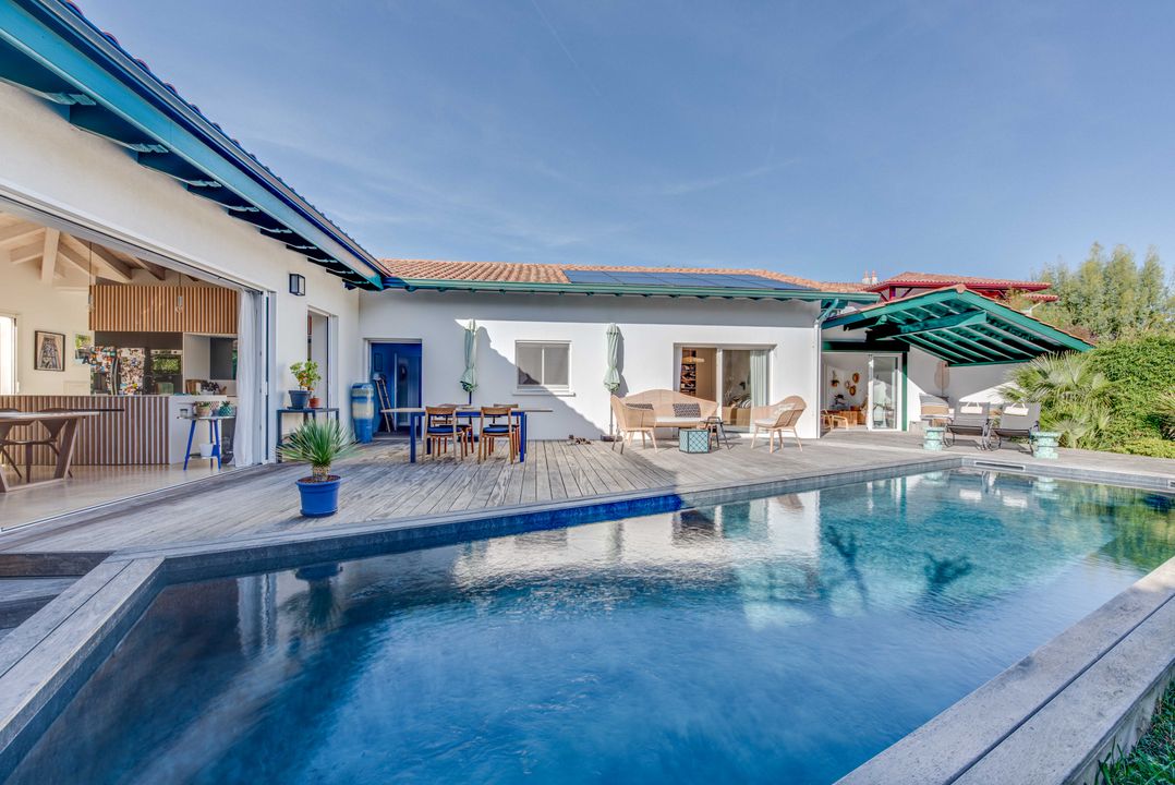 Golf de Chiberta, somptueuse villa contemporaine de 385 m² édifiée sur une parcelle de plus de 1 500 m². Au rez-de-chaussée : entrée équipée d'un ascenseur, salon loisir type home cinéma, suite parentale et salle d'eau, salle de sport, toilettes d'invités, garage pour 3 véhicules et cellier.
