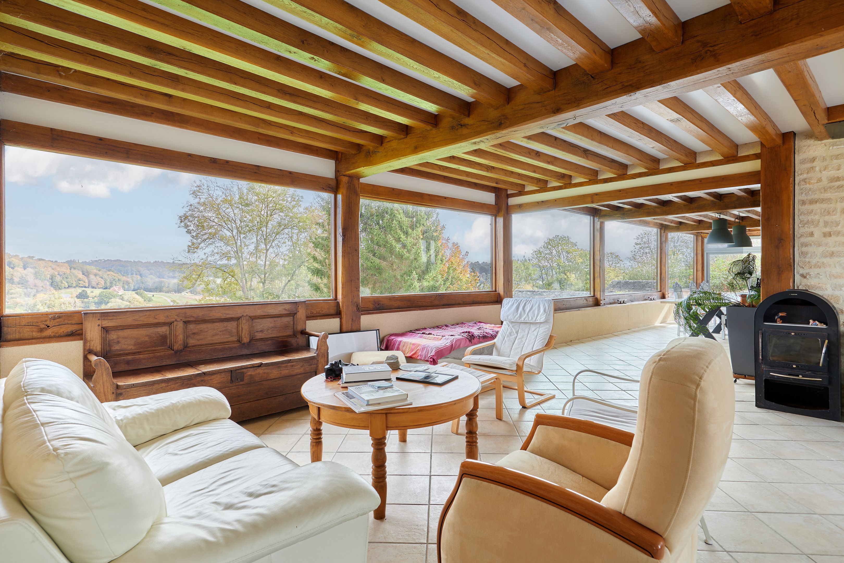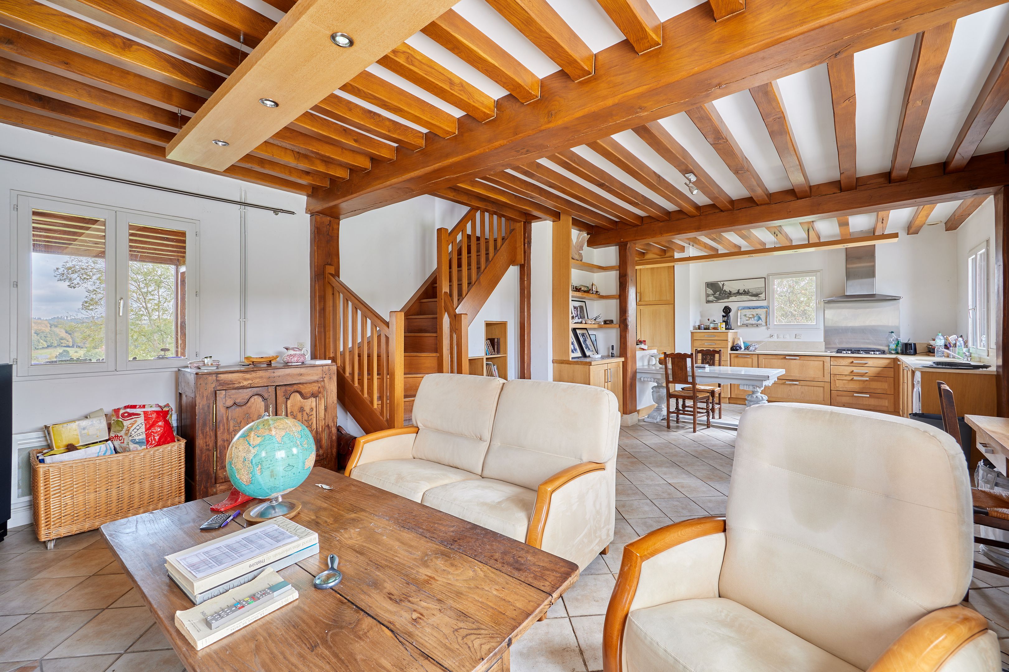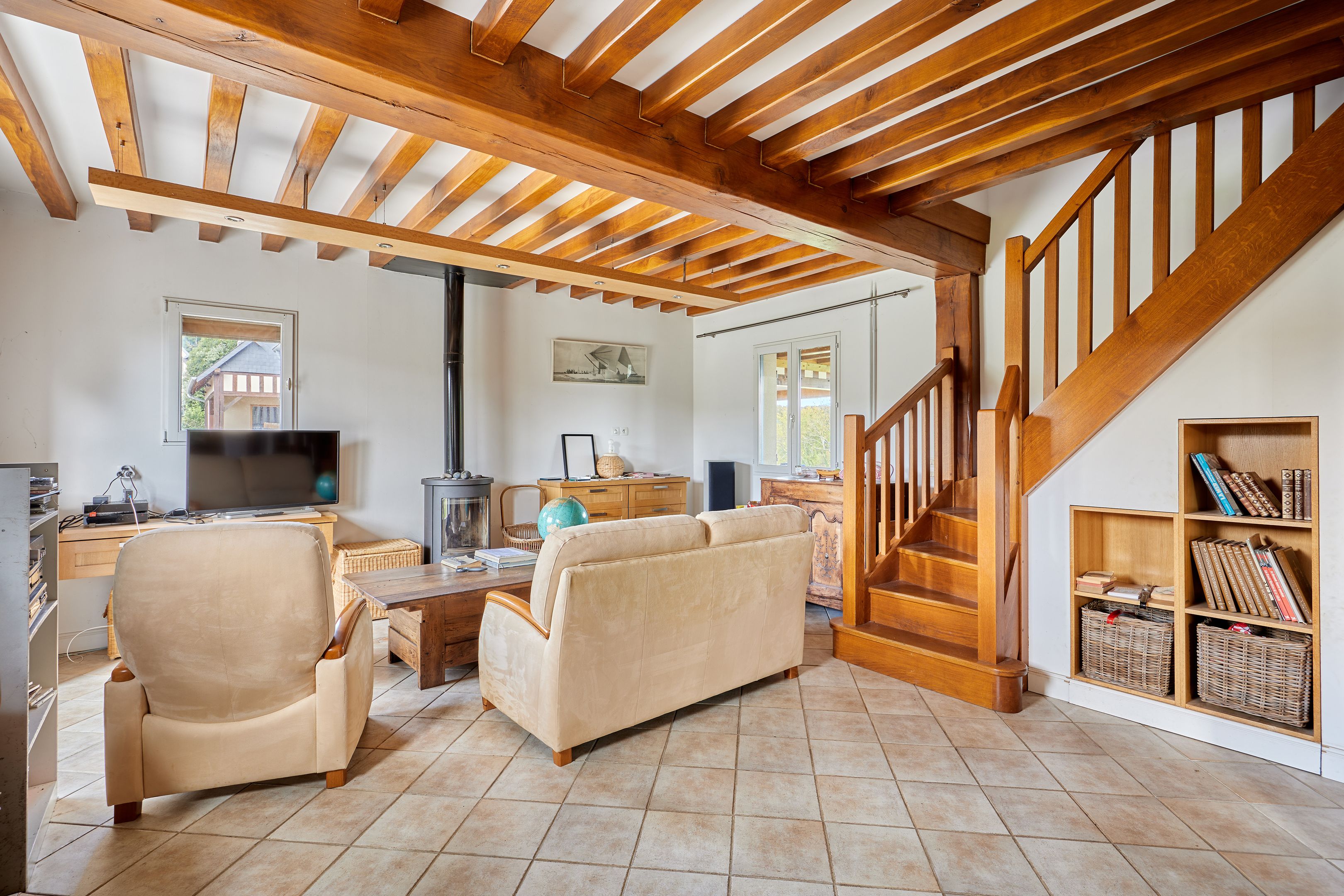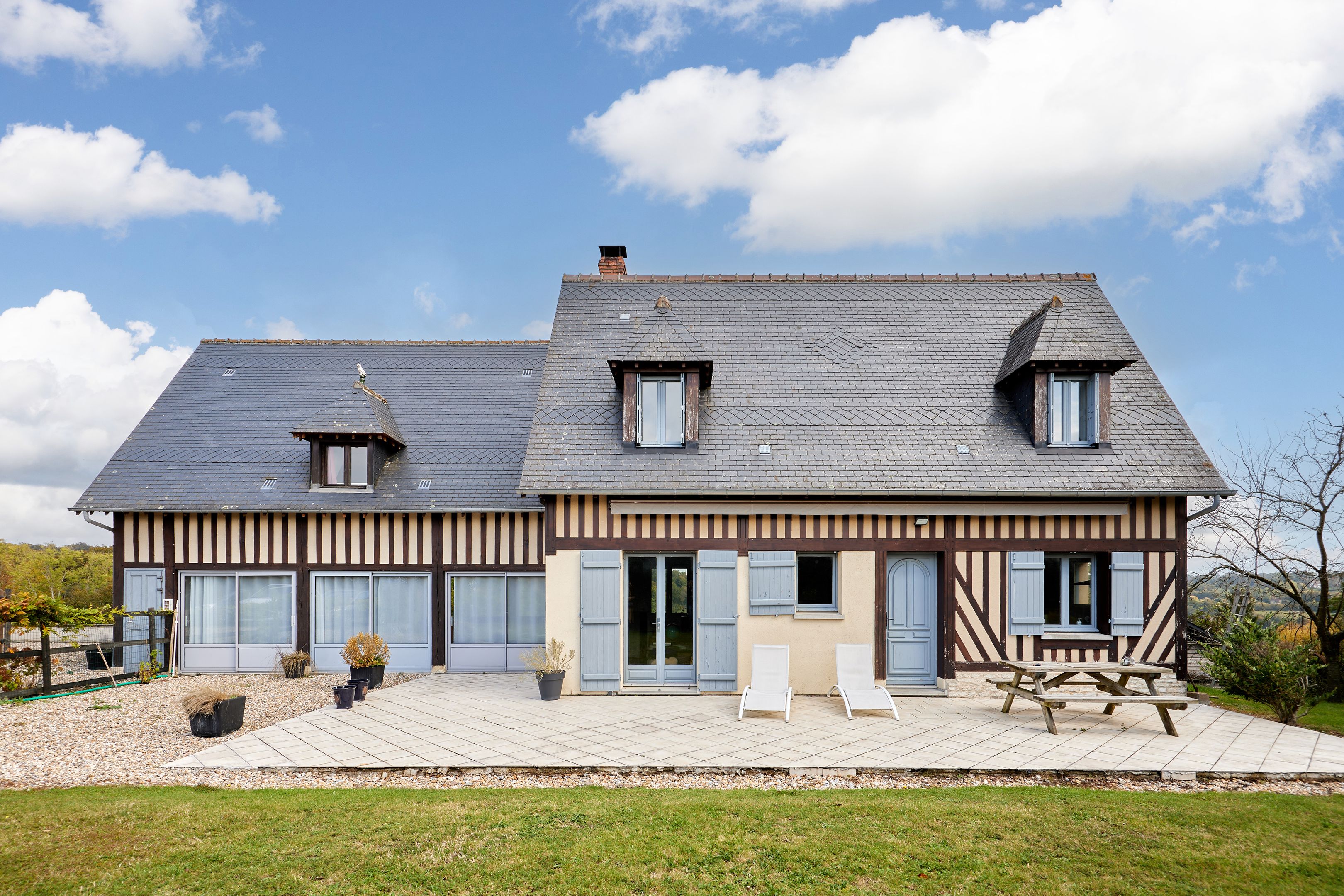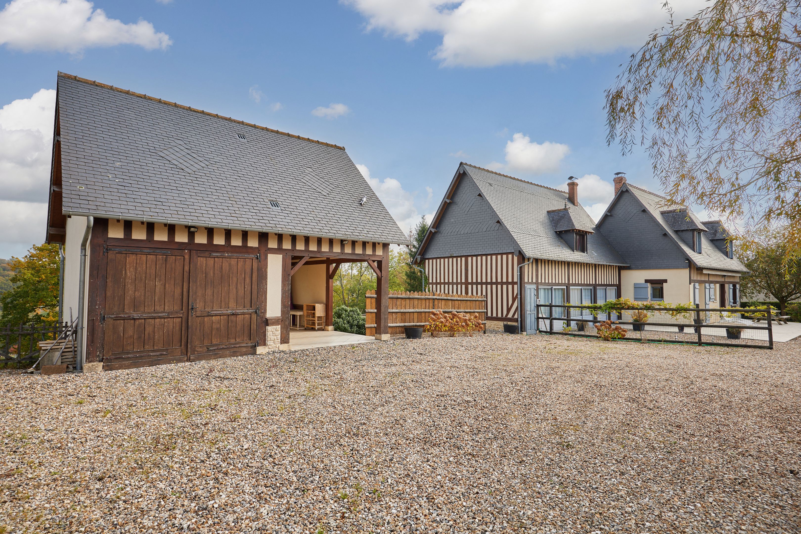À 5min de Pont-l'Évêque, maison normande édifiée sur près de 3500m2 de terrain. Au rez-de-chaussée : petit salon avec poêle à bois ouvert sur la terrasse exposée sud, cuisine ouverte, grand salon avec ouverture sur la vallée, chambre. À l'étage : deux chambres, salle de bains, dressing. Accessible par l'extérieur : un studio indépendant avec coin cuisine, salle d'eau et toilettes. En dépendance : petit bâtiment de 50m2 sur 2 niveaux aménageable. Deux abris de jardin.