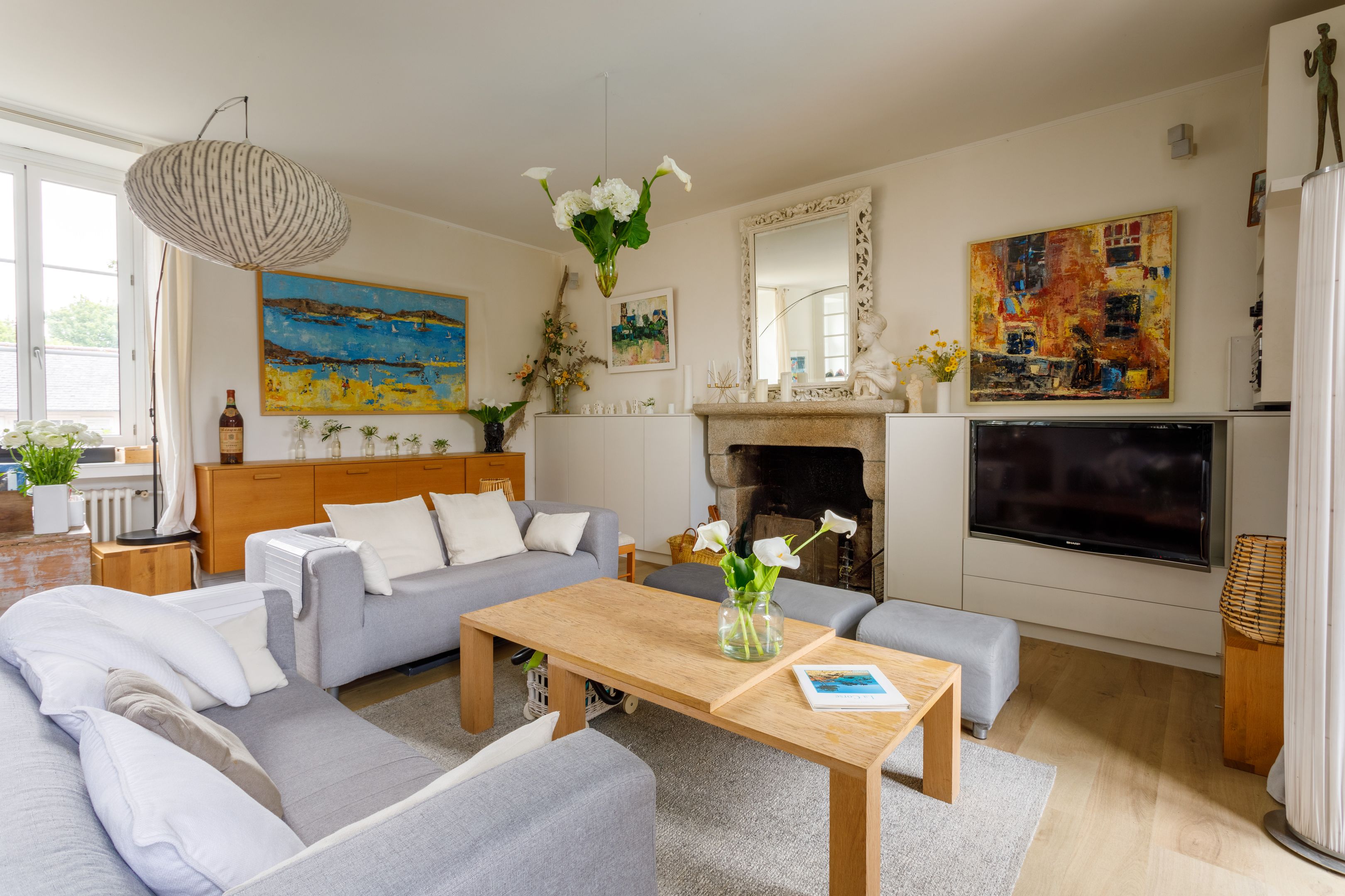 Entrée, vaste salon avec cheminée, salle à manger avec cuisine semi-ouverte, toilettes et nombreux rangements. Au 1er étage : 2 chambres de belle taille, salle bains, salle d'eau et toilettes séparées.