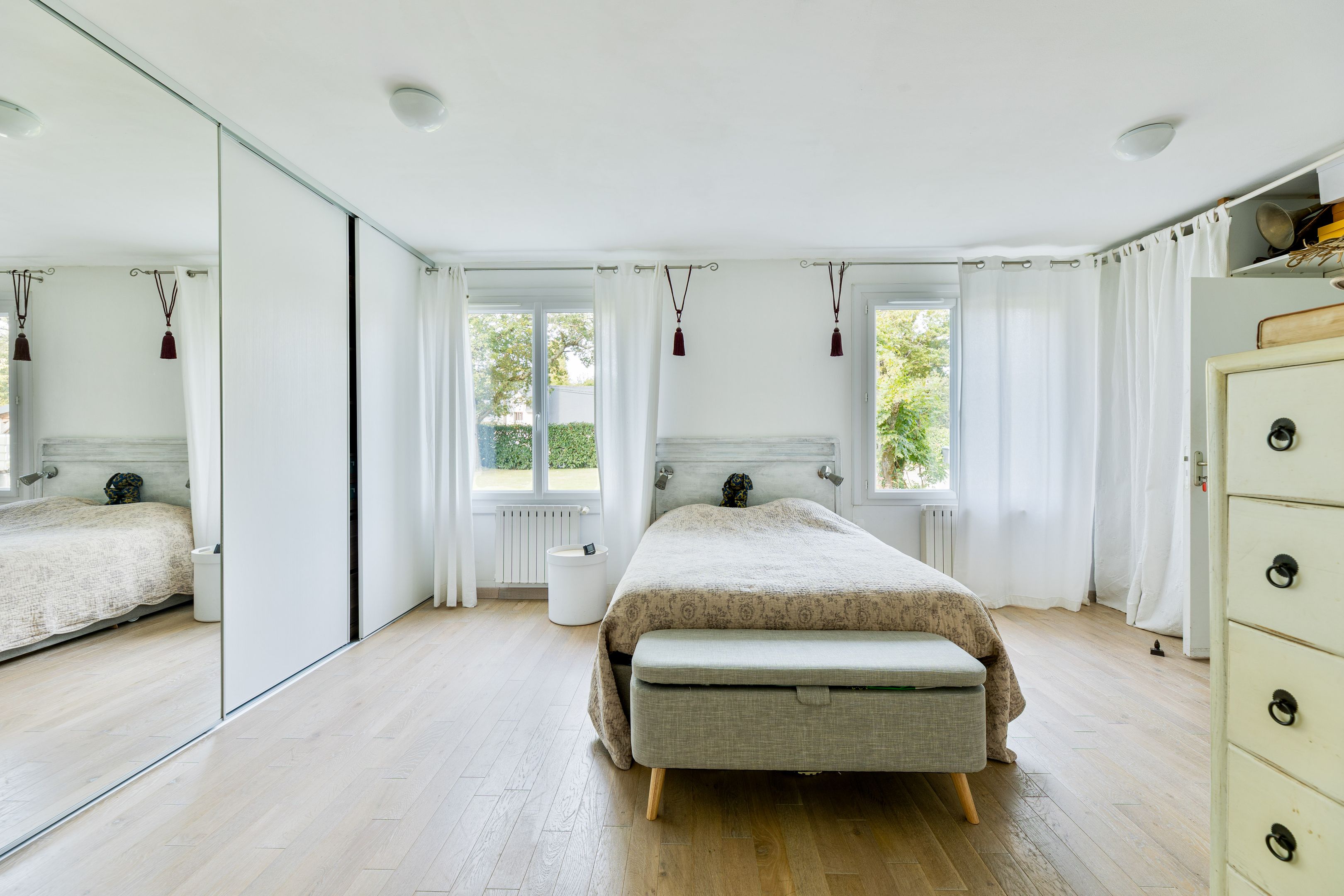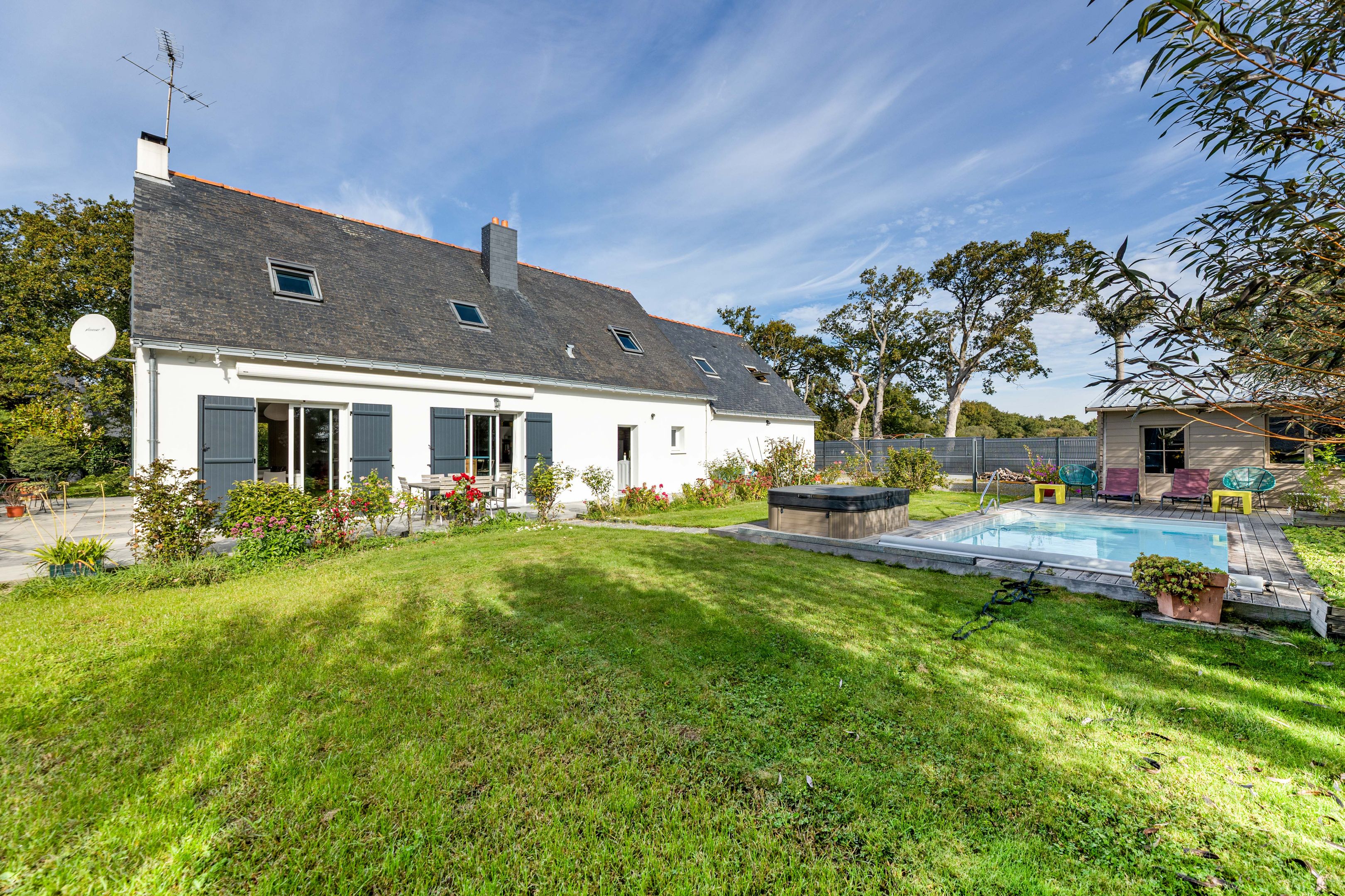 À Saint-André-des-Eaux, maison contemporaine de 167 m² disposant d'une belle terrasse, construite sur un jardin clos et arboré de 1 420 m², piscine de 6 x 3 m. Rez-de-jardin : vaste entrée, salon-séjour, cuisine équipée ouverte, donnant sur la terrasse et le jardin, toilettes séparées, 2 chambres en enfilade, l'une avec dressing et salle d'eau, l'autre avec salle d'eau et toilettes, arrière-cuisine et garage. Étage : palier, 4 chambres dont une avec un dressing fermé, toilettes séparées, salle de bains, grenier. "Carport" pour 3 véhicules et grand abri de jardin.
