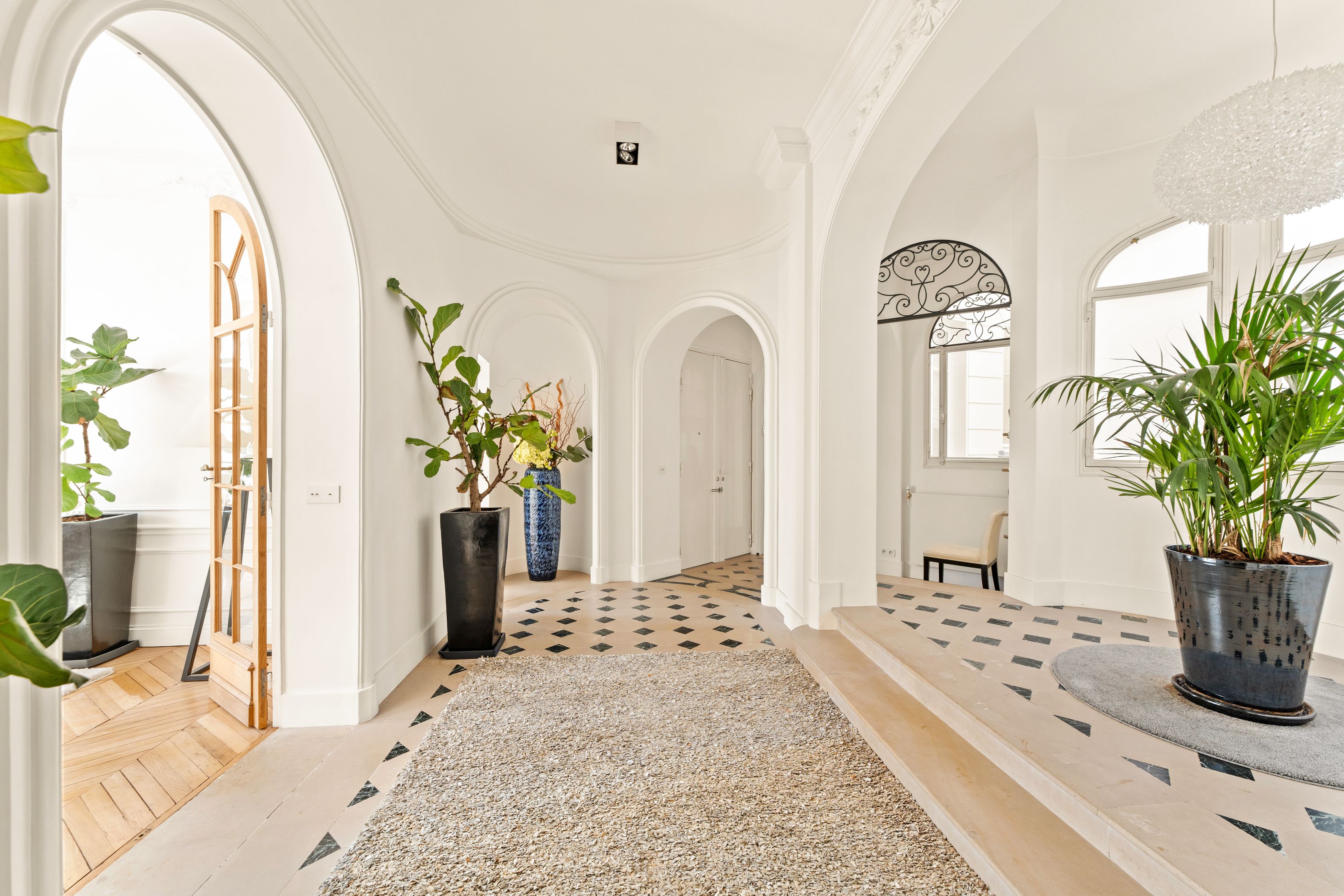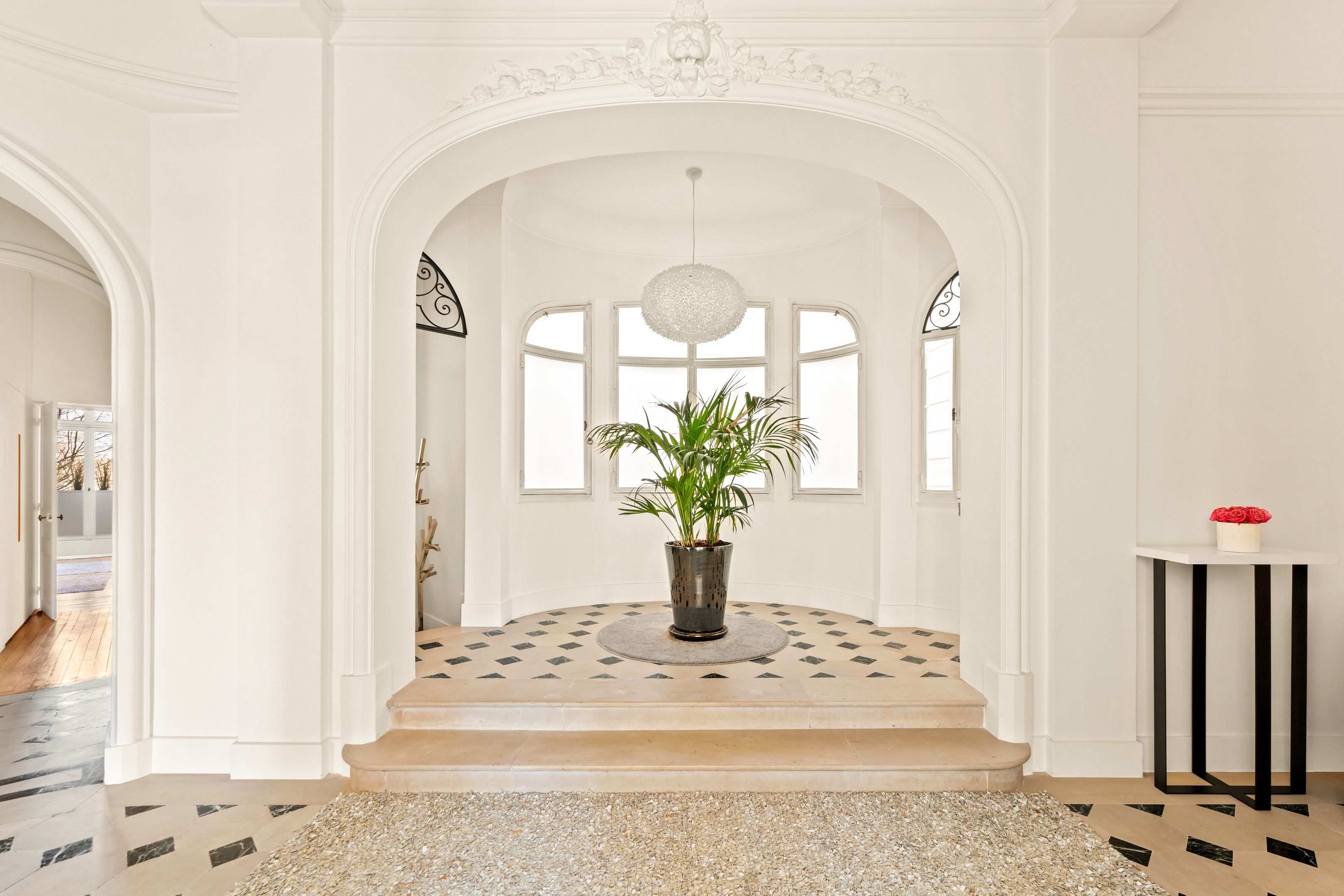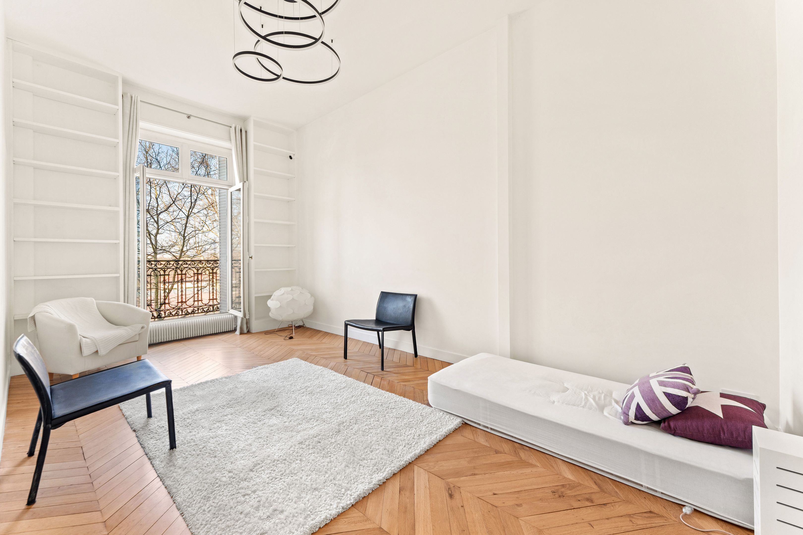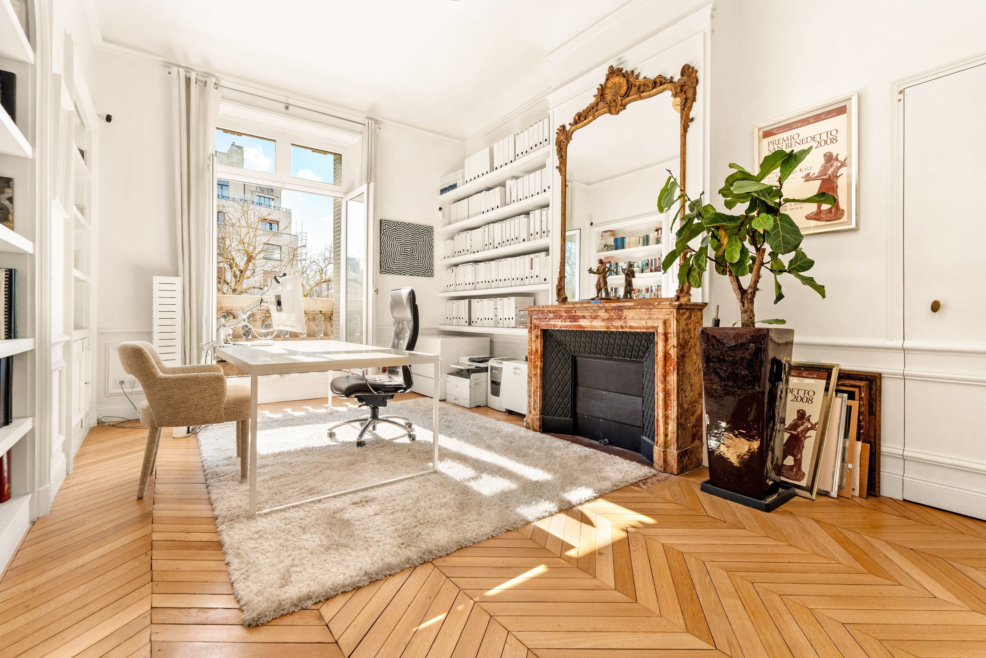 Au sein d'une superbe copropriété aux très élégantes parties communes, appartement familial et de réception de 305m² seul à l'étage, traversant, sans vis-à-vis et baigné de lumière, rénové par une architecte de renom ayant gardé tous les éléments d'origine (parquets, moulures et cheminées), très beaux volumes (hauteur sous plafond de 3,60m). À l'étage noble desservi par ascenseur, bénéficiant d'un excellent plan : galerie d'entrée, vaste salon avec balcon en pierre offrant une vue dégagée, salle à manger disposant d'une cuisine ouverte, seconde cuisine, chambre parentale avec dressing, salle d'eau dotée d'un sauna, 3 autres chambres, bureau, salle d'eau, toilettes d'invités.Cave. Chambre de service rénovée.