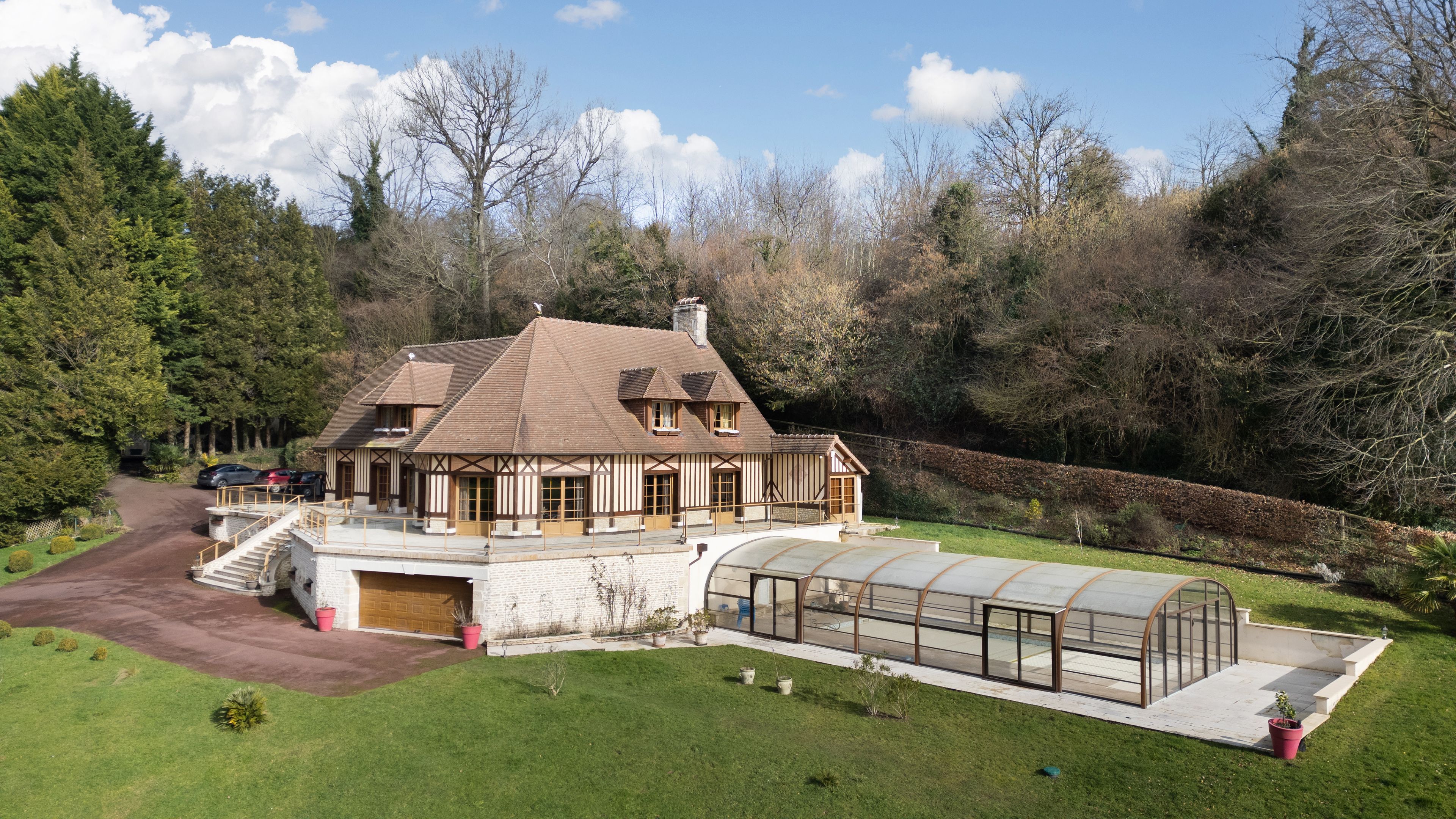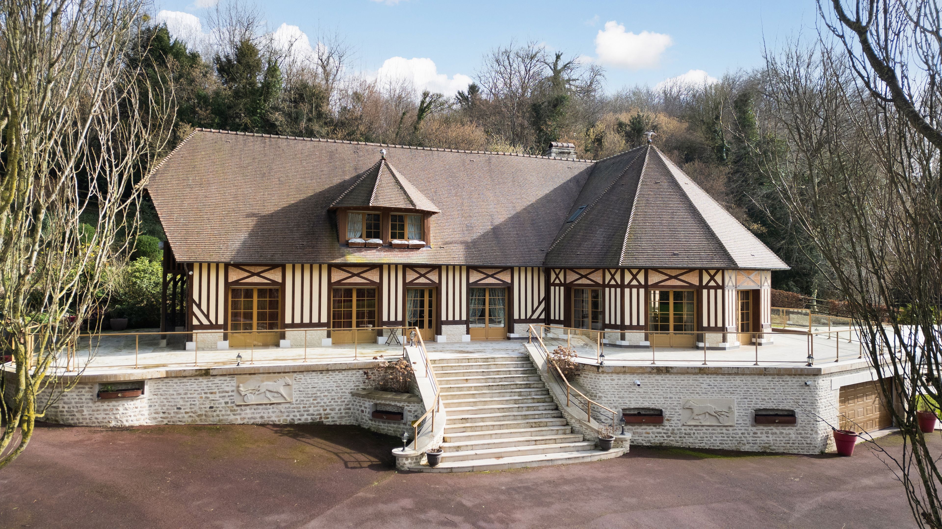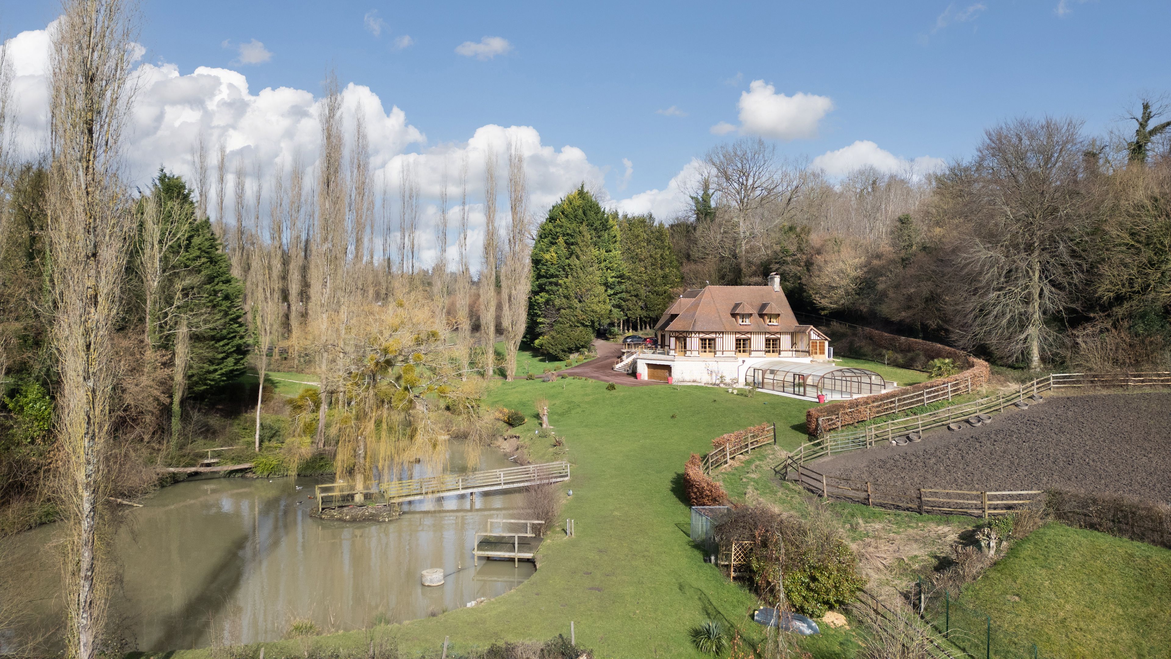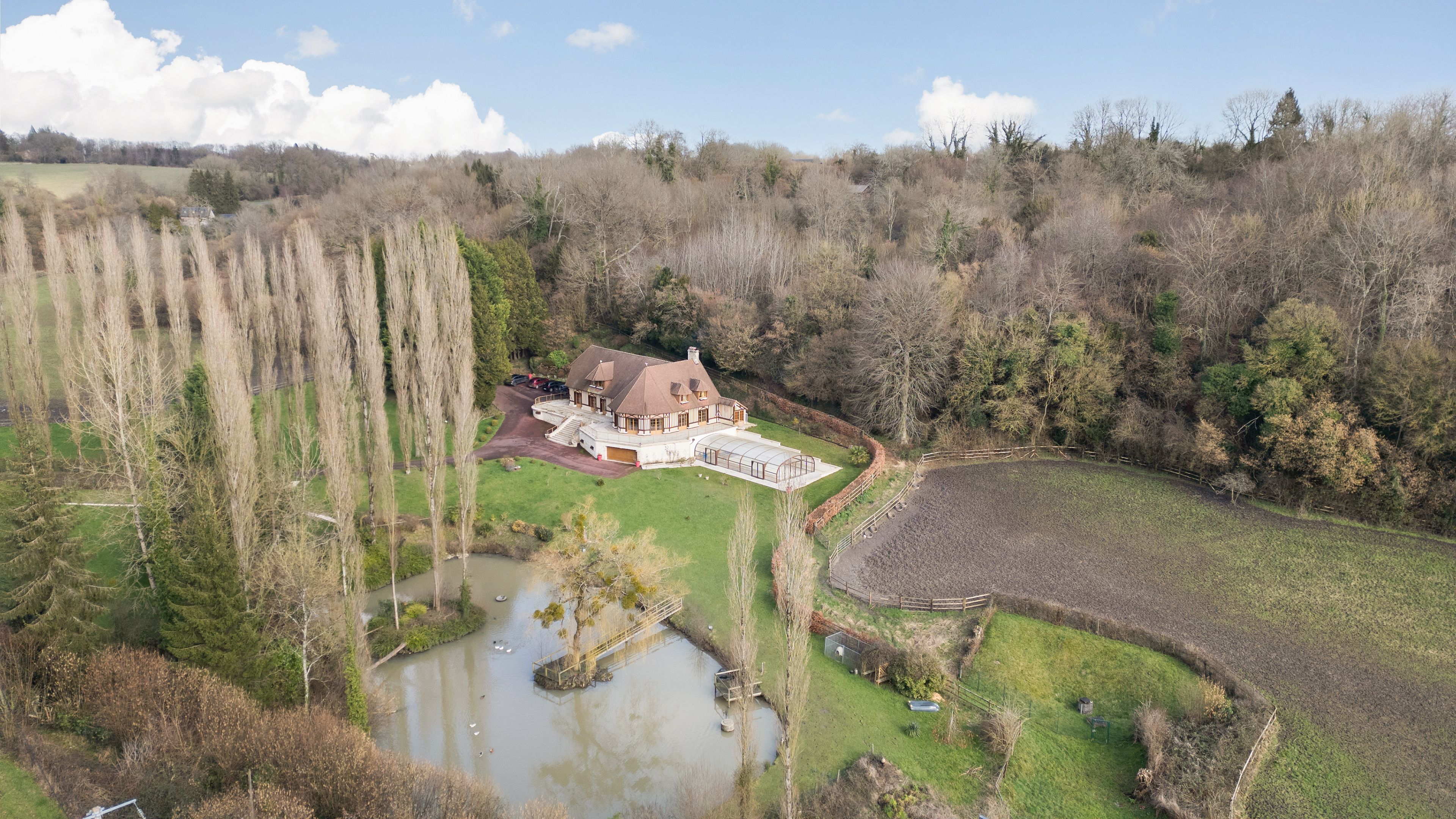 À 15 minutes de Deauville, au cœur du Pays d’Auge, Breteuil vous propose cette élégante propriété normande de 380 m² habitables, implantée dans un environnement naturel préservé de plus de 7 hectares. La maison principale séduit par ses volumes et sa luminosité. Le rez-de-chaussée s’ouvre sur une entrée distribuant une cuisine aménagée et équipée, ouverte sur un vaste séjour avec cheminée. Une terrasse périphérique prolonge harmonieusement la pièce de vie. Une chambre, une salle d’eau, une buanderie et des toilettes indépendantes complètent ce niveau, permettant une vie de plain-pied. À l’étage, un palier aménagé en bureau dessert six chambres, une salle de bains, une salle d’eau et des toilettes indépendantes. Un sous-sol complet accueille un garage, un atelier, des espaces de rangement ainsi que le local technique de la piscine. Le domaine comprend paddocks, jardin paysager, étang et dépendances. La piscine couverte et chauffée, accessible depuis l’intérieur de la maison comme depuis l’extérieur, s’intègre parfaitement à l’ensemble. Cette propriété équestre offre un fort potentiel pour la création d’une écurie de CSO ou d’un haras dédié à l’élevage de chevaux de course.