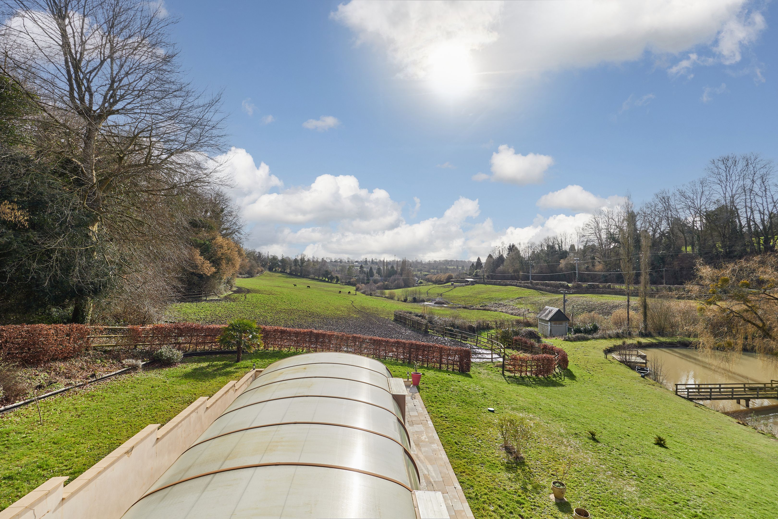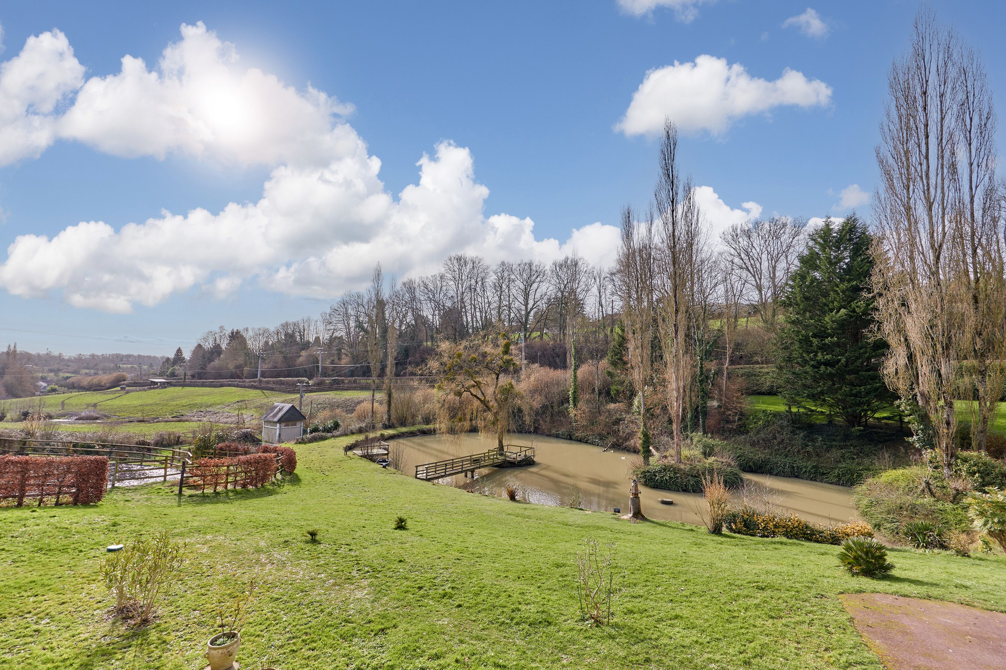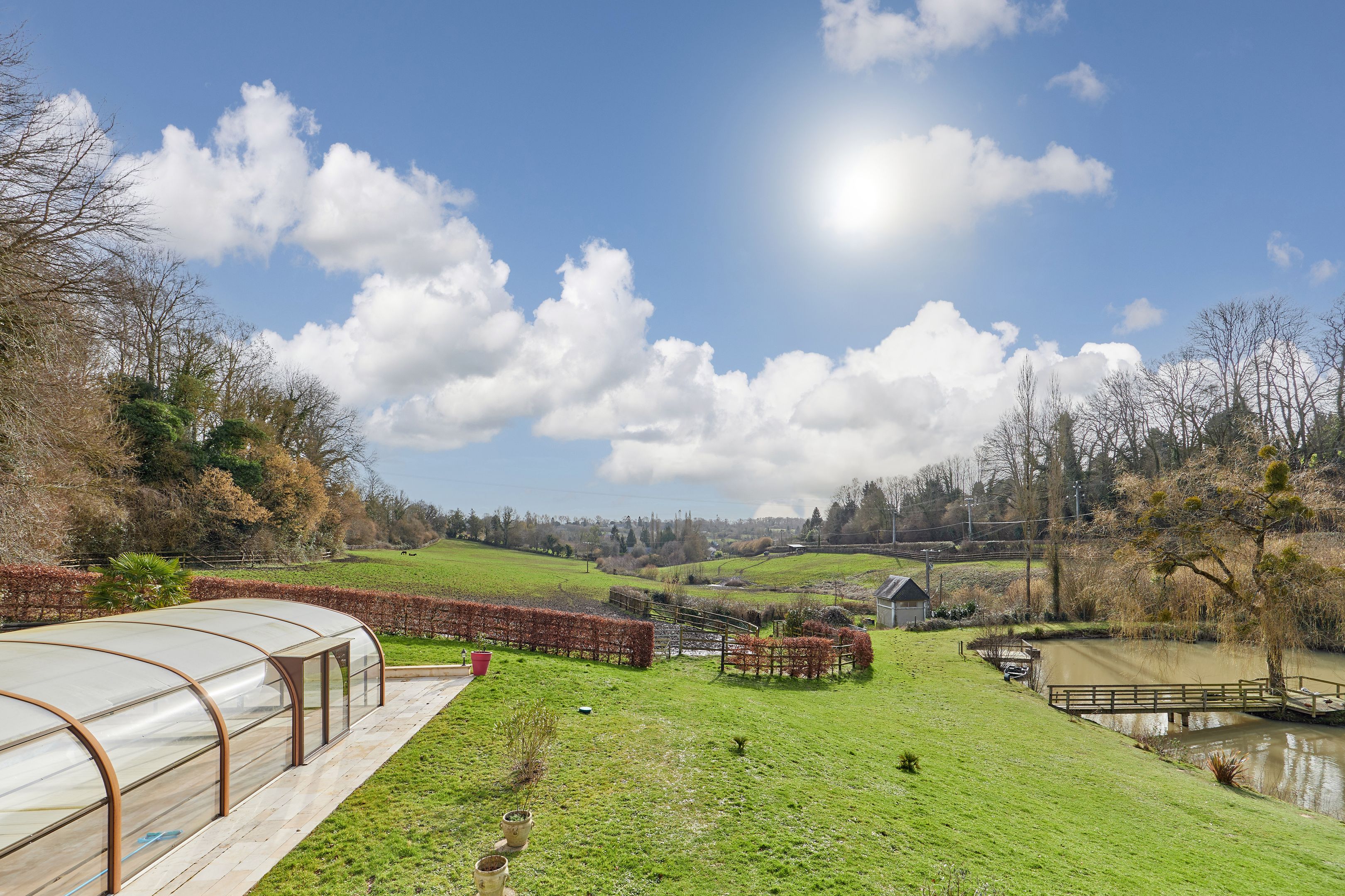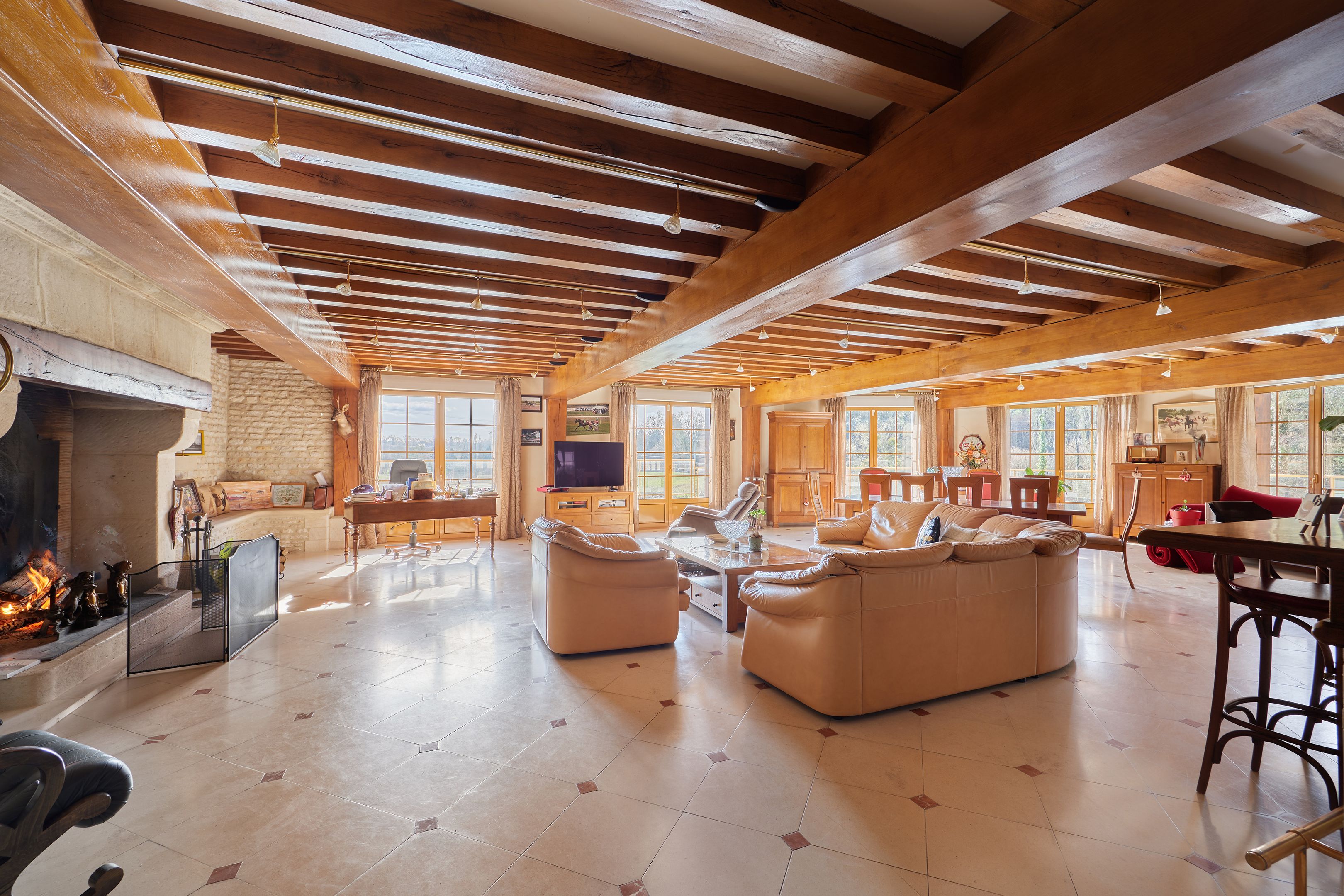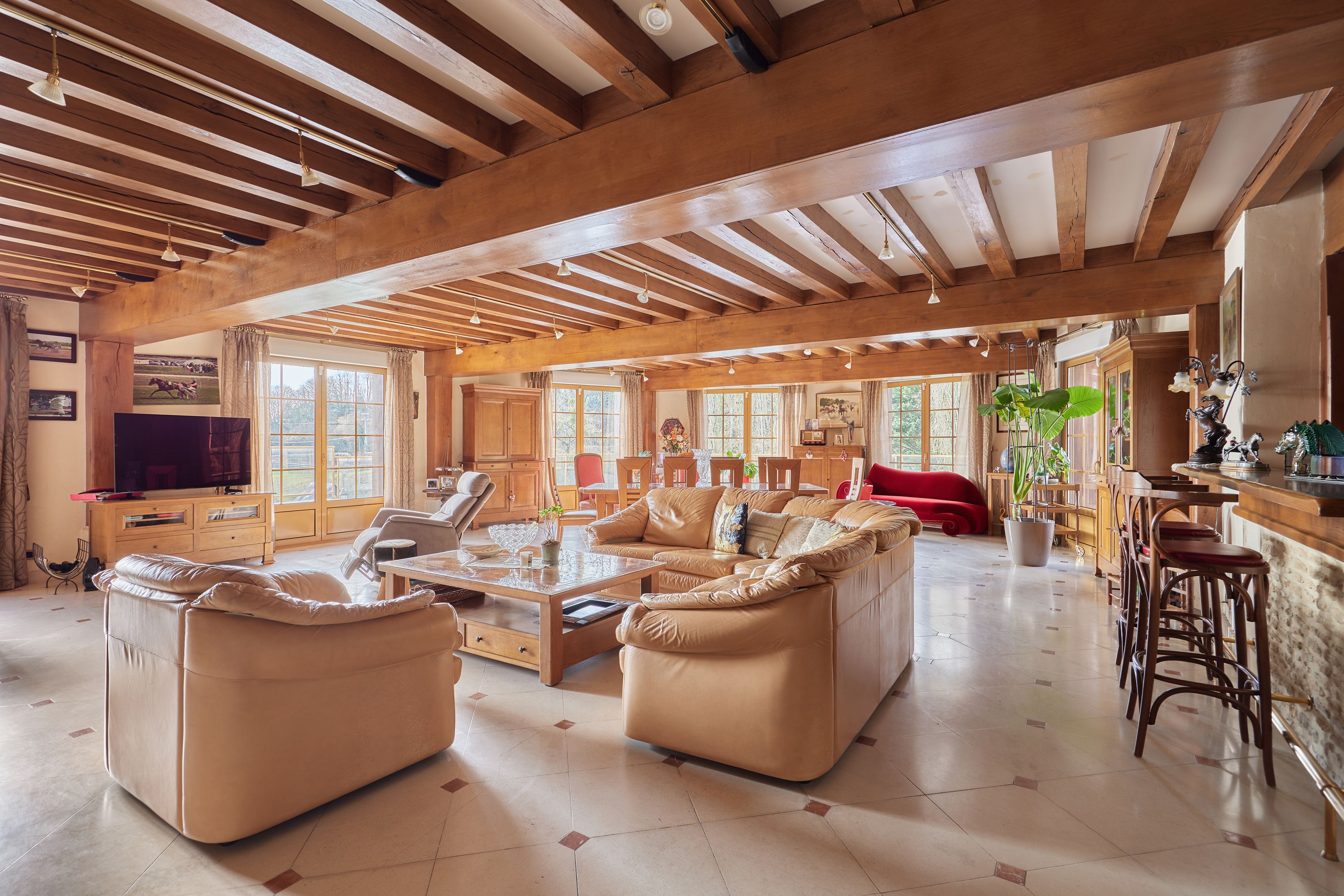 À 15 minutes de Deauville, au cœur du Pays d’Auge, Breteuil vous propose cette élégante propriété normande de 380 m² habitables, implantée dans un environnement naturel préservé de plus de 7 hectares. La maison principale séduit par ses volumes et sa luminosité. Le rez-de-chaussée s’ouvre sur une entrée distribuant une cuisine aménagée et équipée, ouverte sur un vaste séjour avec cheminée. Une terrasse périphérique prolonge harmonieusement la pièce de vie. Une chambre, une salle d’eau, une buanderie et des toilettes indépendantes complètent ce niveau, permettant une vie de plain-pied. À l’étage, un palier aménagé en bureau dessert six chambres, une salle de bains, une salle d’eau et des toilettes indépendantes. Un sous-sol complet accueille un garage, un atelier, des espaces de rangement ainsi que le local technique de la piscine. Le domaine comprend paddocks, jardin paysager, étang et dépendances. La piscine couverte et chauffée, accessible depuis l’intérieur de la maison comme depuis l’extérieur, s’intègre parfaitement à l’ensemble. Cette propriété équestre offre un fort potentiel pour la création d’une écurie de CSO ou d’un haras dédié à l’élevage de chevaux de course.