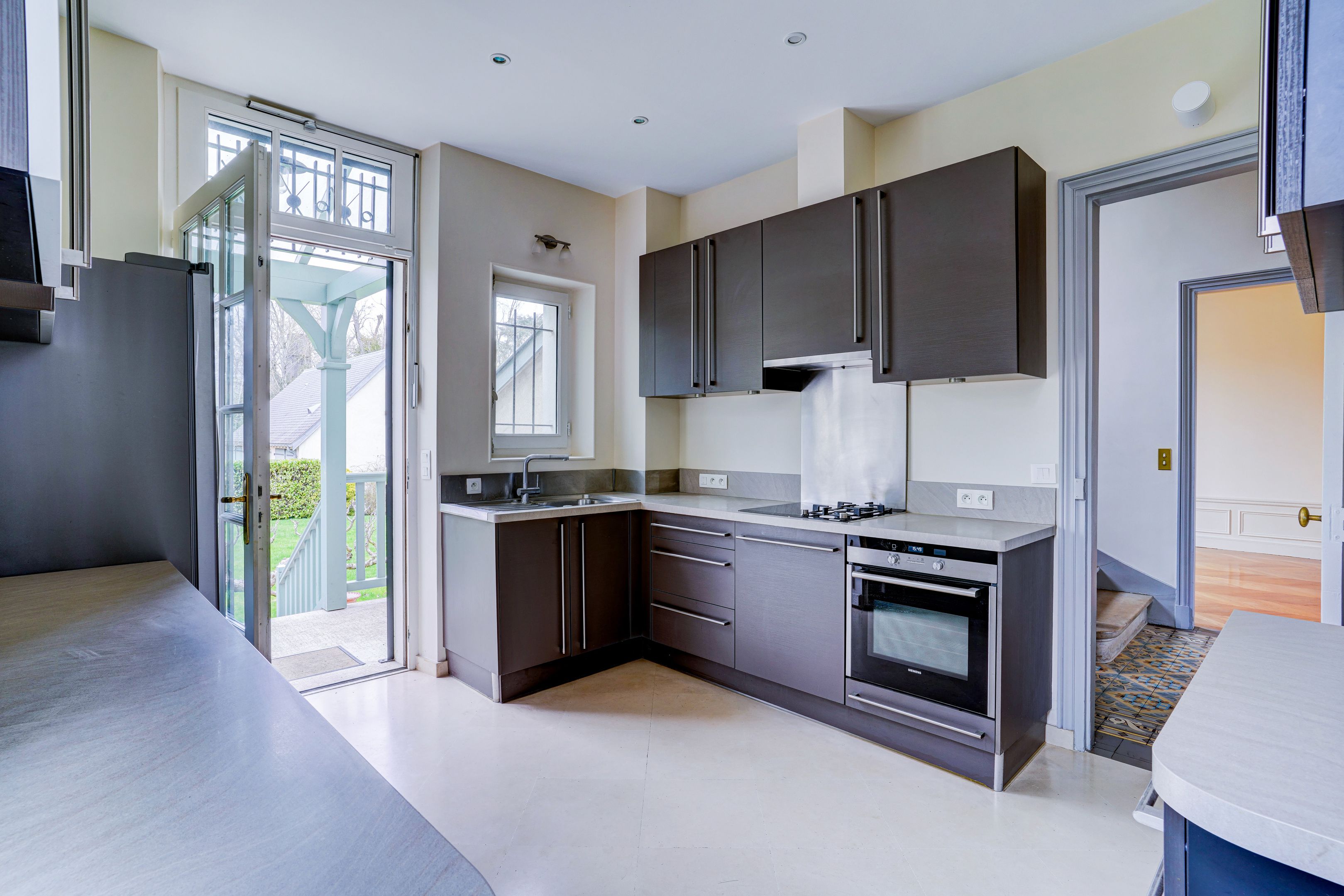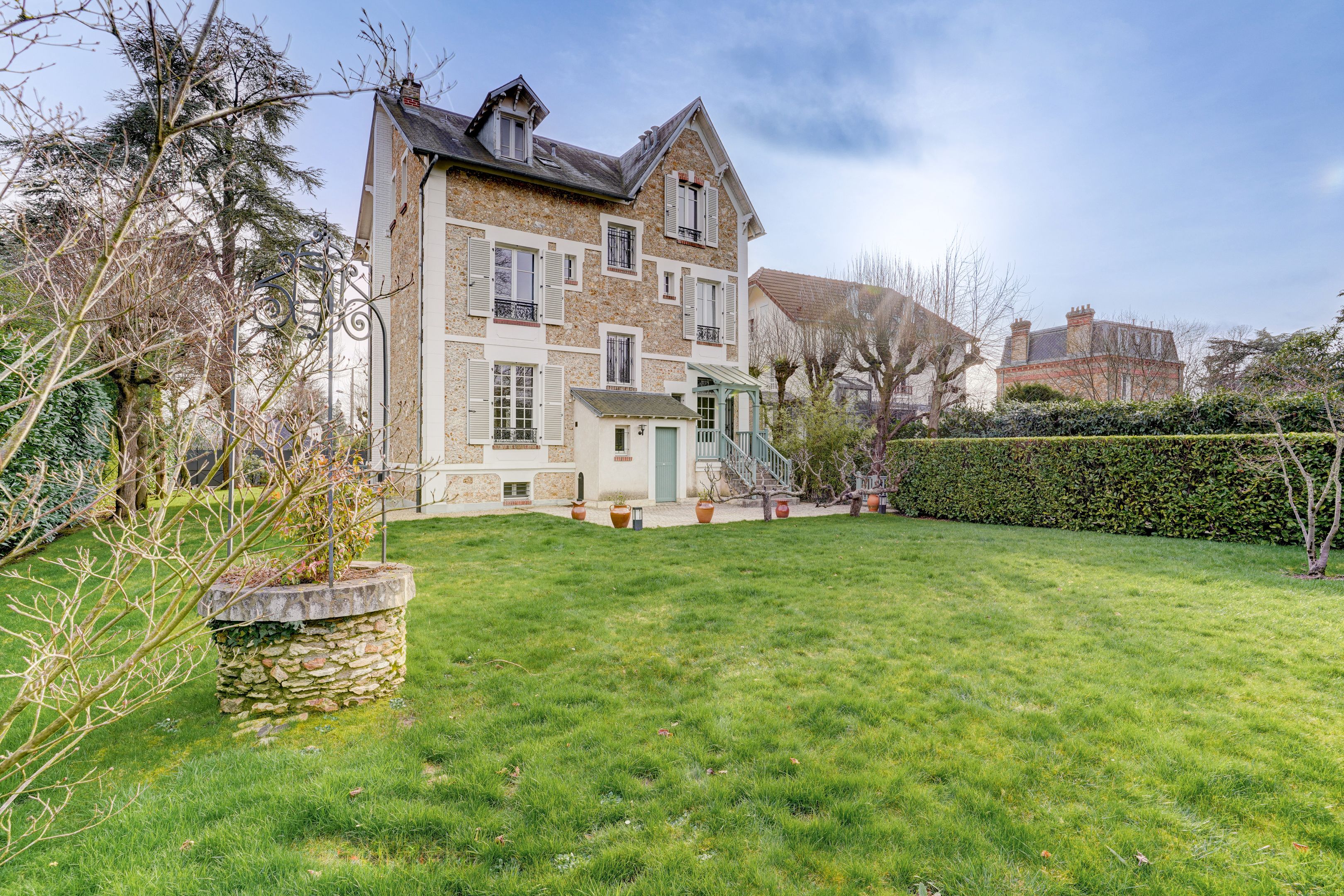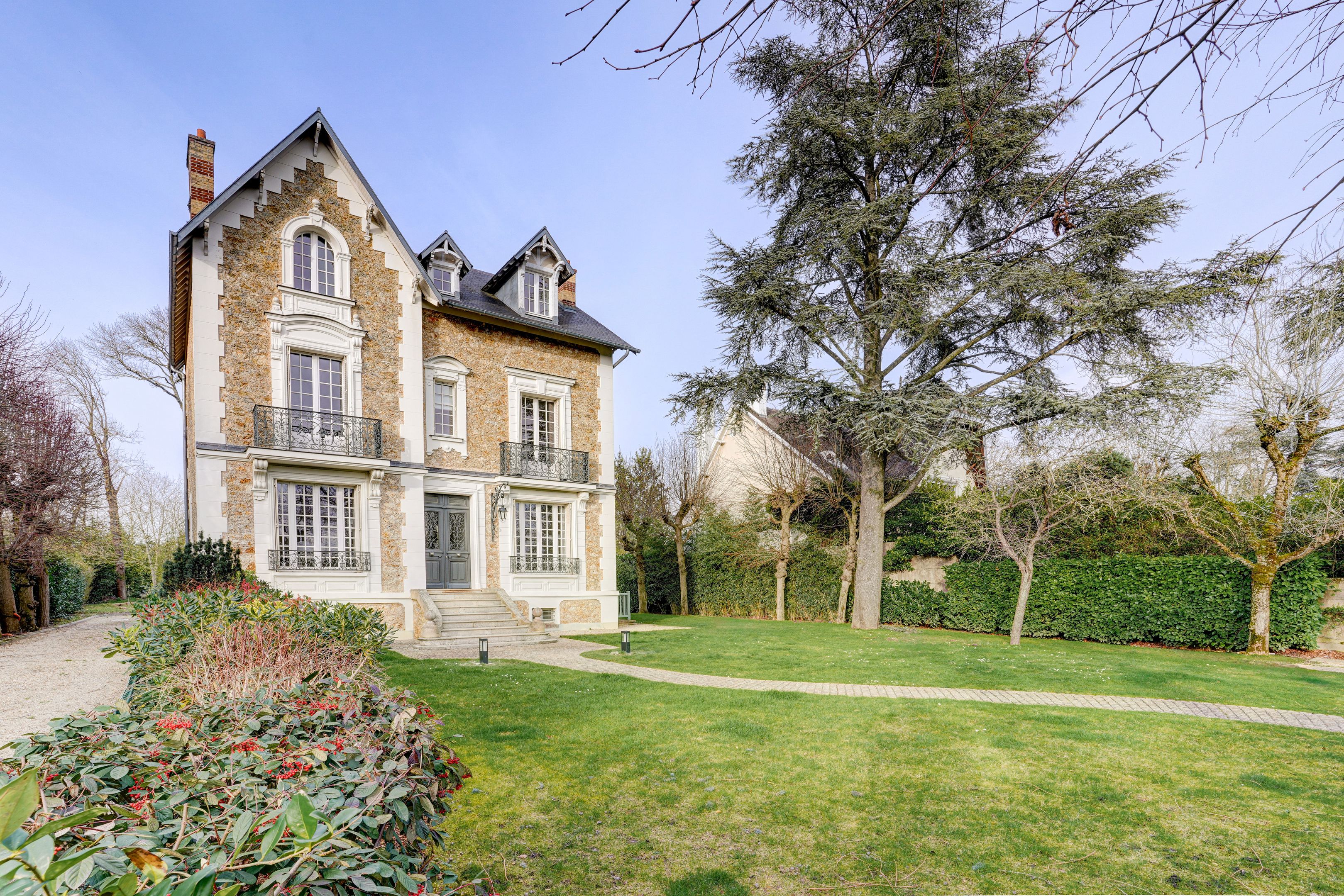 Vaucresson à proximité du centre ville, une superbe demeure ancienne parfaitement entretenue de 250 m2 édifiée sur une parcelle arborée de 1000 m2. En rez-de-chaussée une entrée dessert une double réception traversante lumineuse, une salle à manger et une cuisine équipée avec un accès direct au jardin. Au premier étage un palier distribue une suite parentale comprenant dressing, salle de bains/ douche, une chambre avec salle d'eau et une troisième chambre. Au second niveau quatre chambres dont une avec une salle d'eau et une salle de bains/douche indépendante. En sous sol une pièce de rangement, une buanderie, une chaufferie, et une cave à vin voutée. Un parking dans la propriété agrémente cet ensemble. Contrat d'entretien du jardin compris dans les charges. Arrosage automatique, maison sécurisée avec alarme, et éclairage dans le jardin. Vous serez séduits par les prestations de grande qualité, le calme des lieux et les vues dégagées, sans vis à vis.